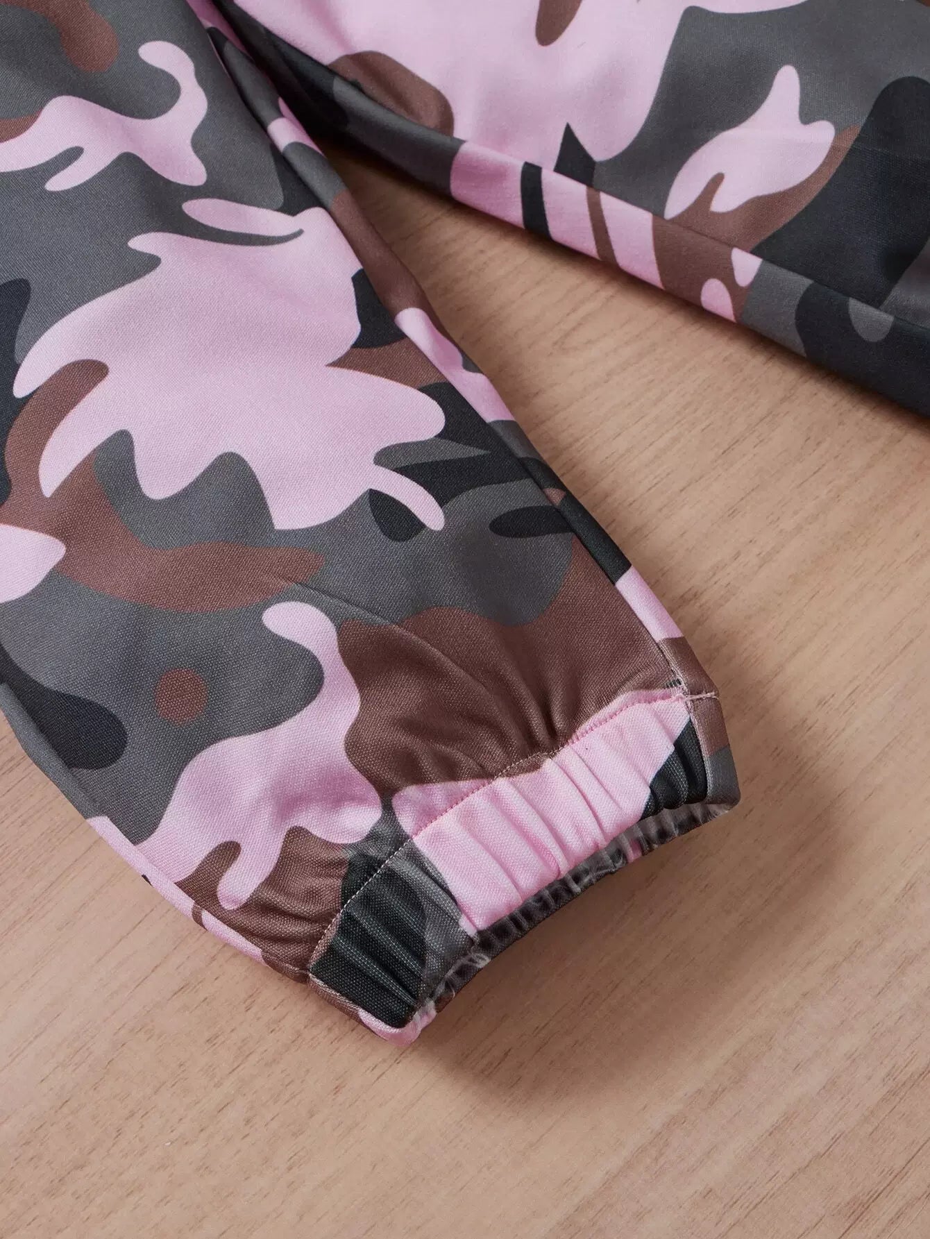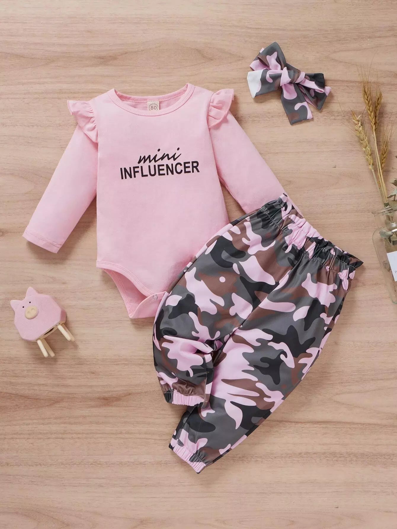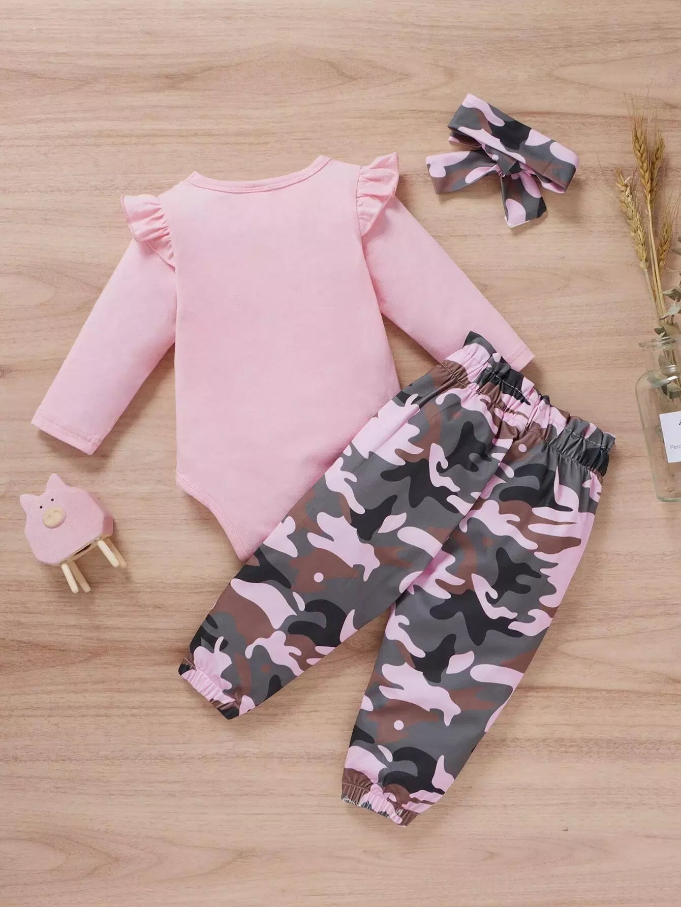 Baby Girl Letter Graphic Bodysuit & Camo Sweatpants & Headband