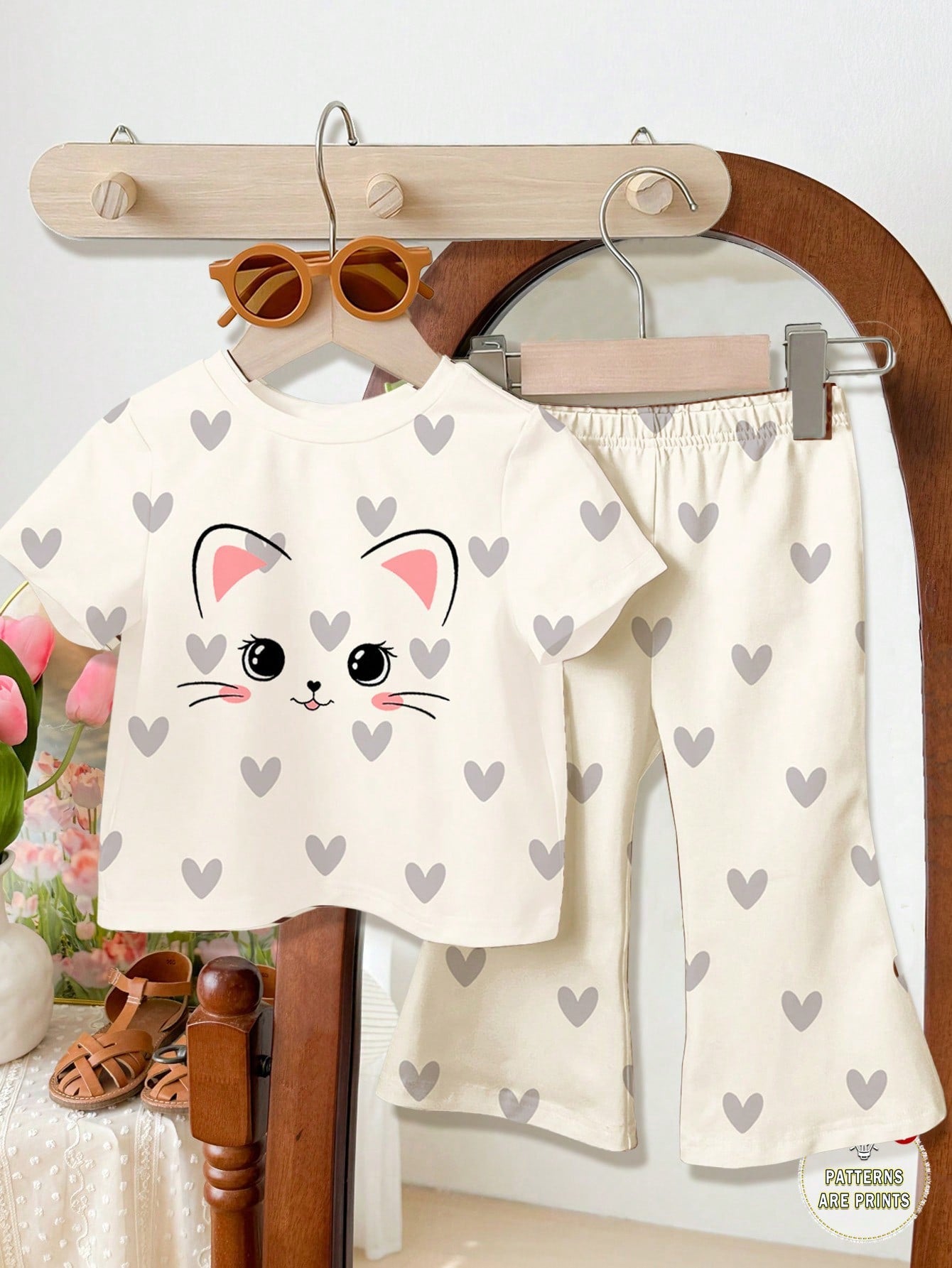 Cute Cat & Heart Pattern, Cream White, Baby Girl Casual Minimalist Short Sleeve Round Neck T-Shirt &