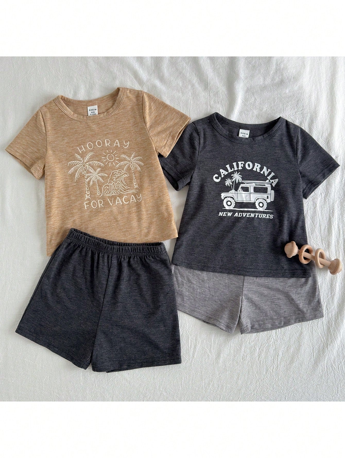 Loomiva 4pcs Baby Boy Set: Cartoon Animal Print Soft Knit Crew Neck Short Sleeve Pullover Top & Elastic