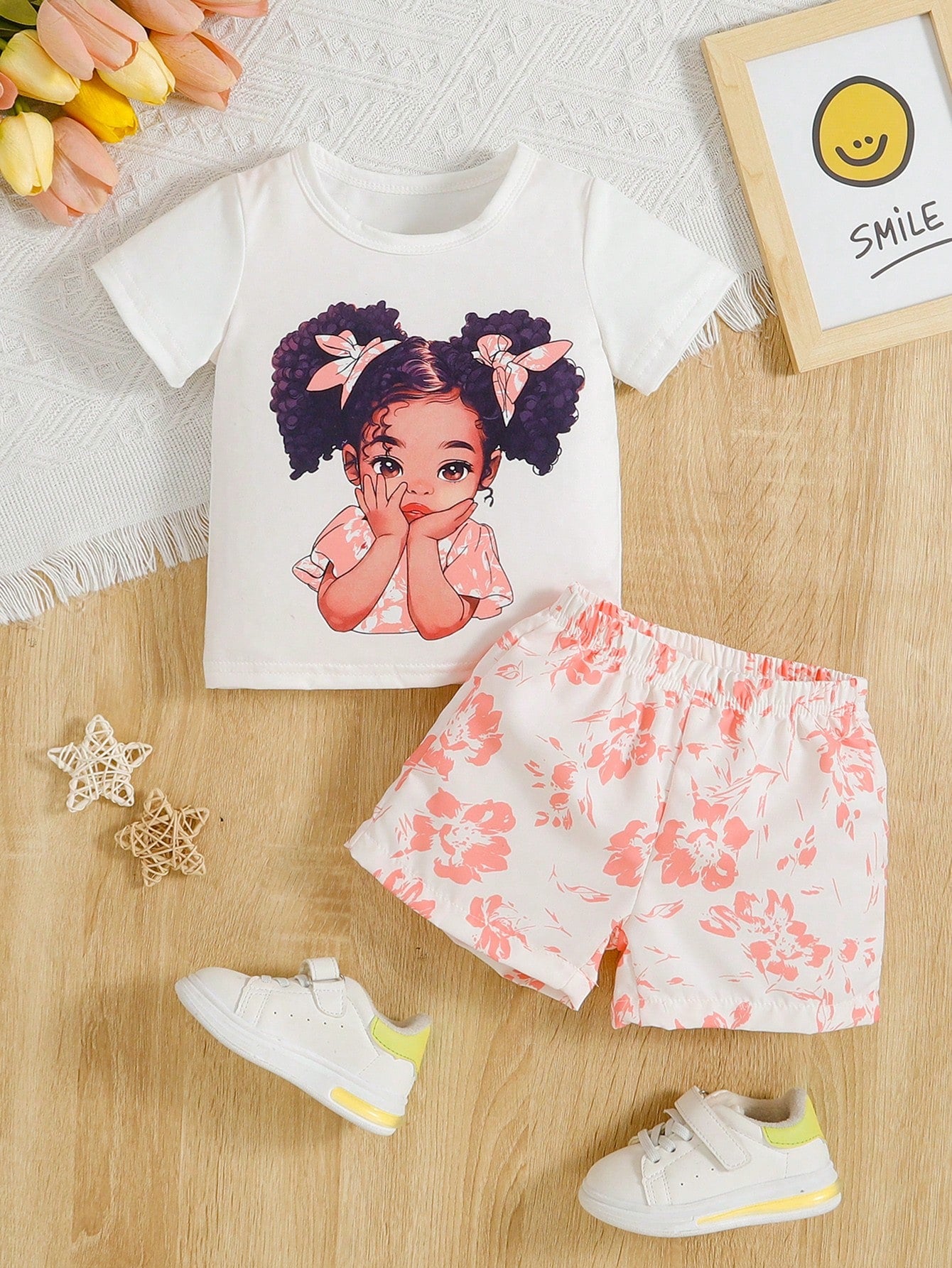 New Arrival Baby Girls' Cute Casual Cartoon Printed Short Sleeve Top And Ditsy Floral Shorts Set