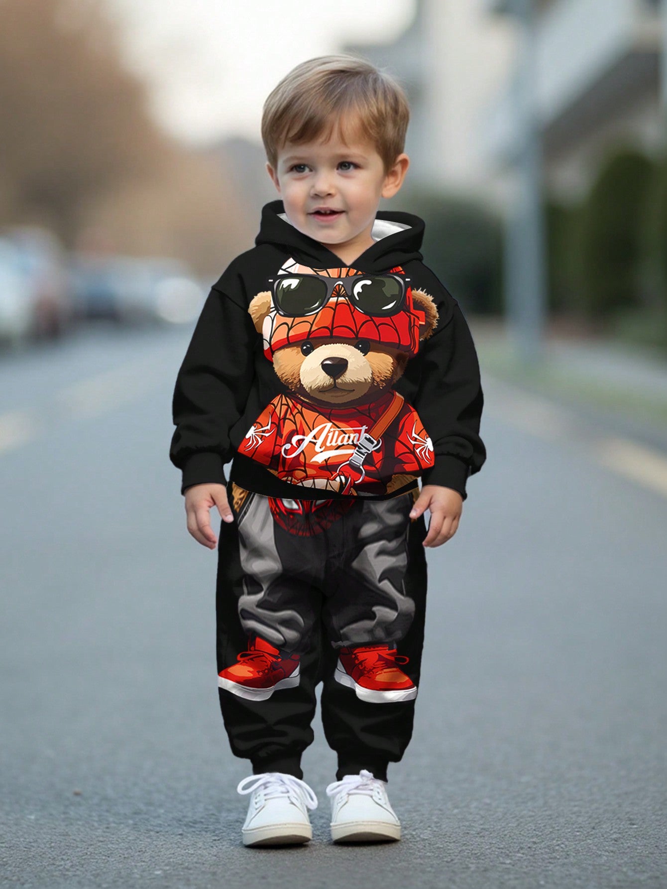 Toddler Boy Cartoon Bear Pattern Loose Knit Soft Hoodie Sweatshirt And Pants Set, Casual Outfit Suitable