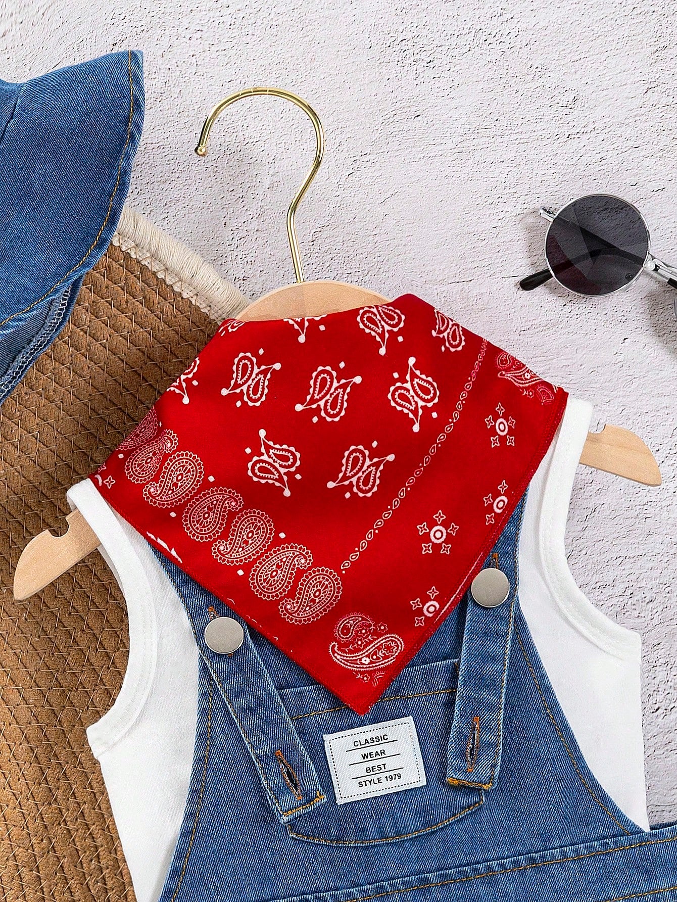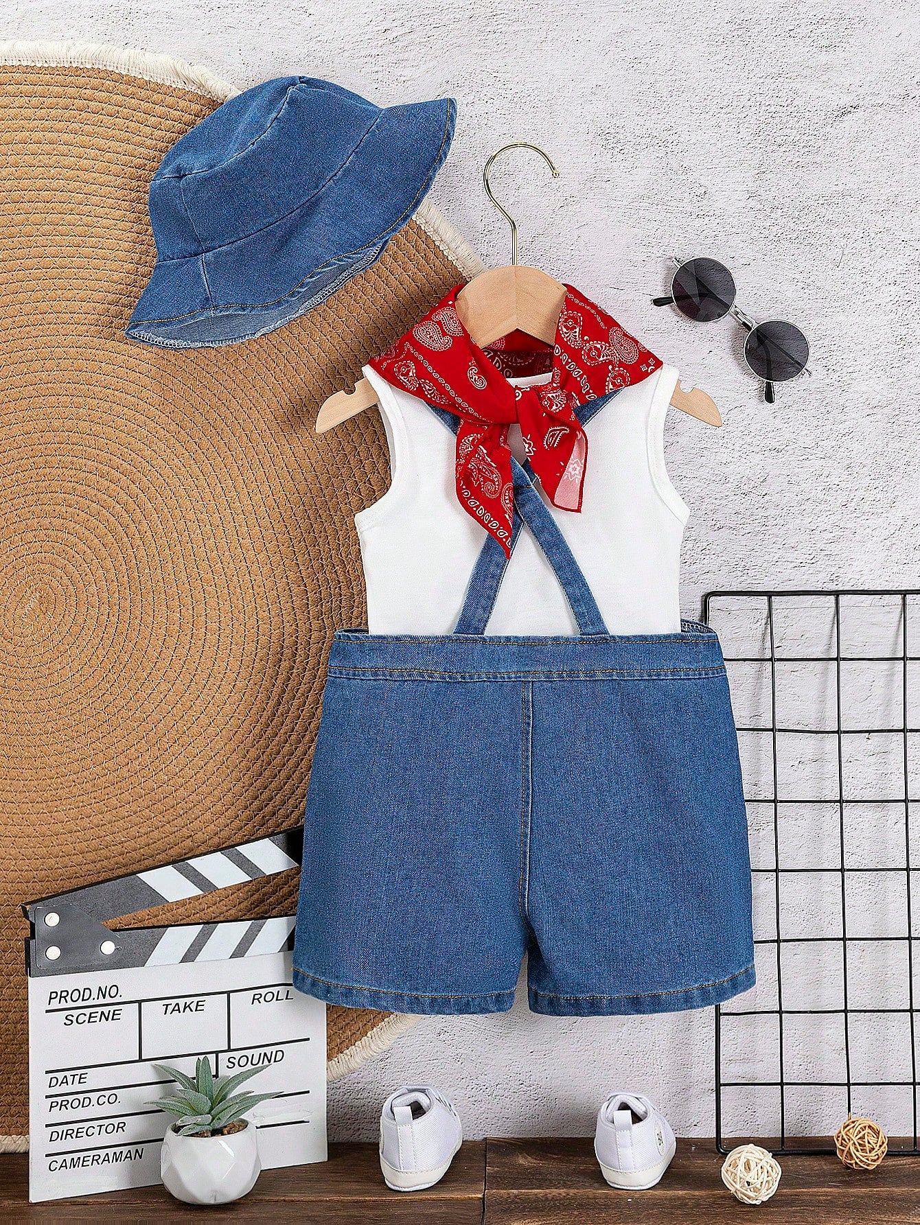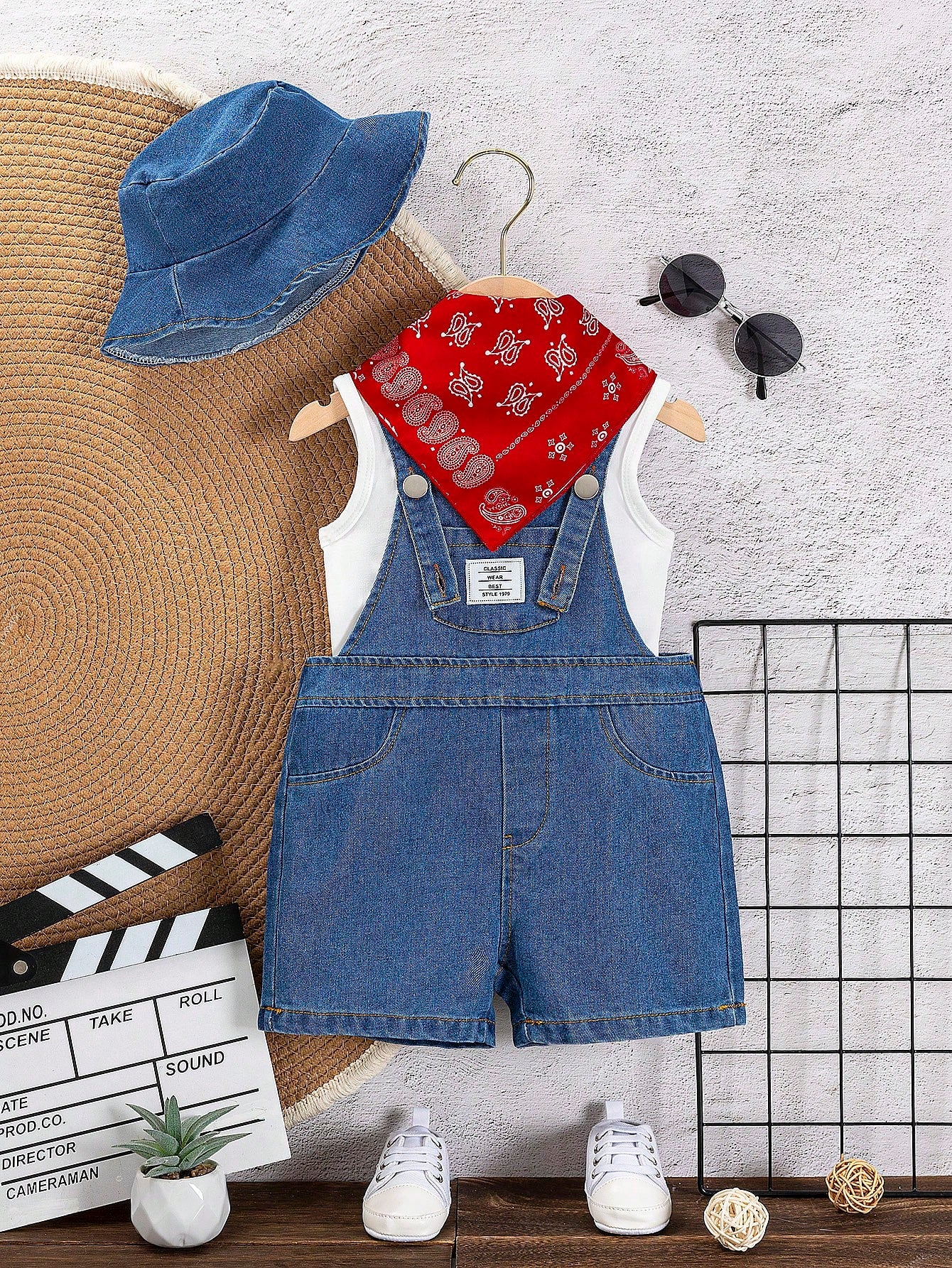 Baby Boy 4pcs/Set Light Wash Denim Overalls Shorts And Tank Top, Denim Hat And Red Bandana Set For Spring/Summer