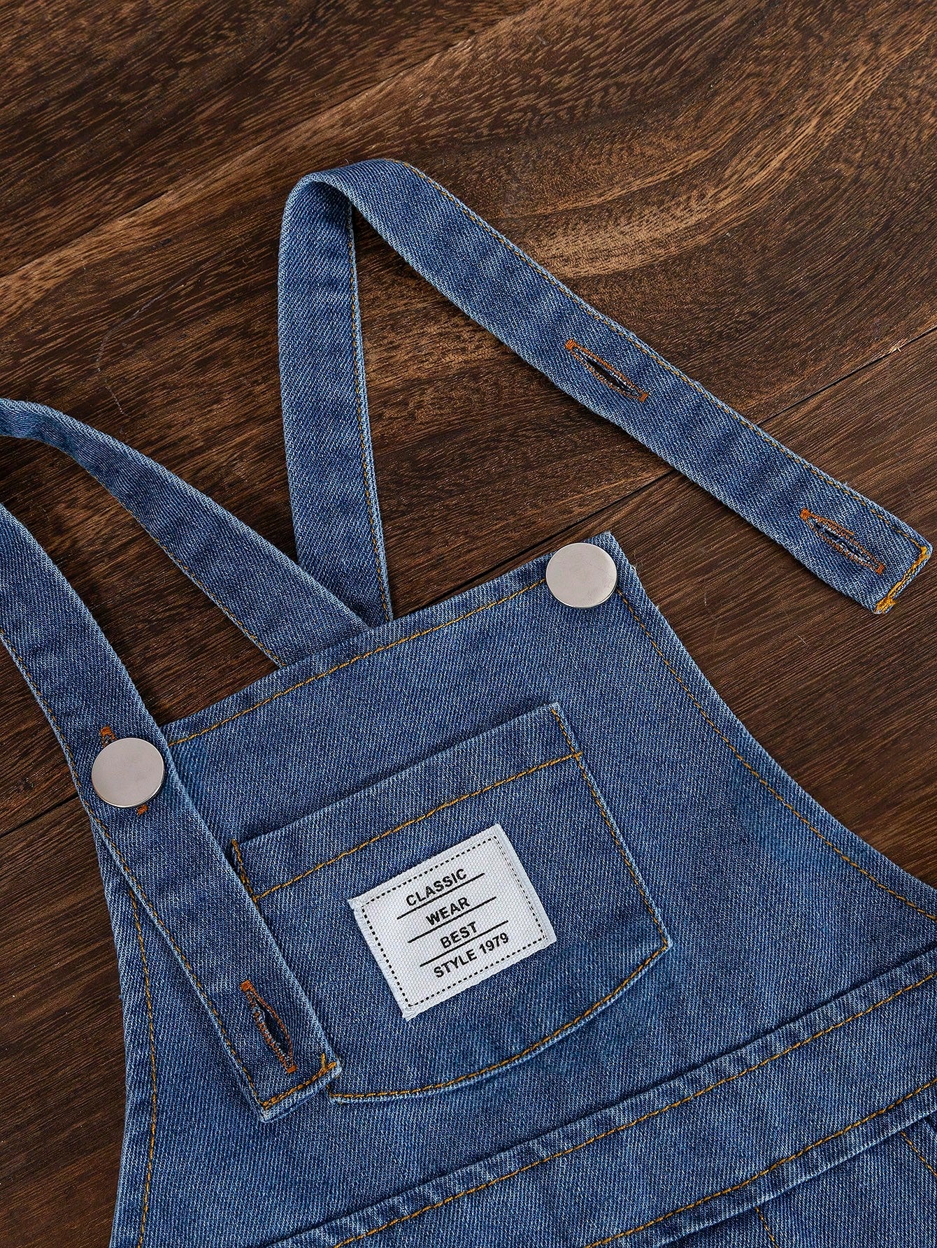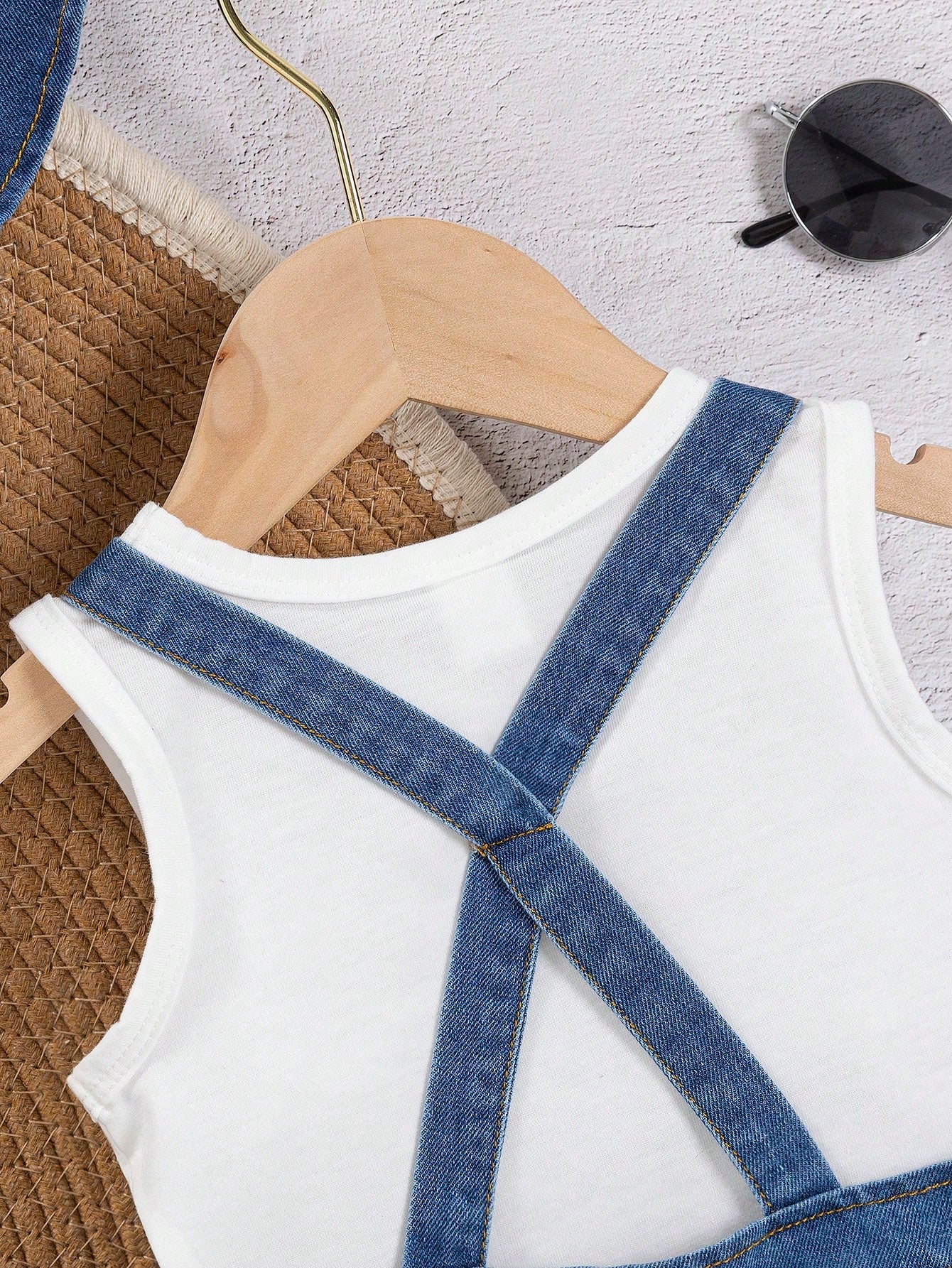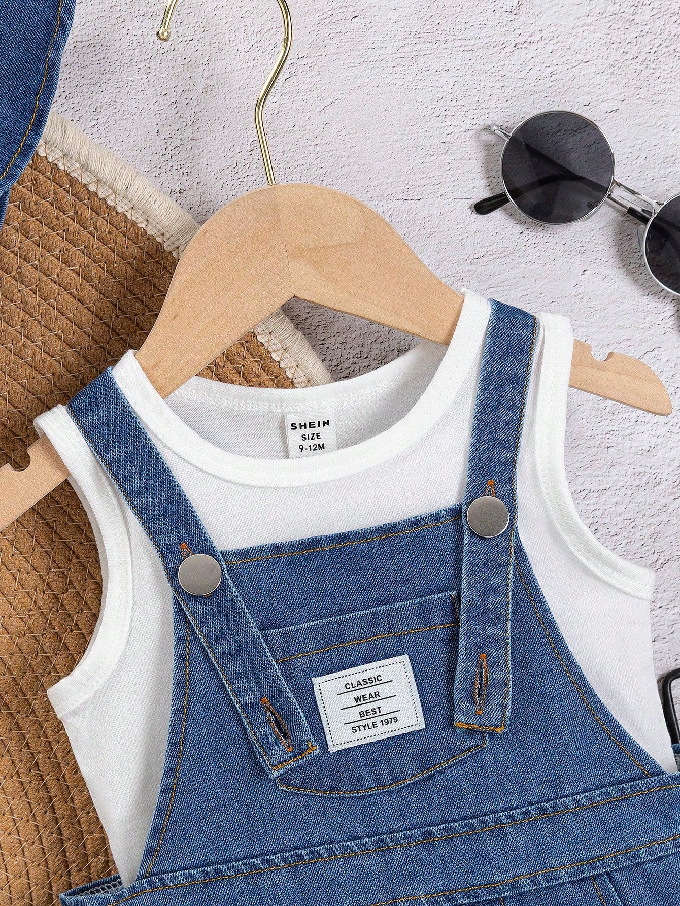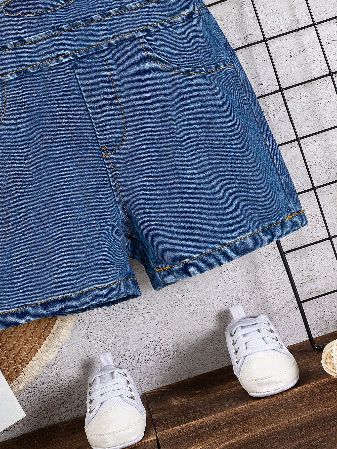 Baby Boy 4pcs/Set Light Wash Denim Overalls Shorts And Tank Top, Denim Hat And Red Bandana Set For Spring/Summer