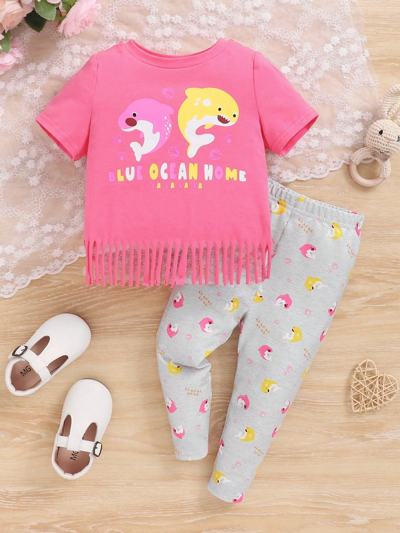 Baby Girl Casual Whale Patterned Fringe Short Sleeve Top And Tight Pants Set