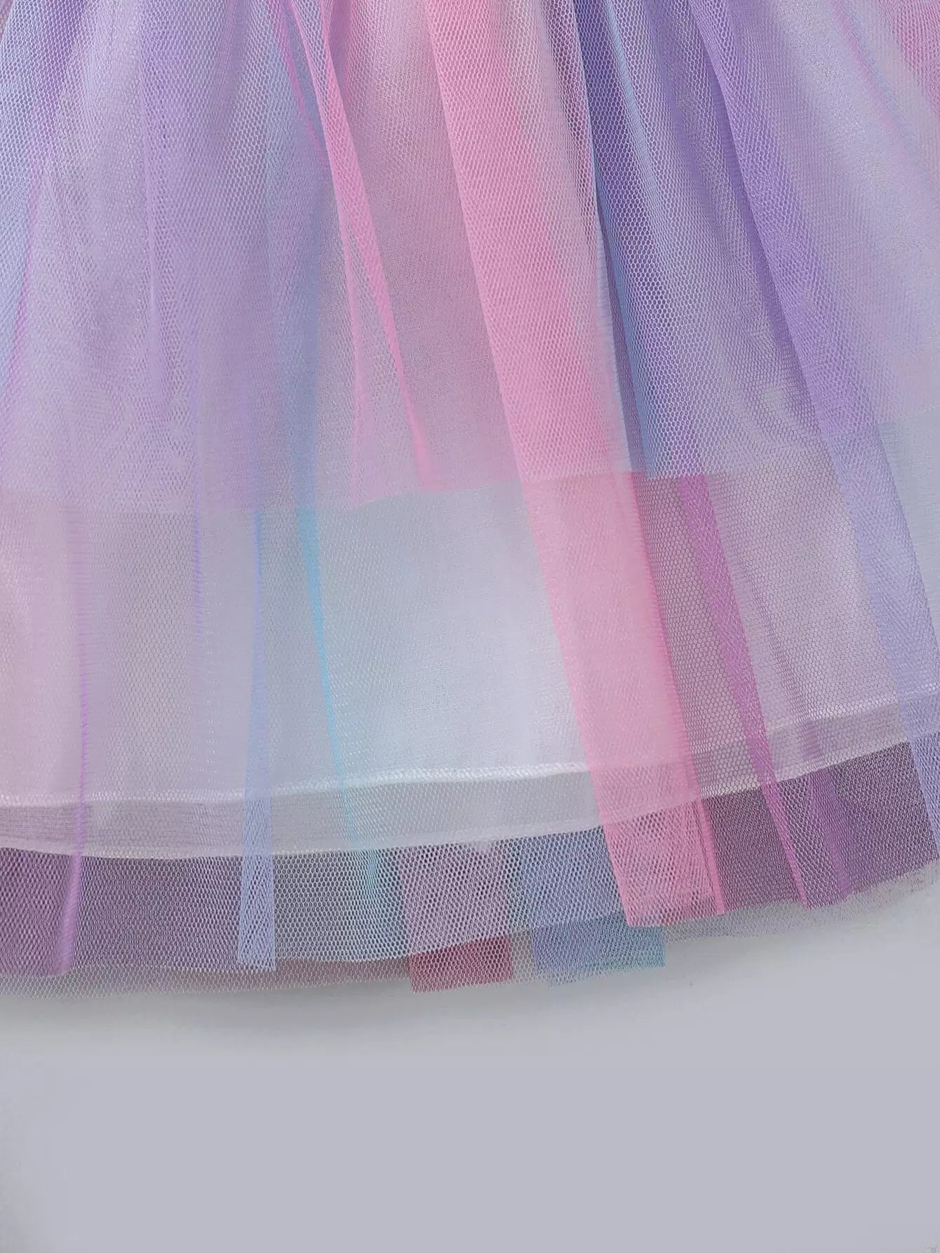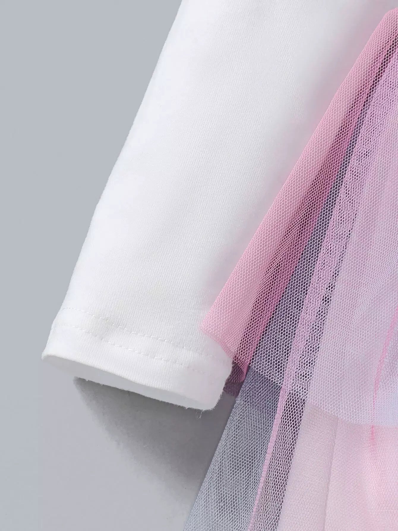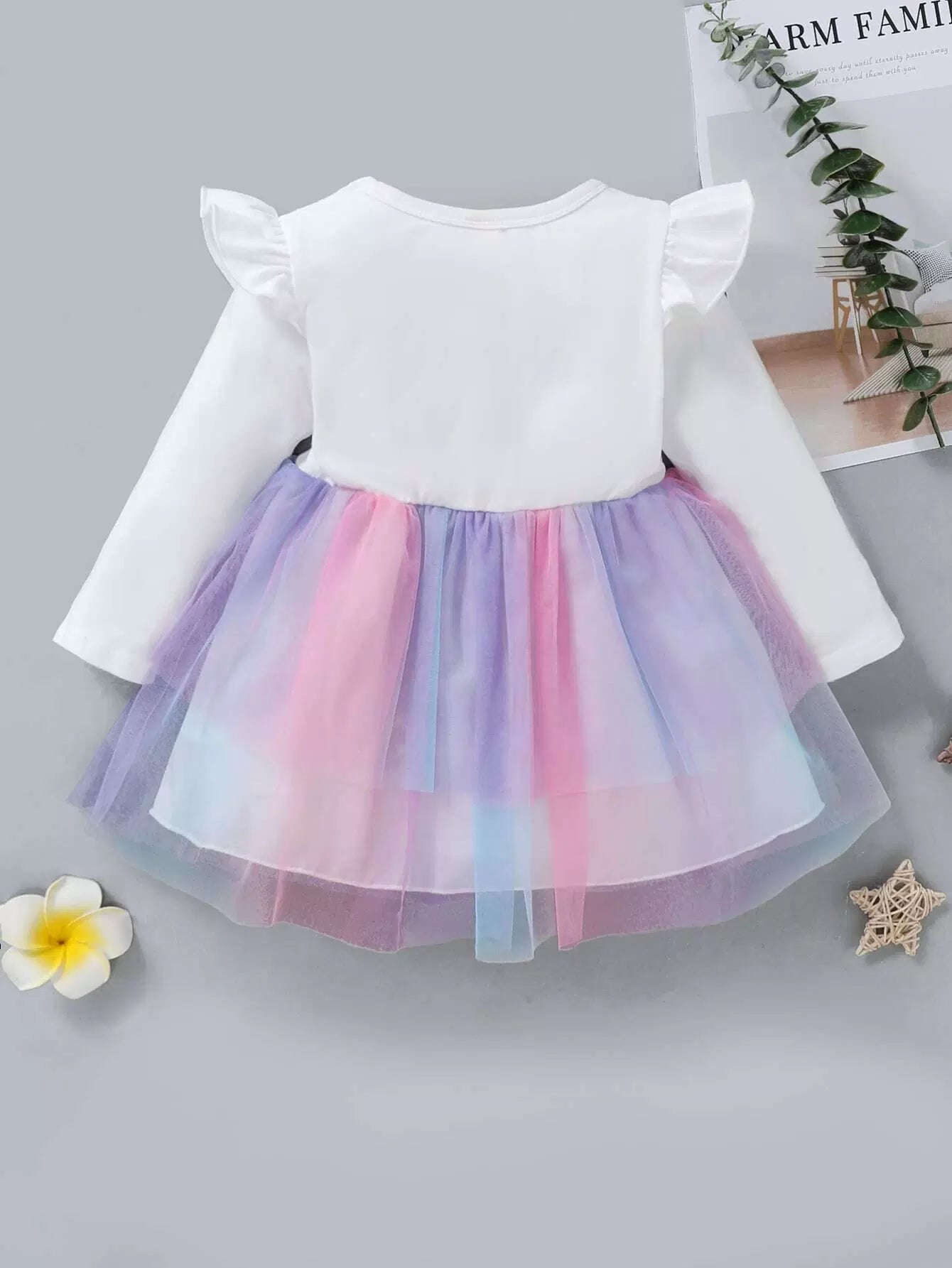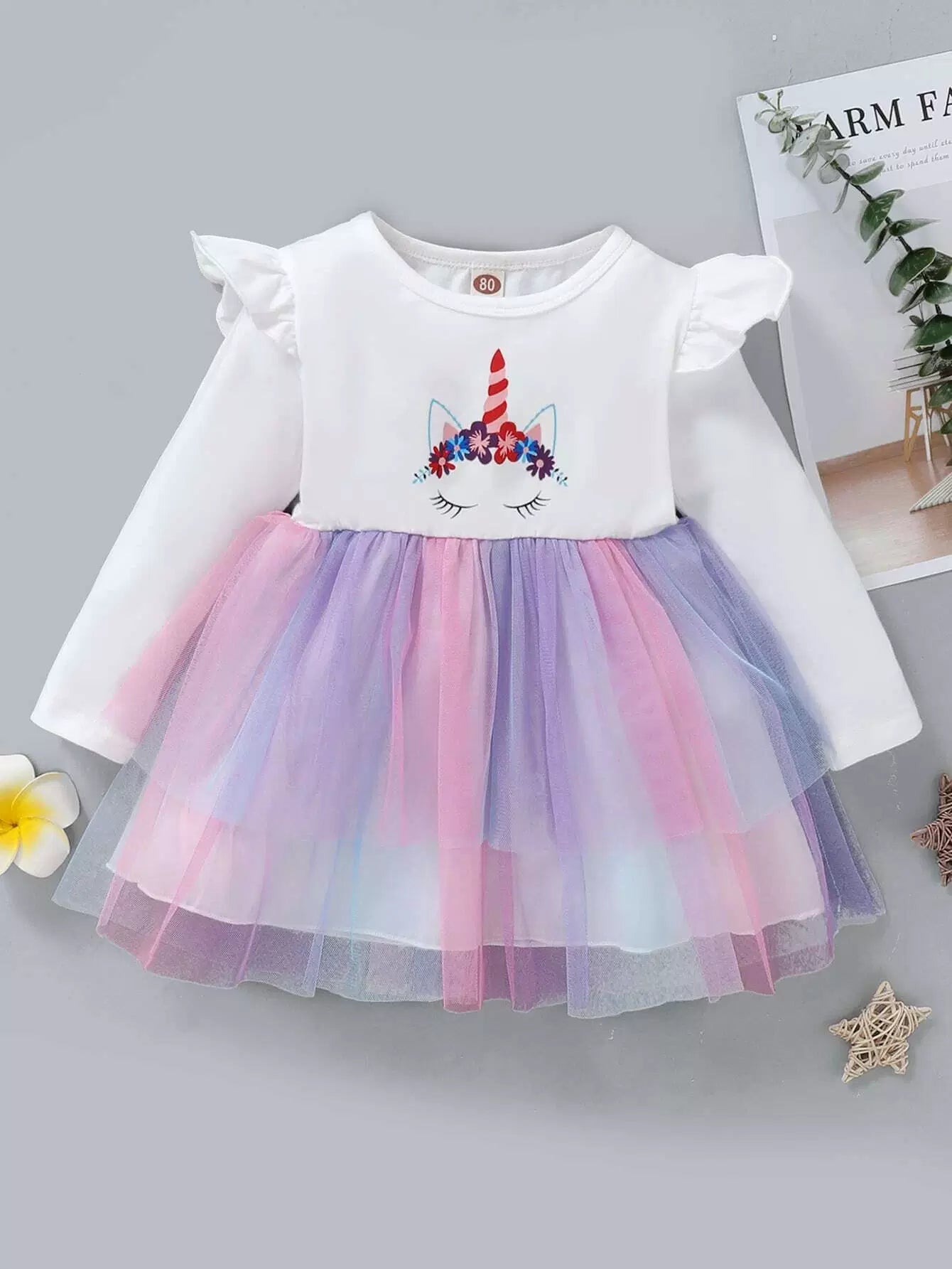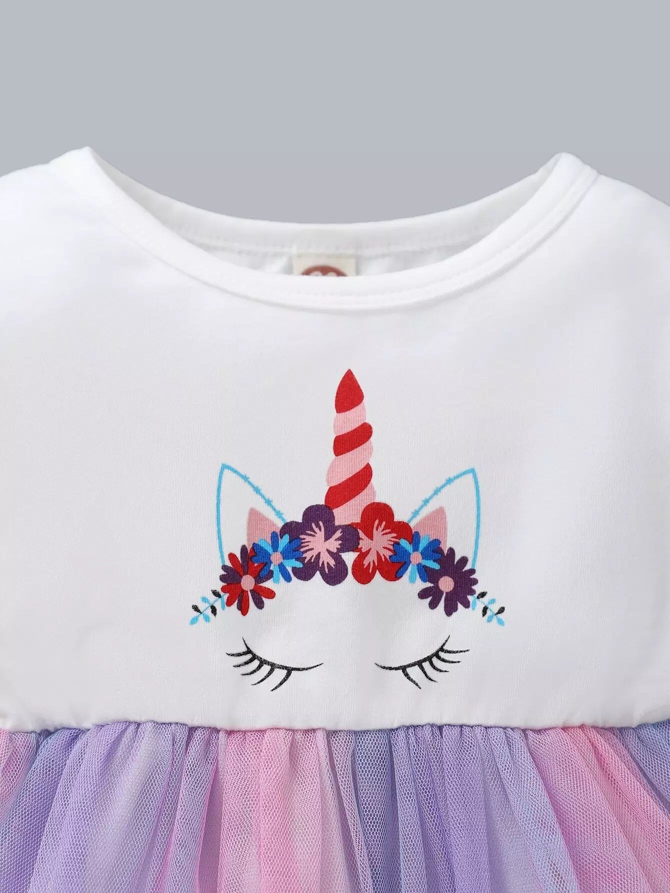 Baby Girl Unicorn Print Mesh Panel Ruffle Dress