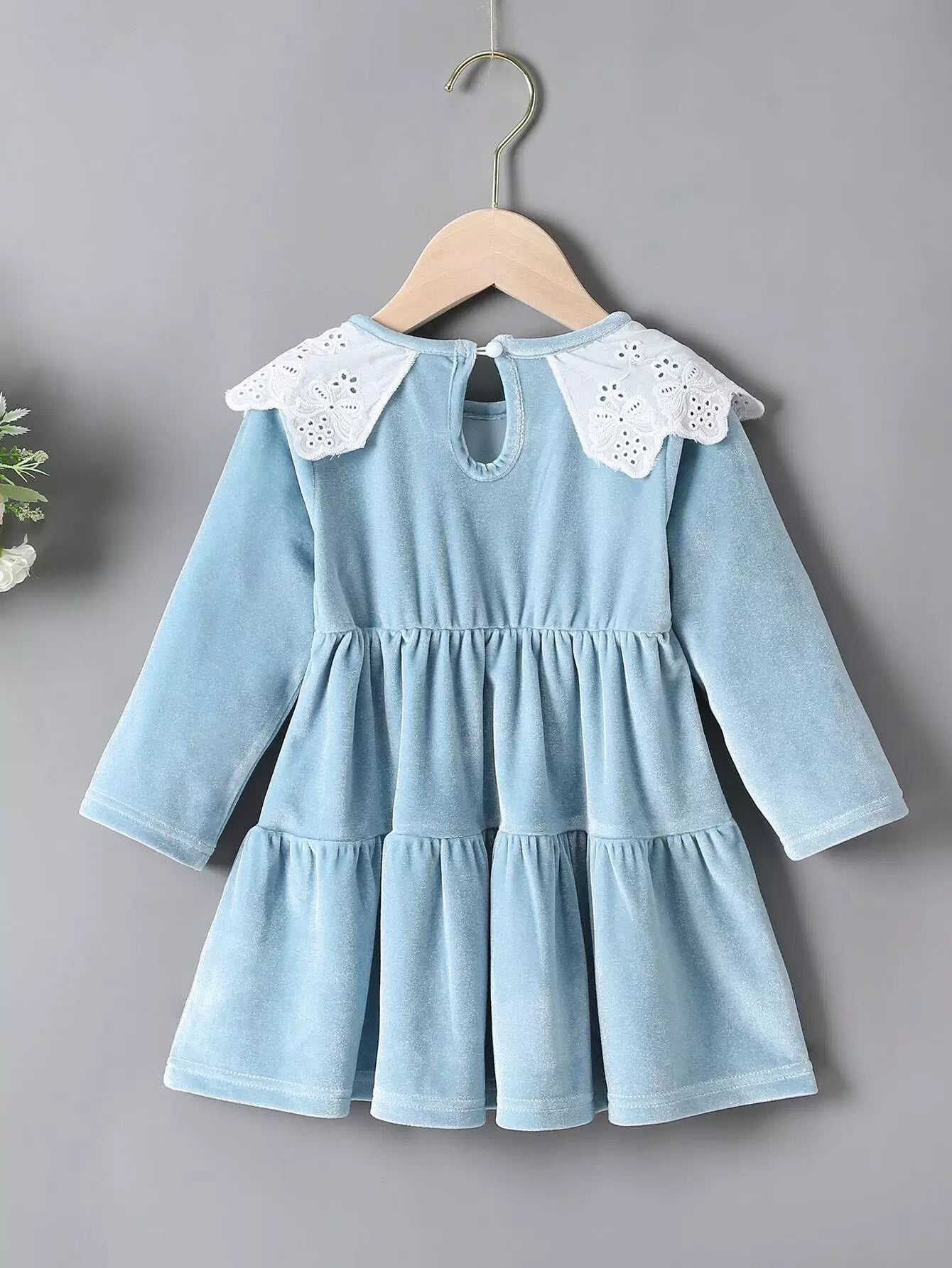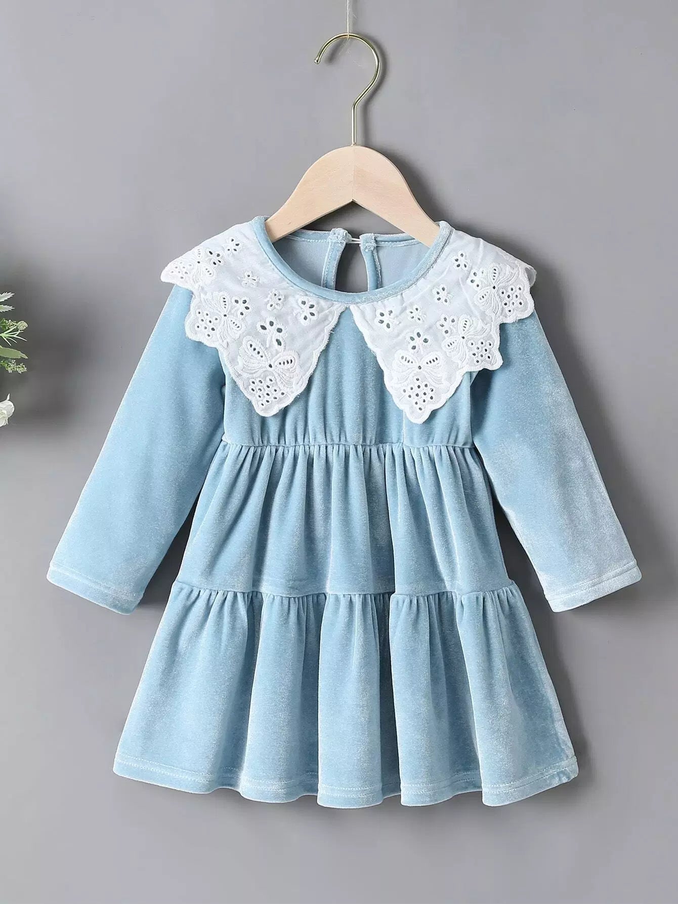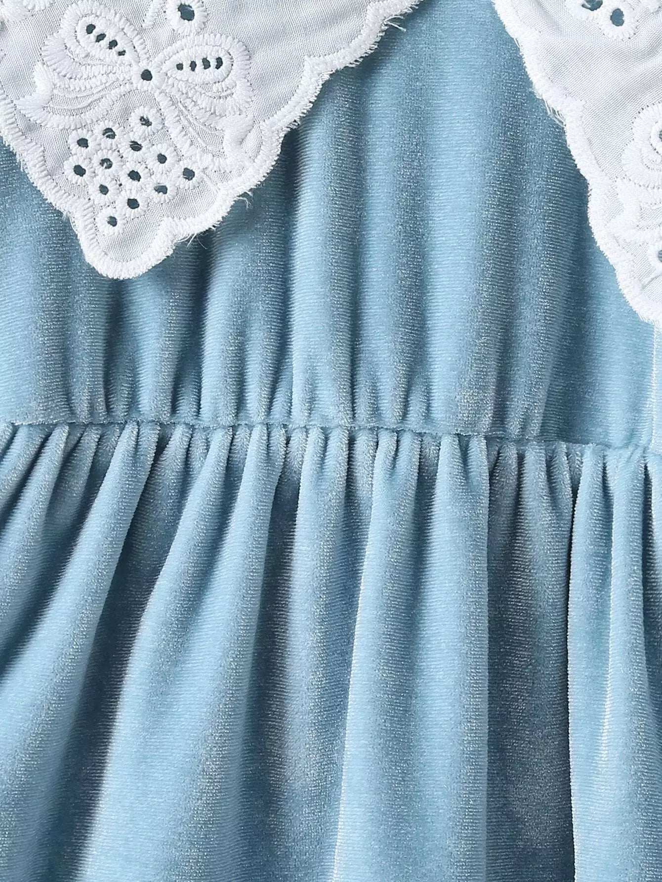 Baby Contrast Eyelet Embroidered Ruffle Hem Keyhole Back Velvet Dress