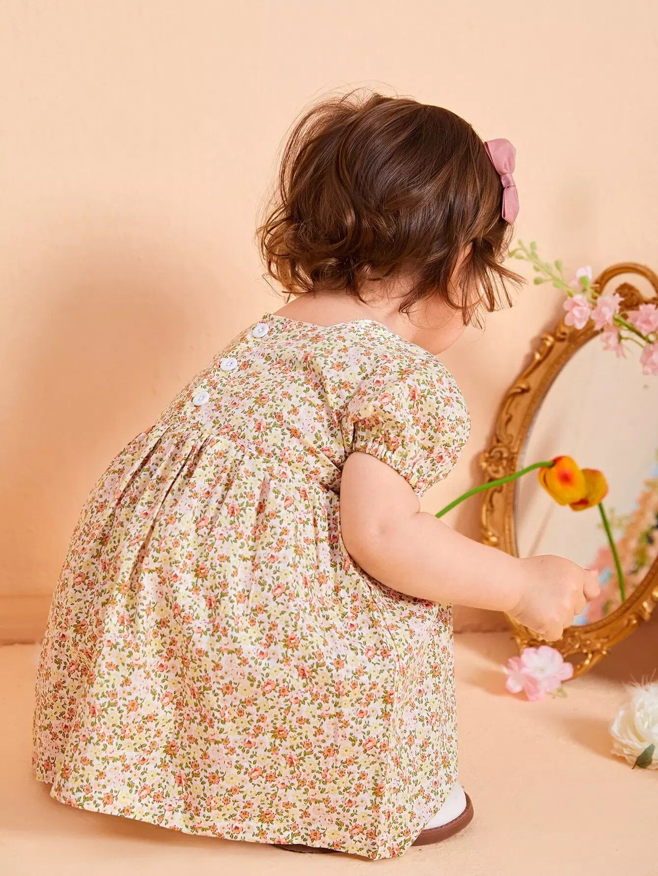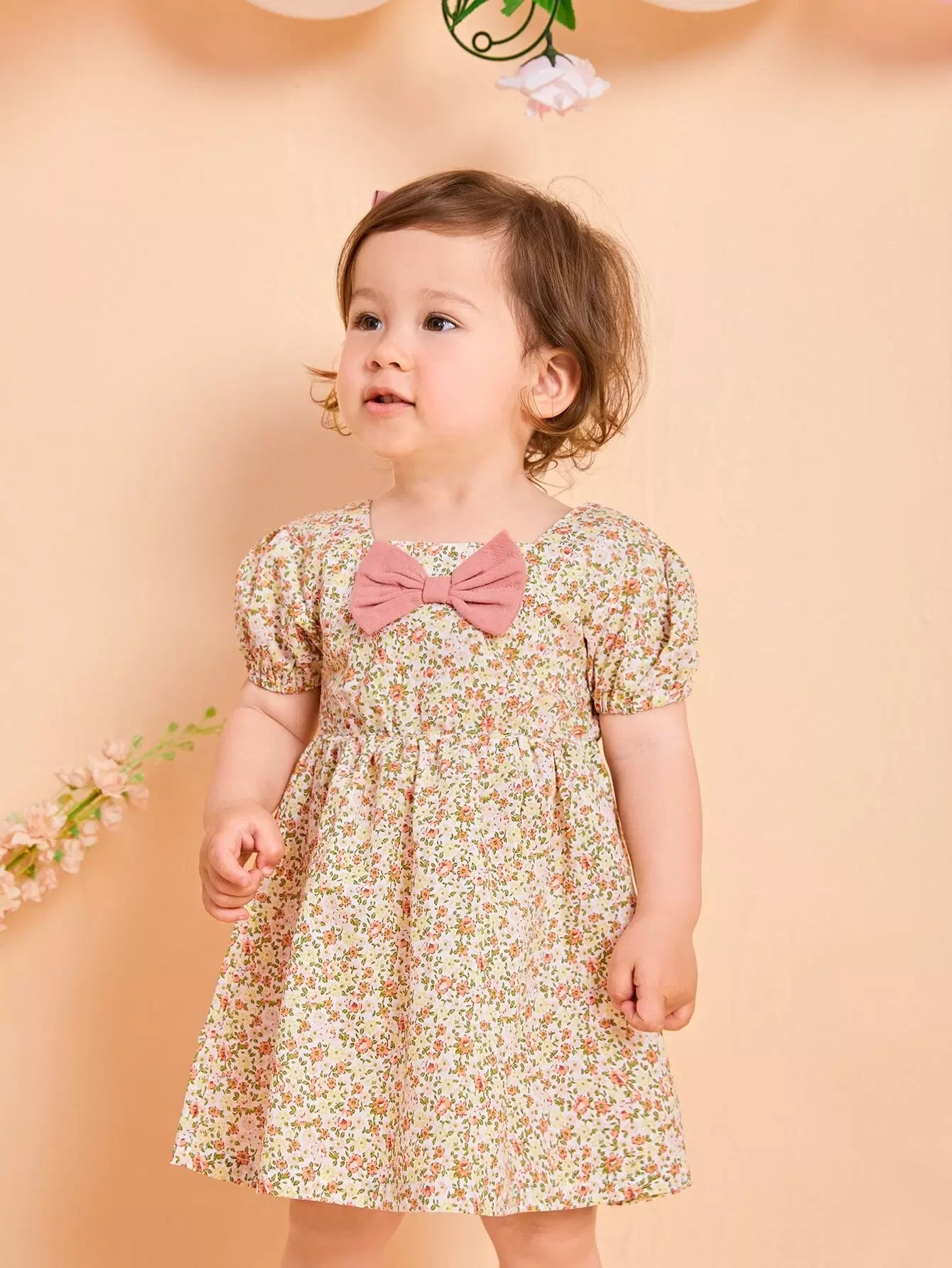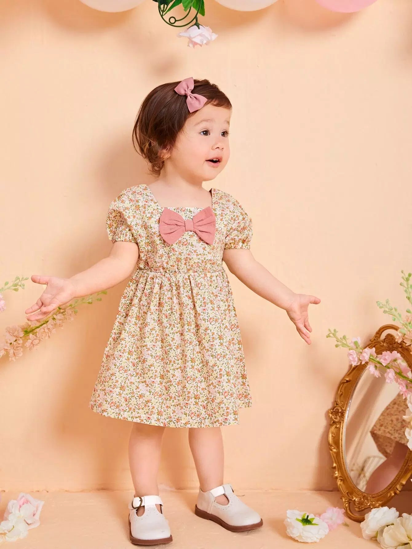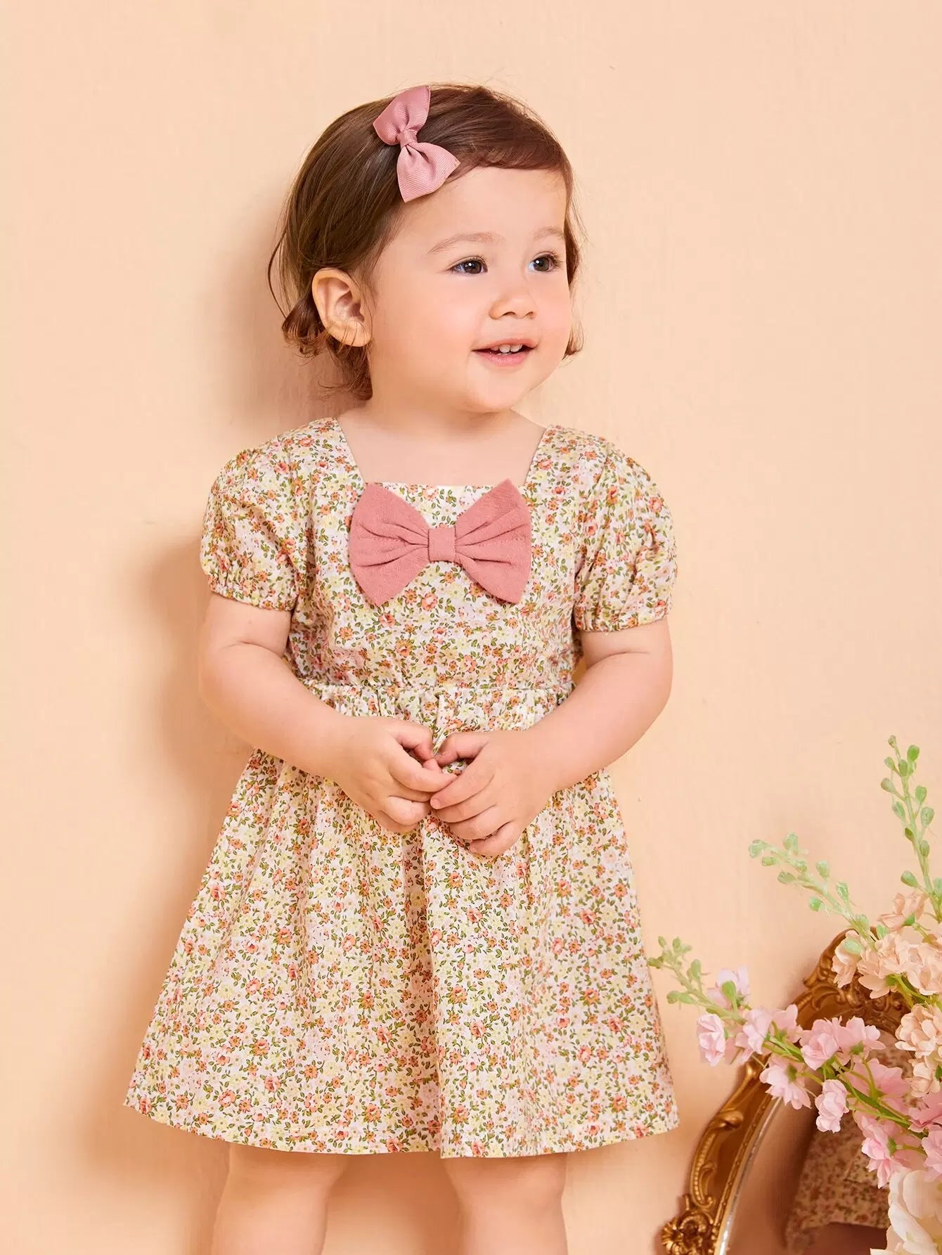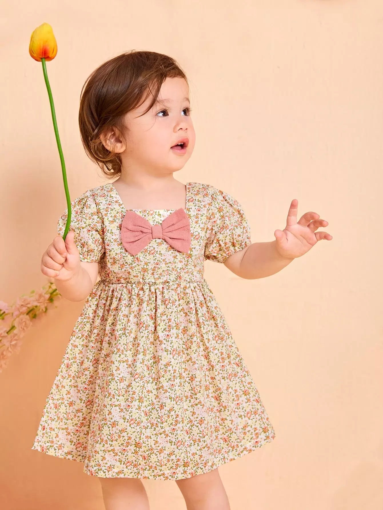 Baby Ditsy Floral Puff Sleeve Square Neck Bow Front Dress