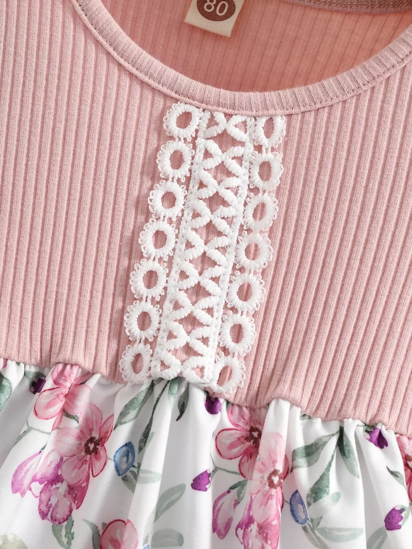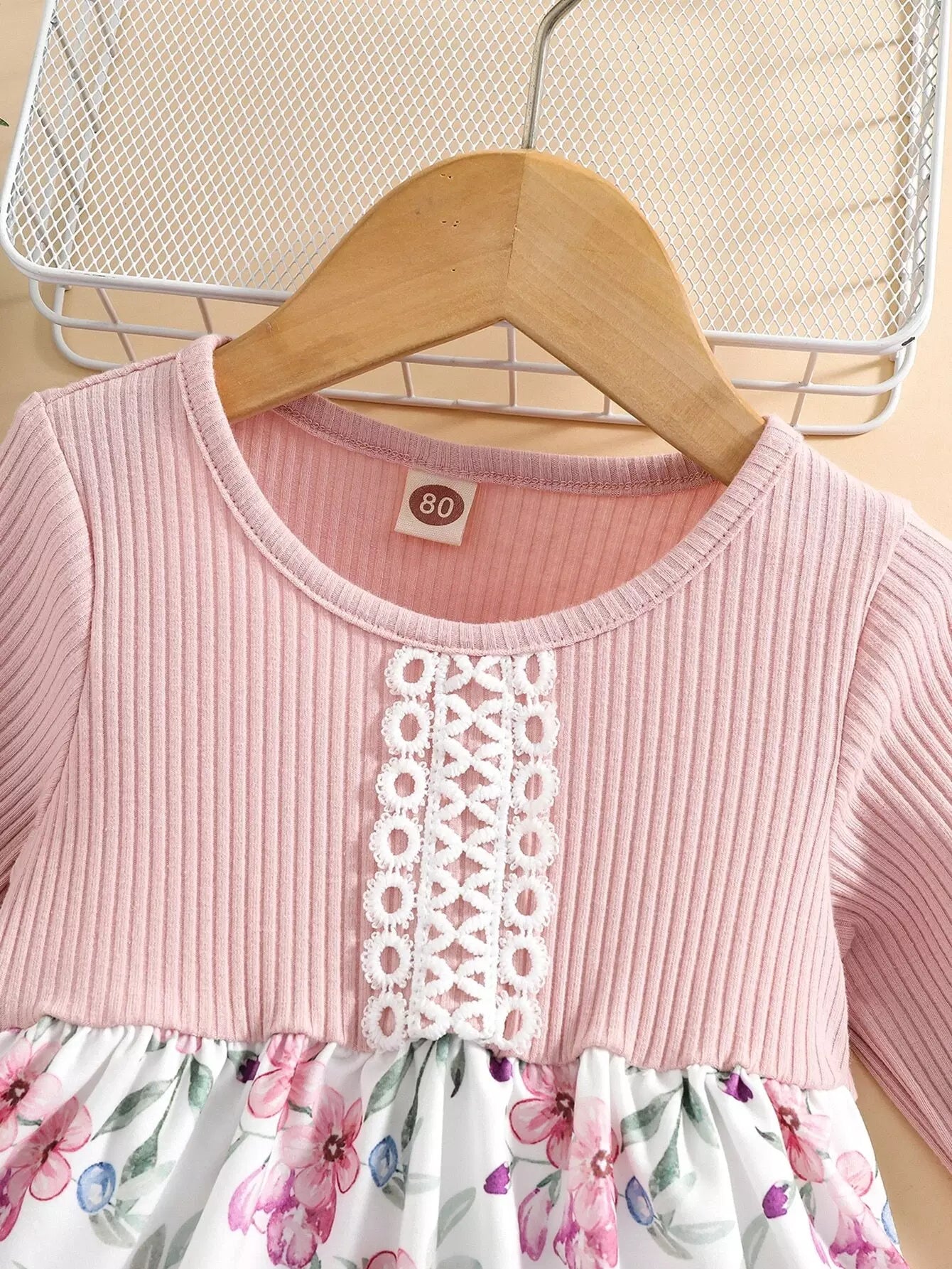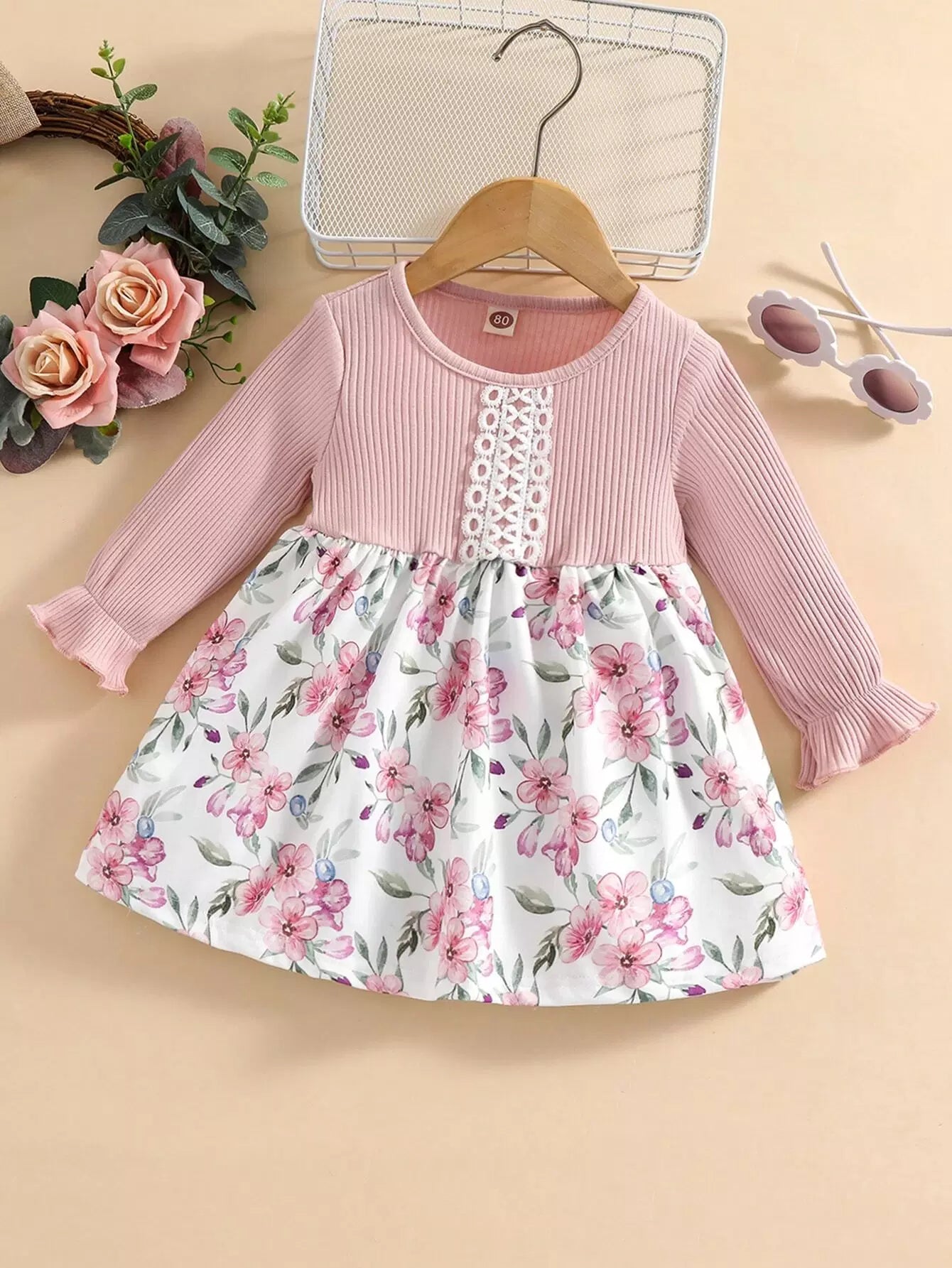 Baby Floral Print Guipure Lace Panel Flounce Sleeve Dress