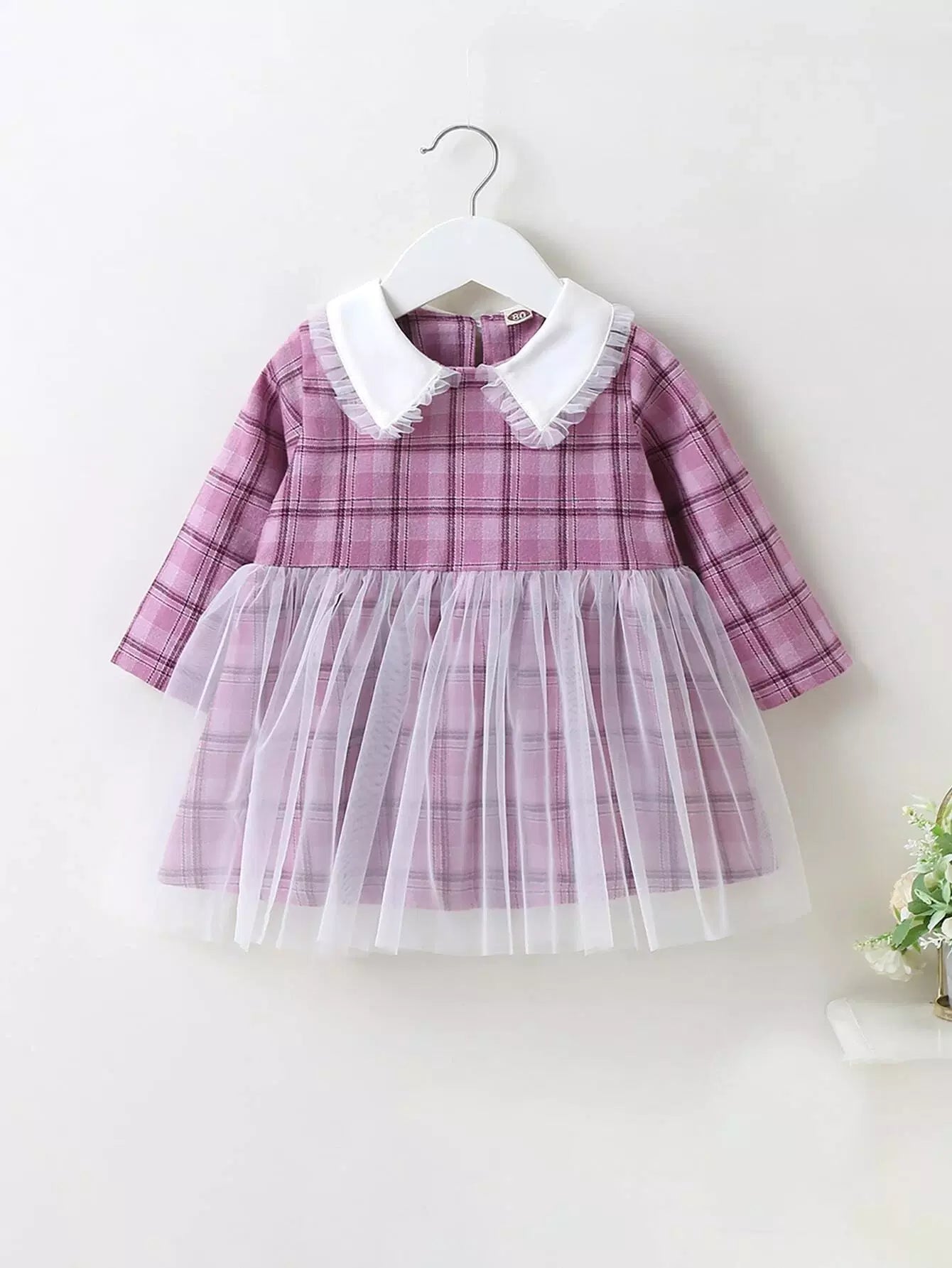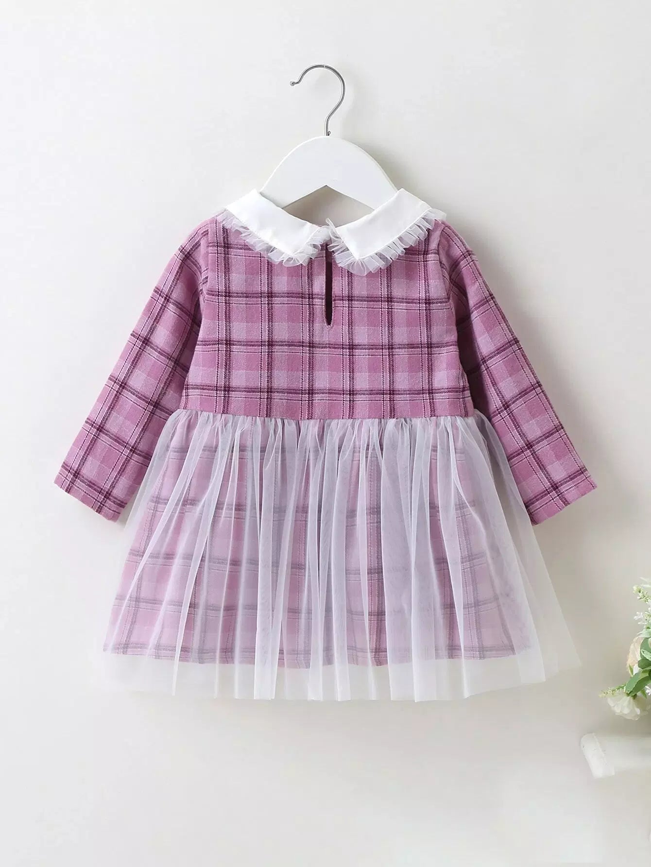 Baby Girl Peter Pan Collar Plaid Print Mesh Panel Smock Dress