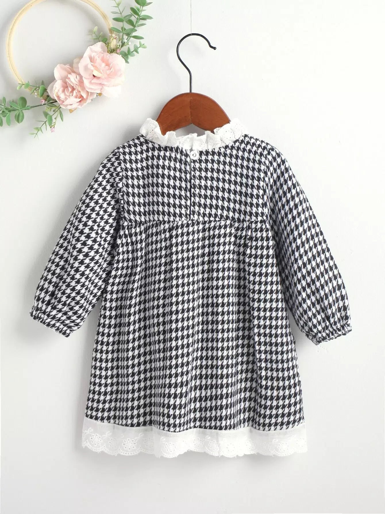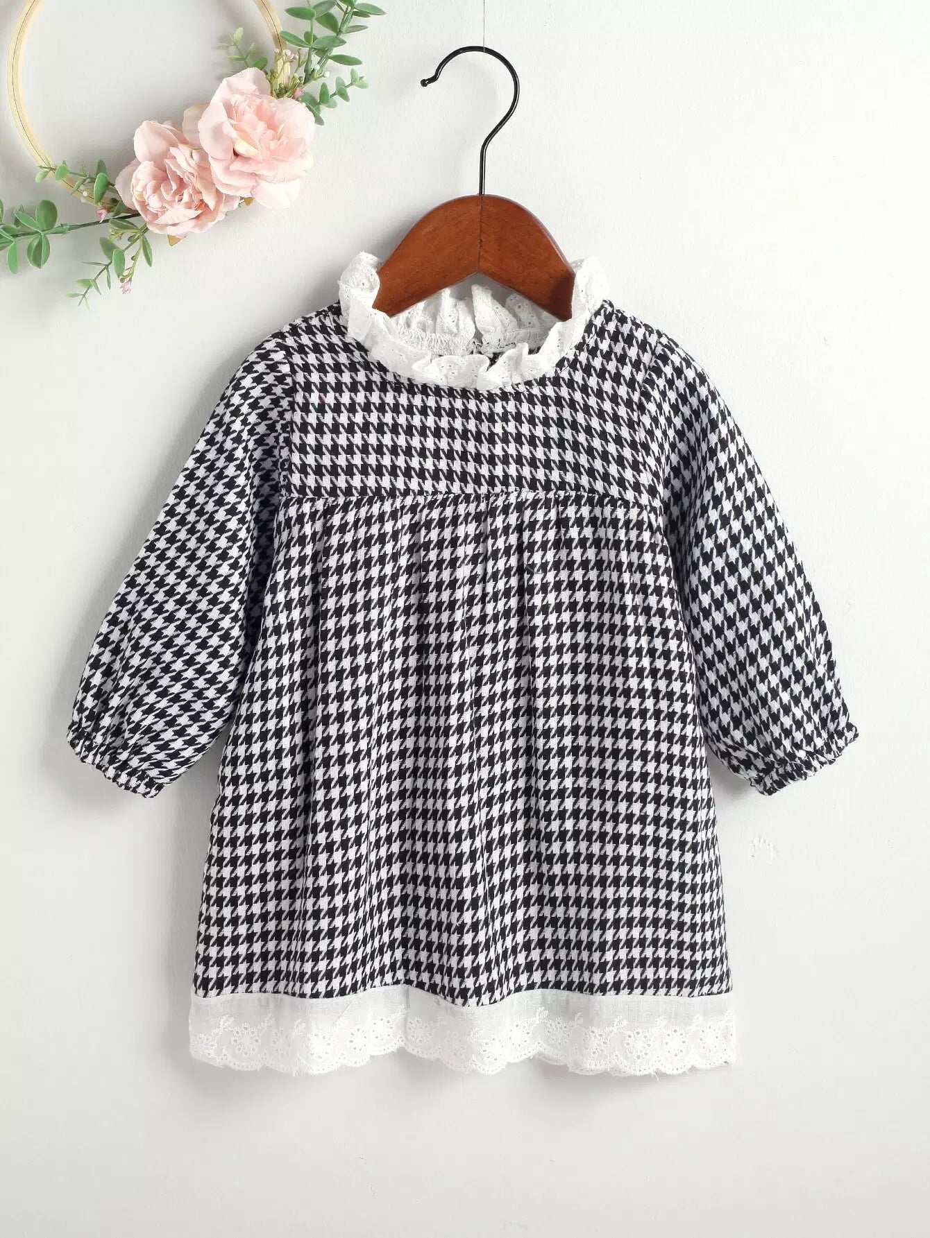 Baby Houndstooth Eyelet Embroidered Detail Ruffle Neck Bishop Sleeve Dress