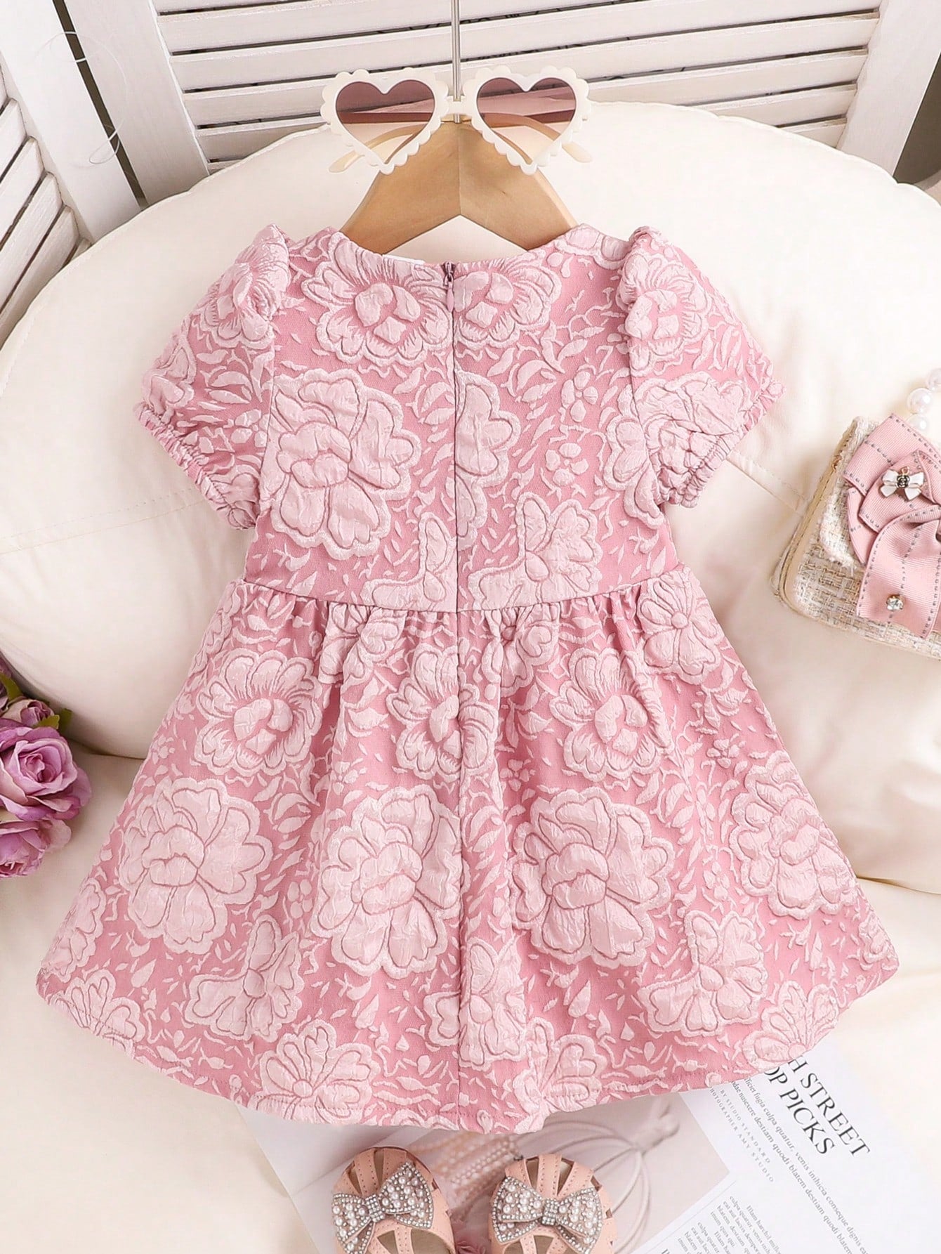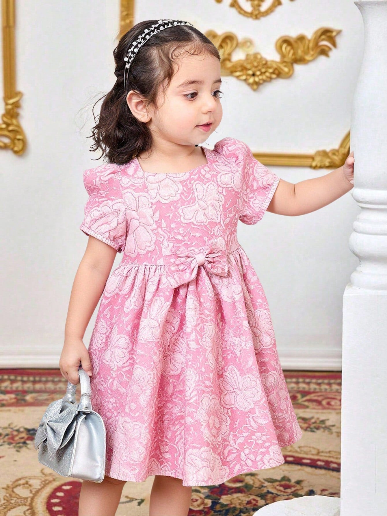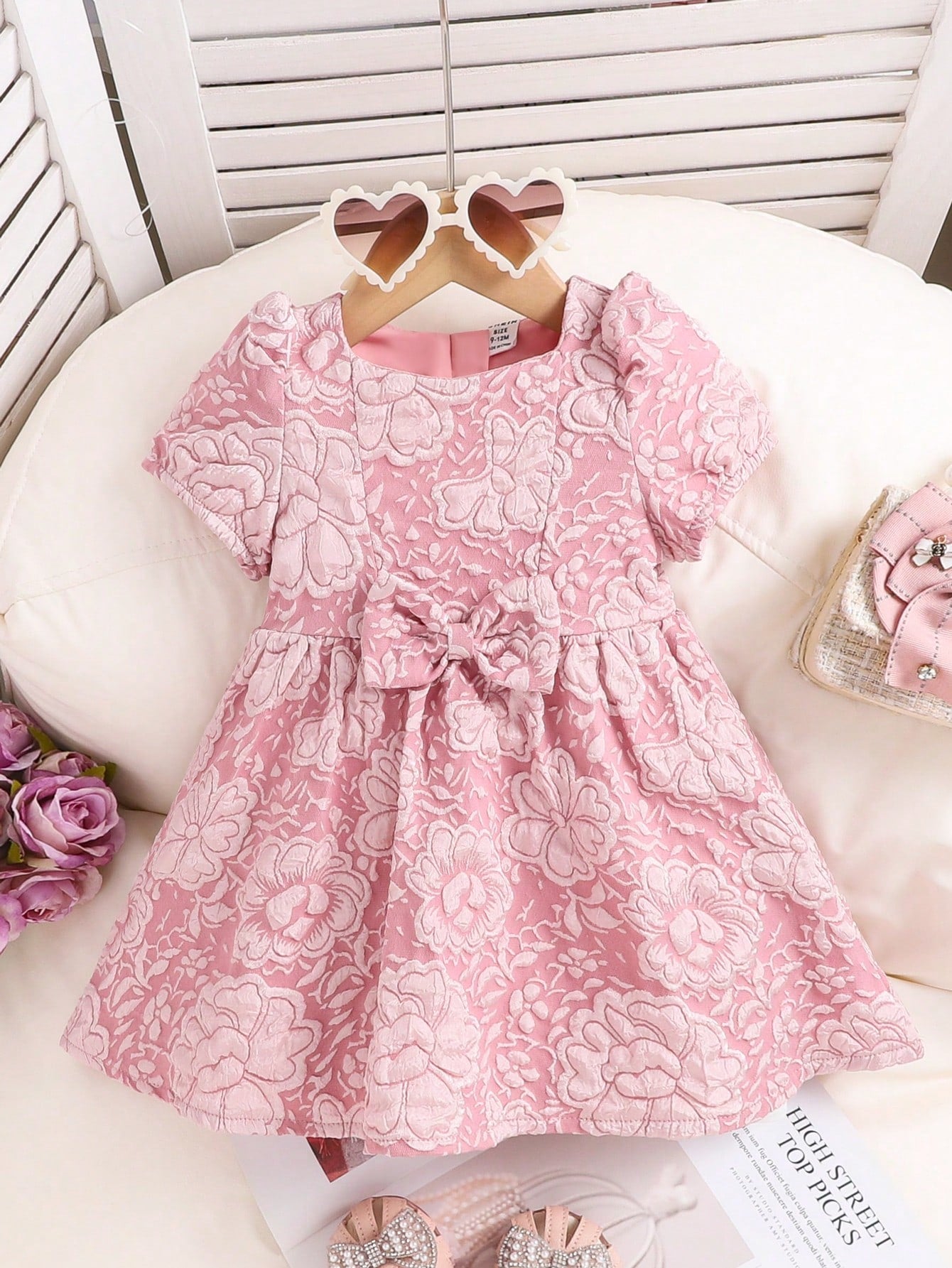 Infant/Toddler Girls Sweet Cute Elegant Floral 3D Puff Sleeve Dress With Waist Bow, Pink, Summer