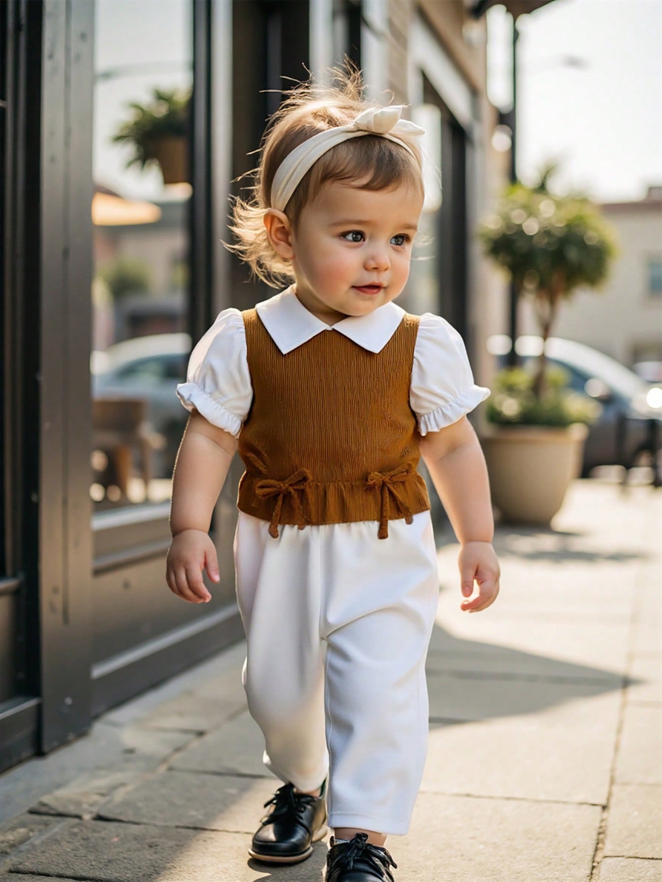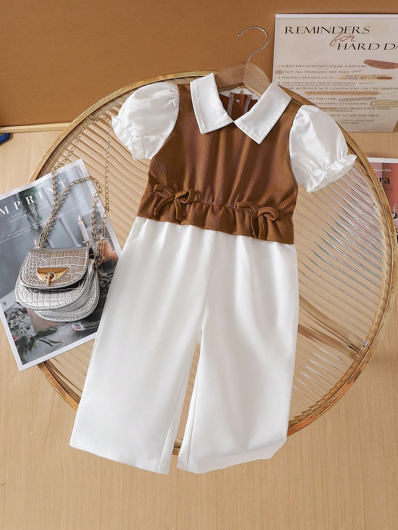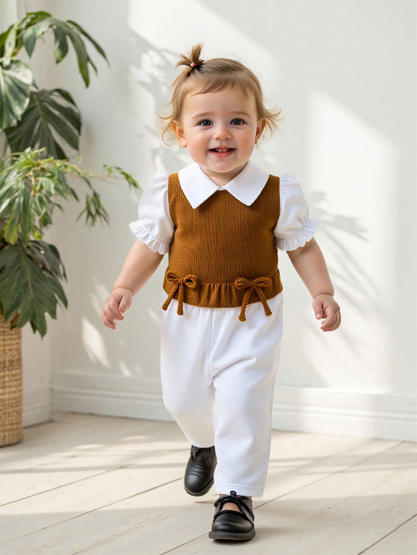 Infant Baby Girls Adorable Collar Spliced Knitted Bubble Short Sleeve White Romper With Long Pants