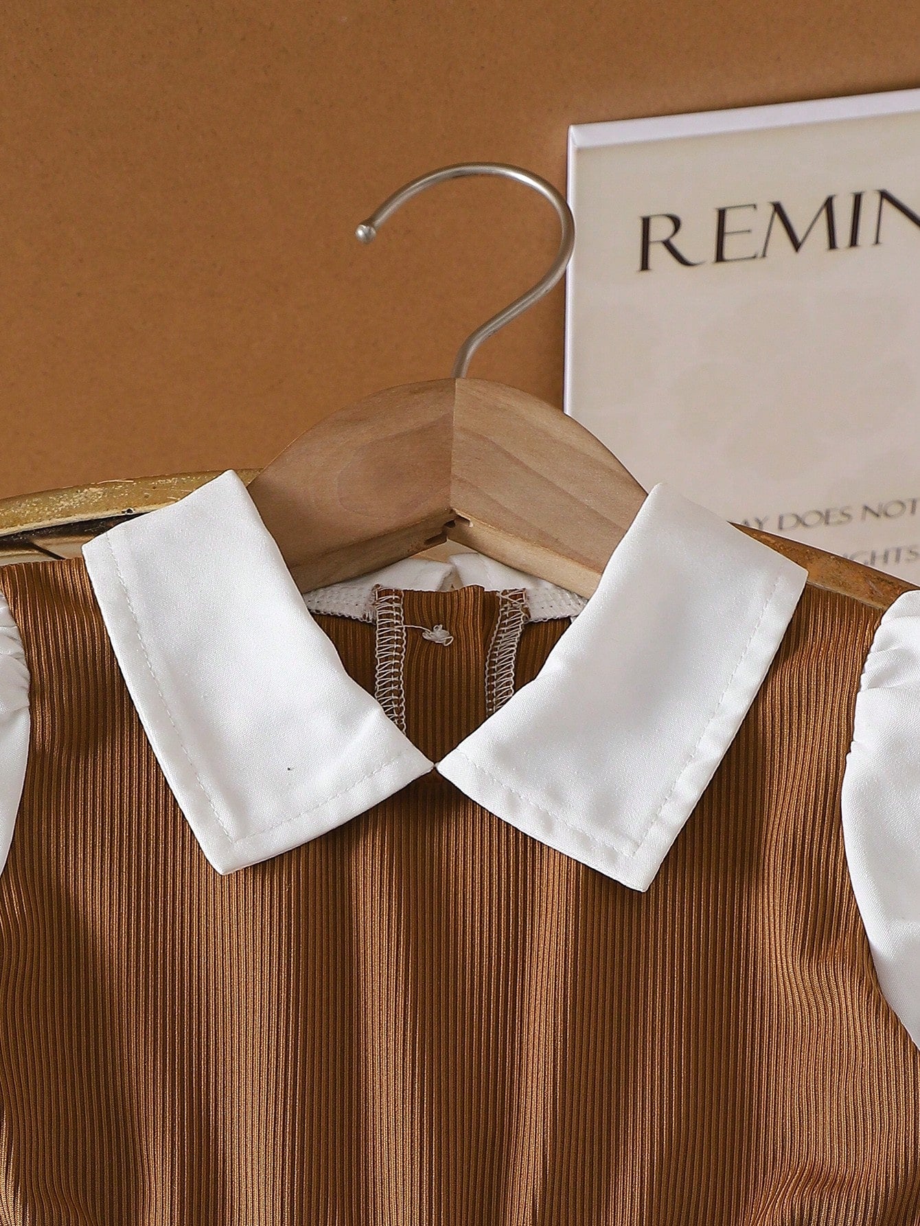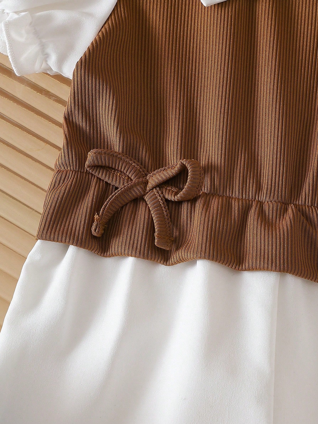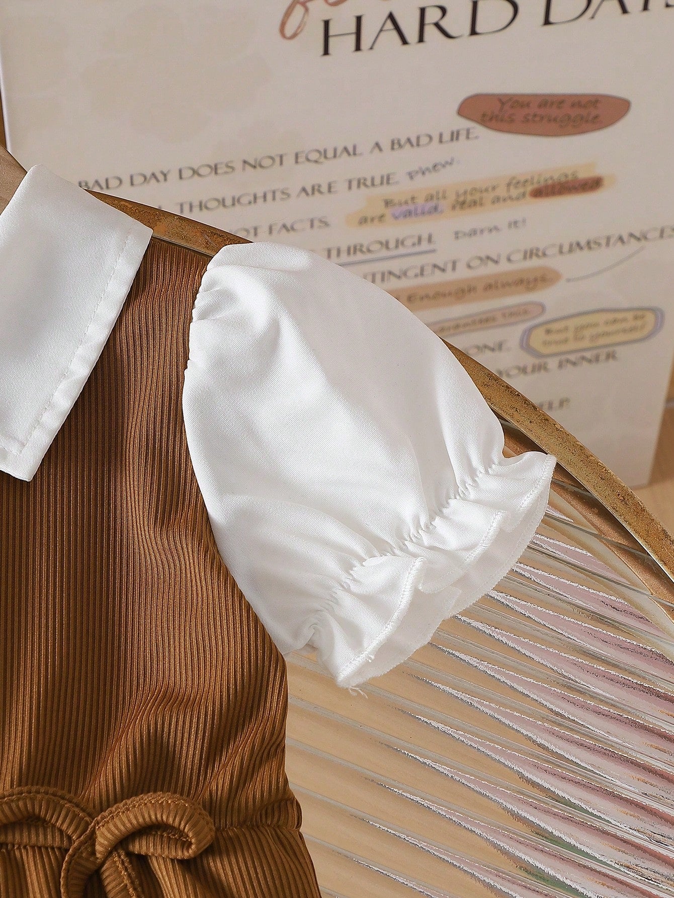 Infant Baby Girls Adorable Collar Spliced Knitted Bubble Short Sleeve White Romper With Long Pants