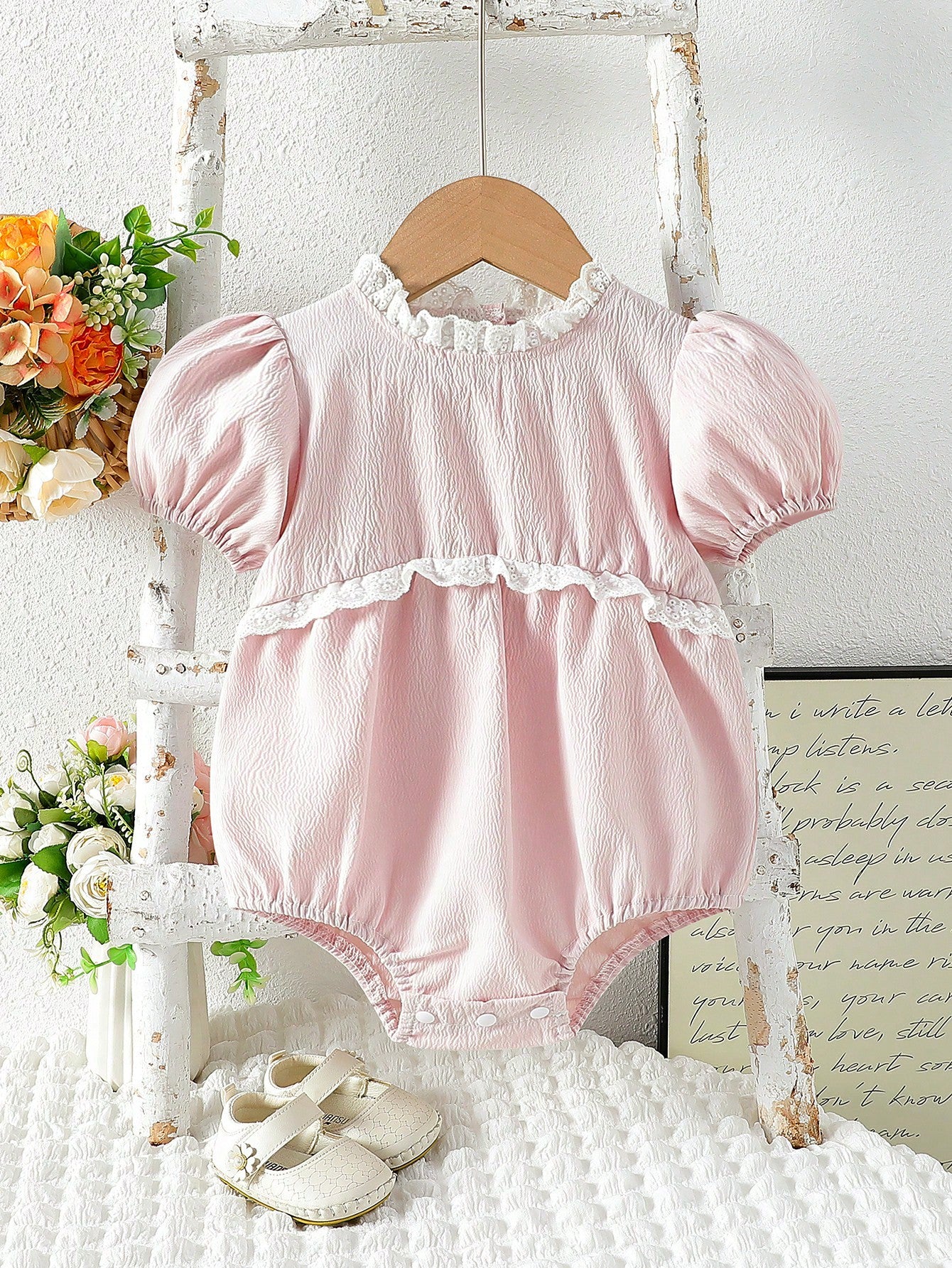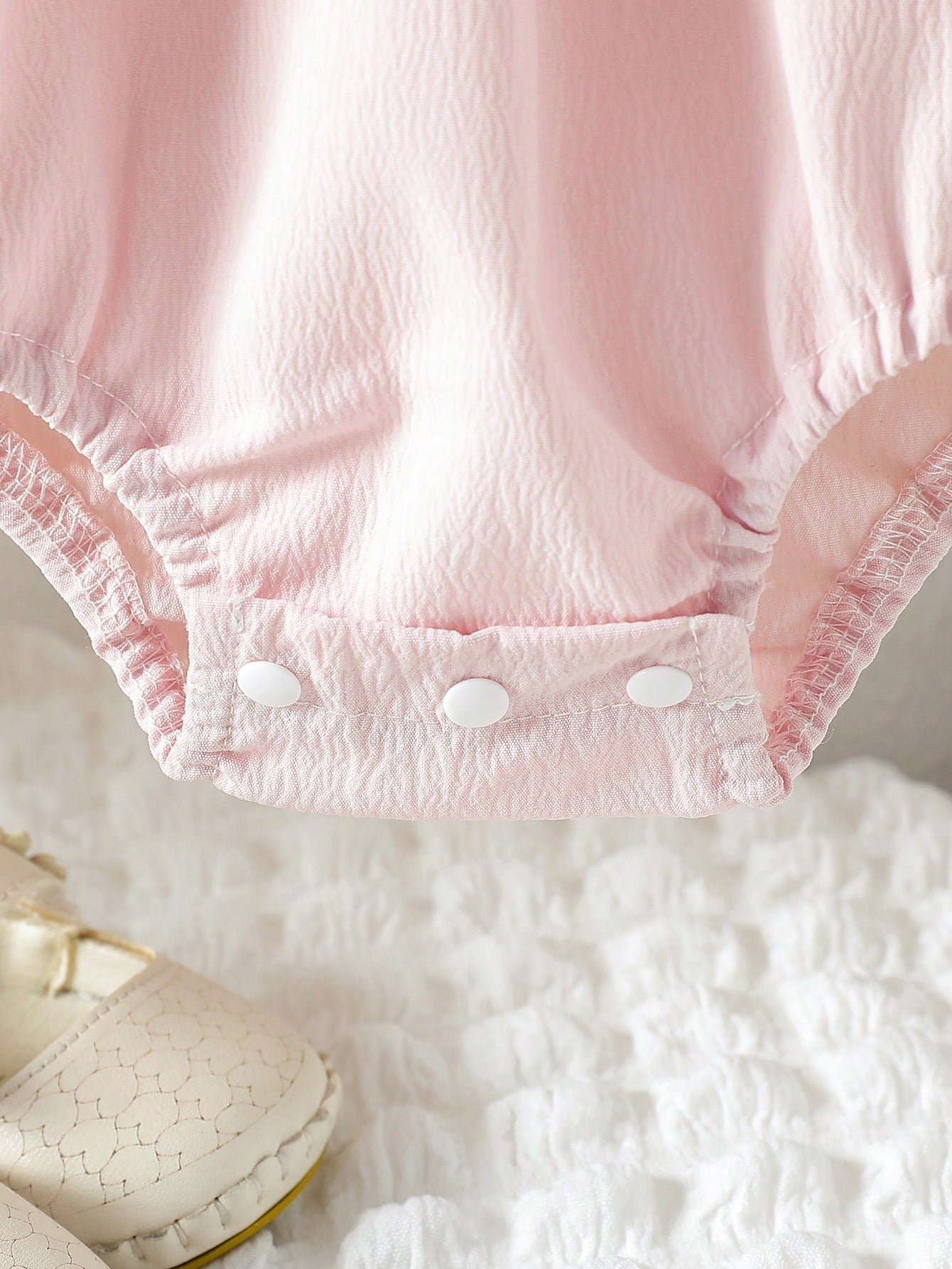 kids Baby Girls Pink Elegant Bodysuit With Stand Collar Short Sleeves And Eyelet Embroidery Detailing