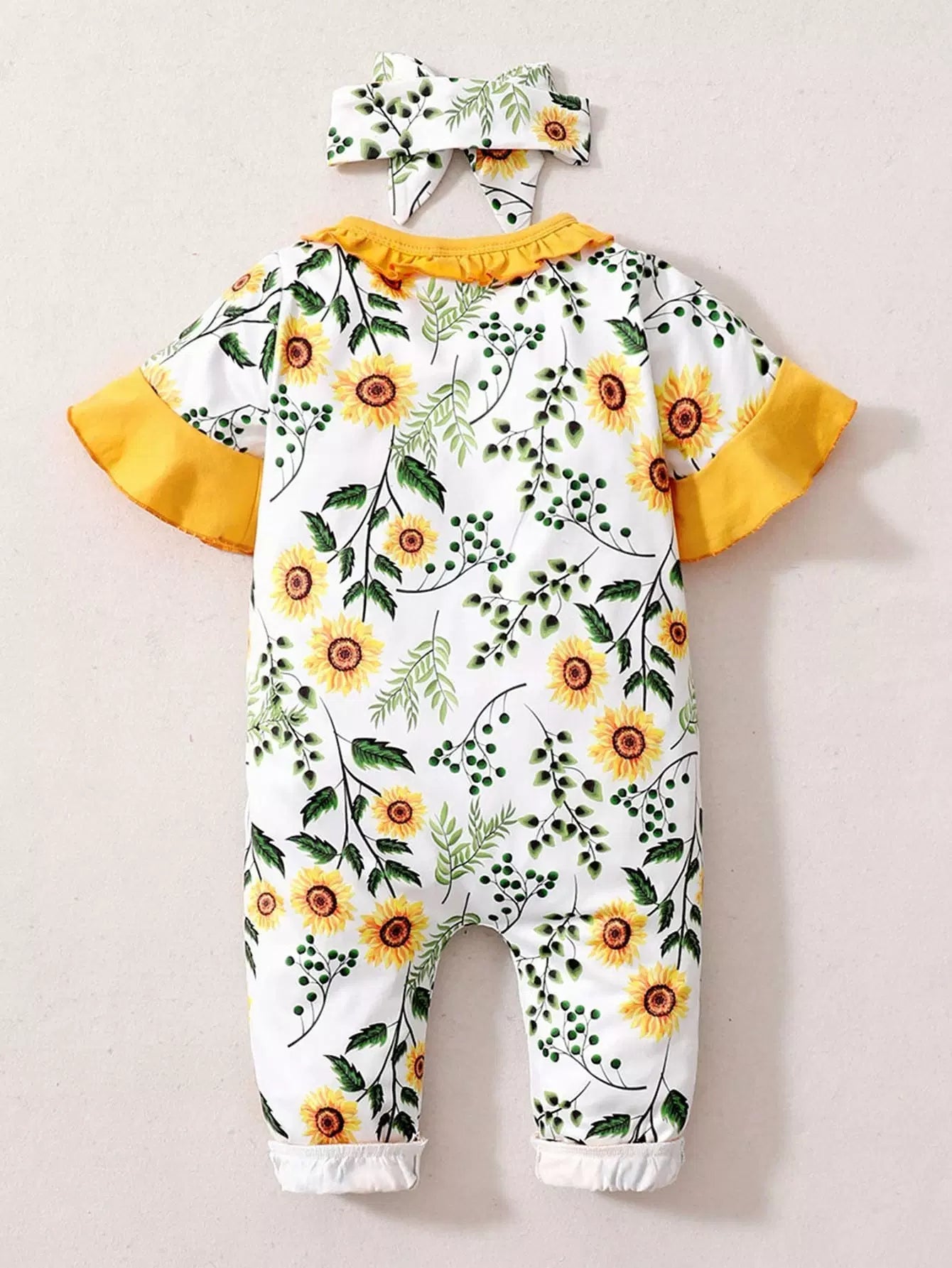 Baby Girl Floral Flounce Sleeve Jumpsuit With Headband