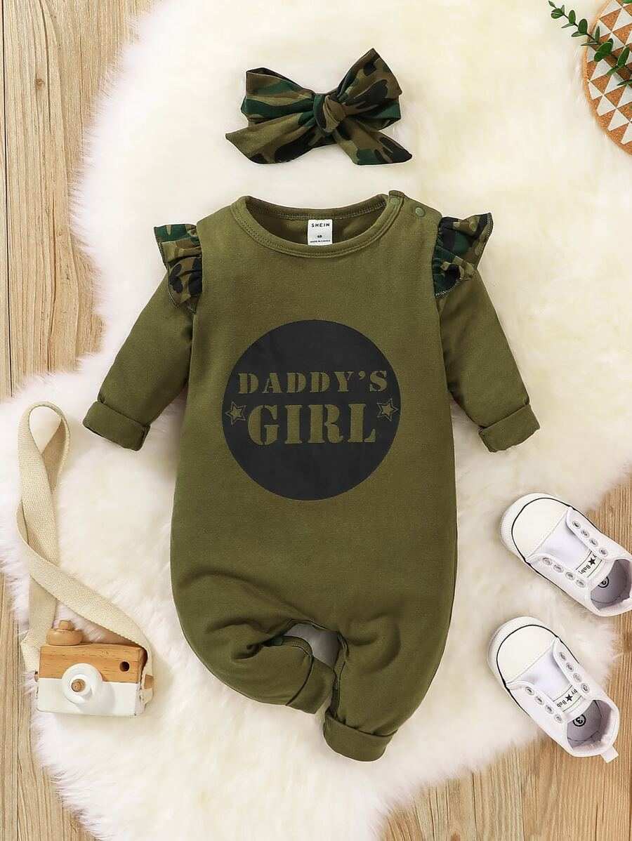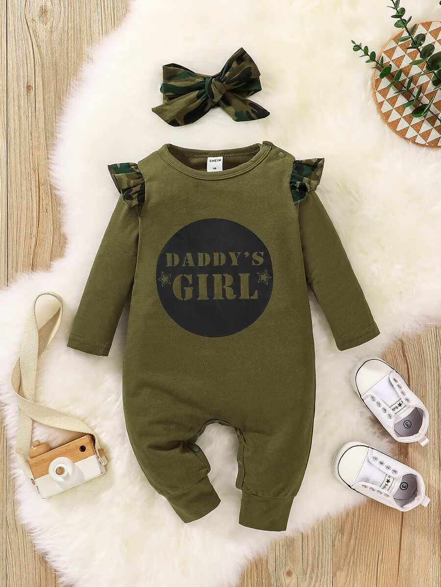 Baby Slogan Camo Print Ruffle Trim Jumpsuit Headban