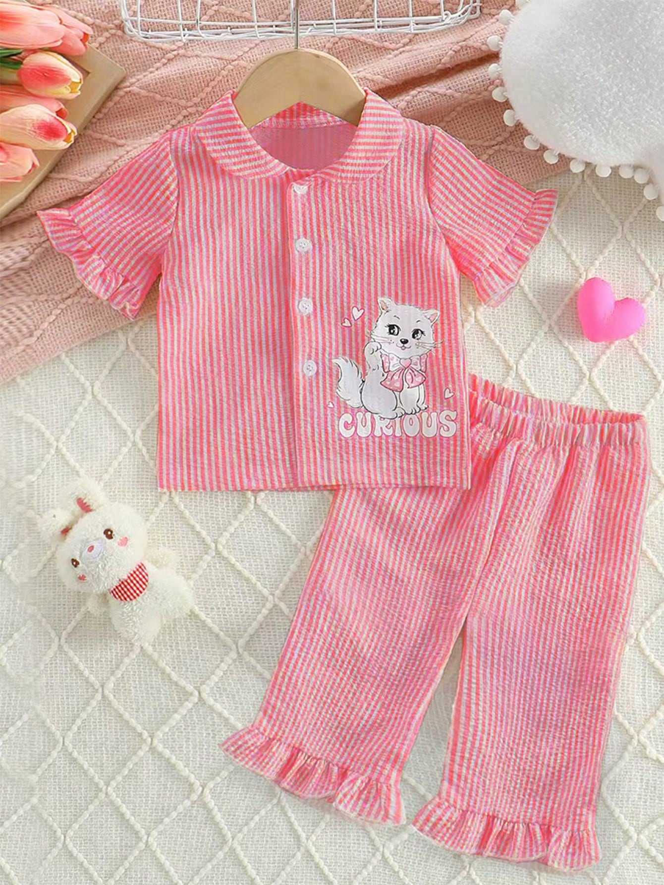 2pcs Baby Girl Striped Cute Kitten Print Short Sleeve Top And Pants Comfortable Soft Pajama Sets, Spring/Summer