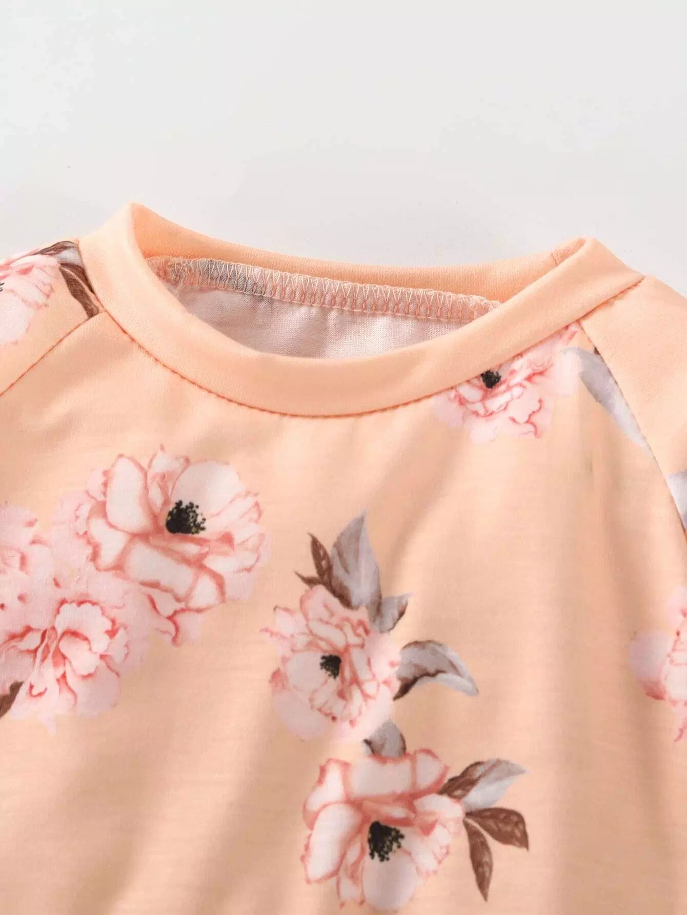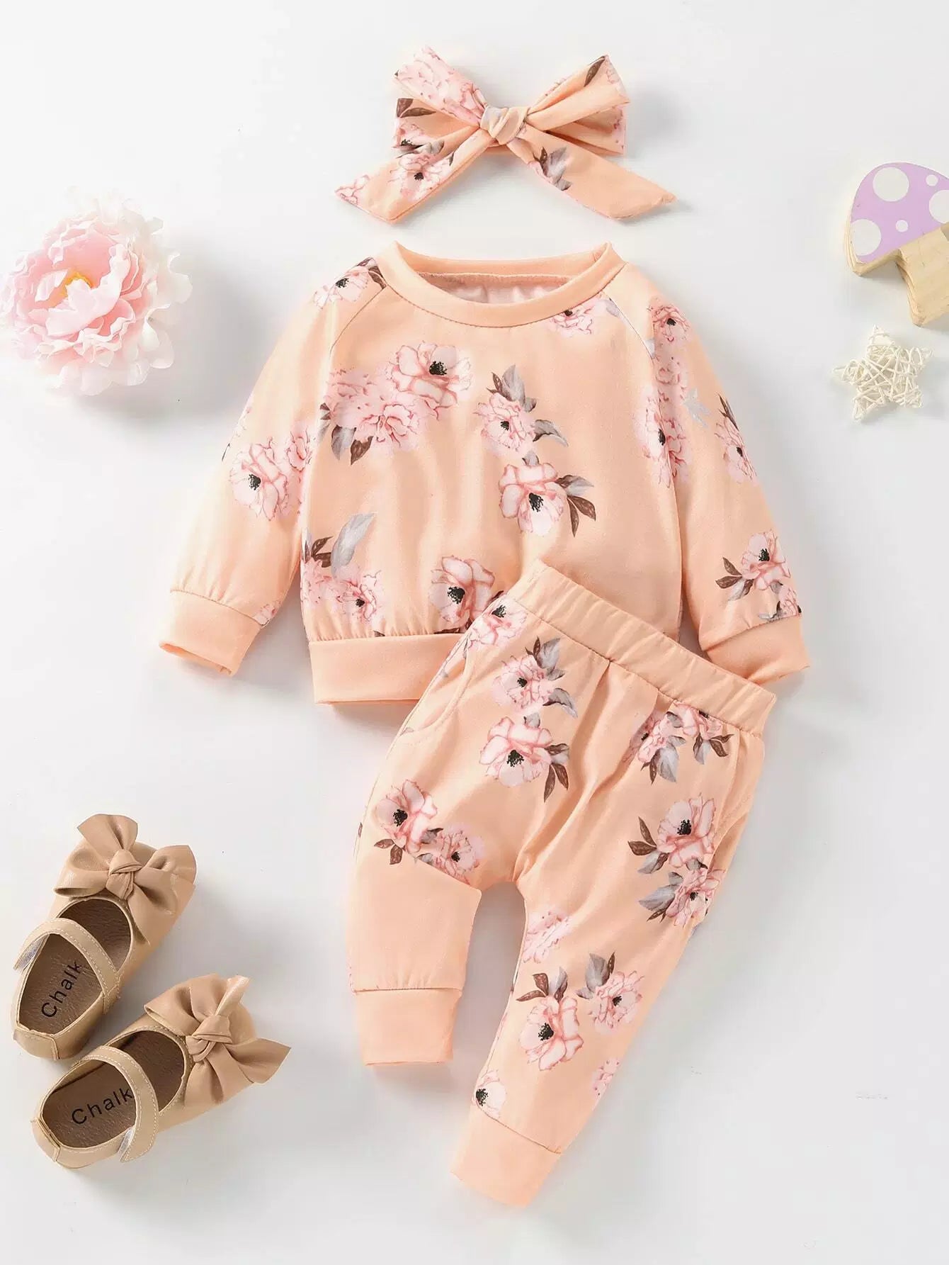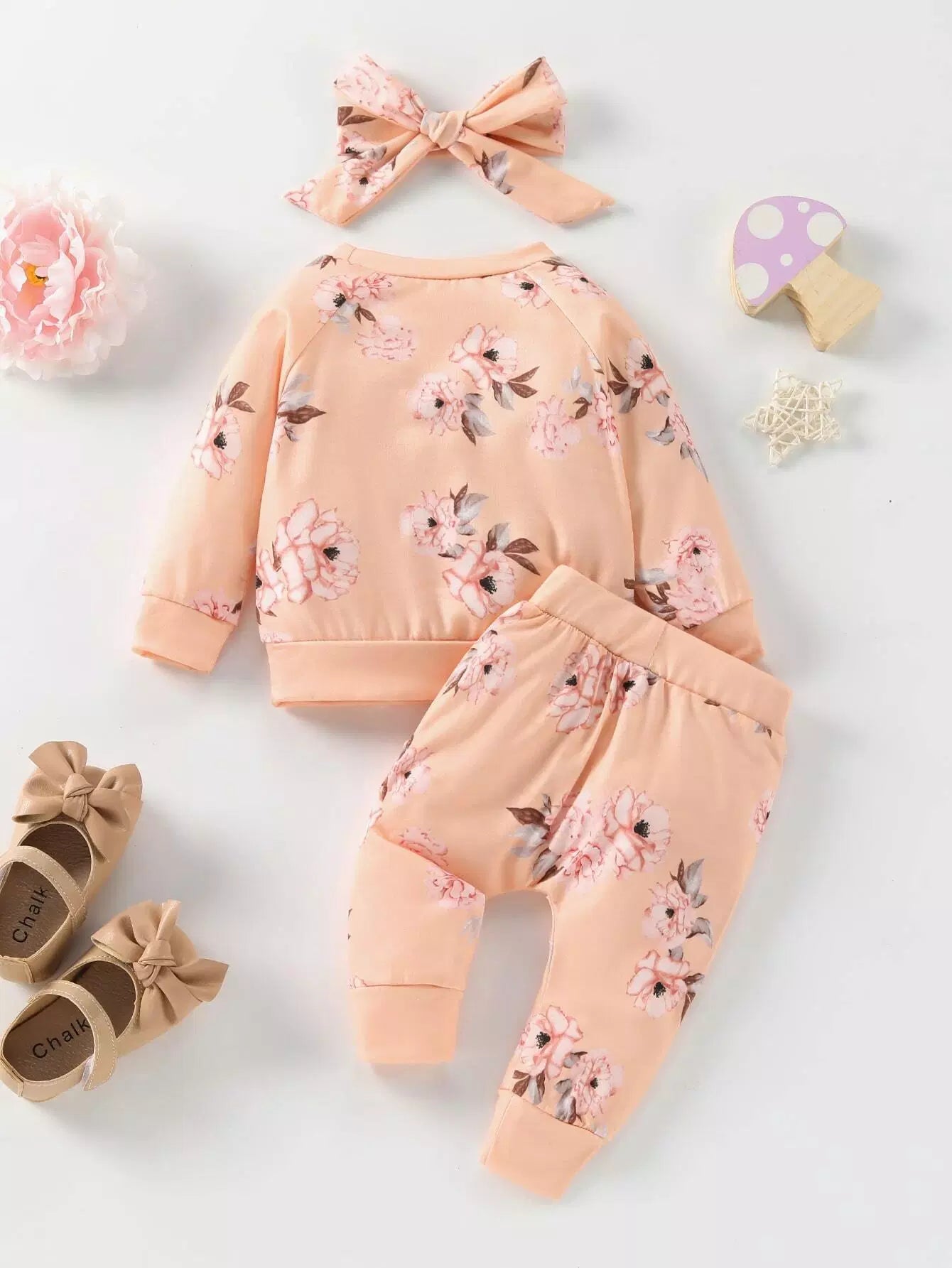 Baby Floral Print Raglan Sleeve Pullover & Sweatpants & Headband
