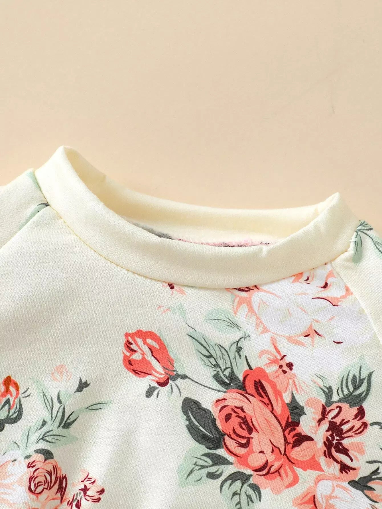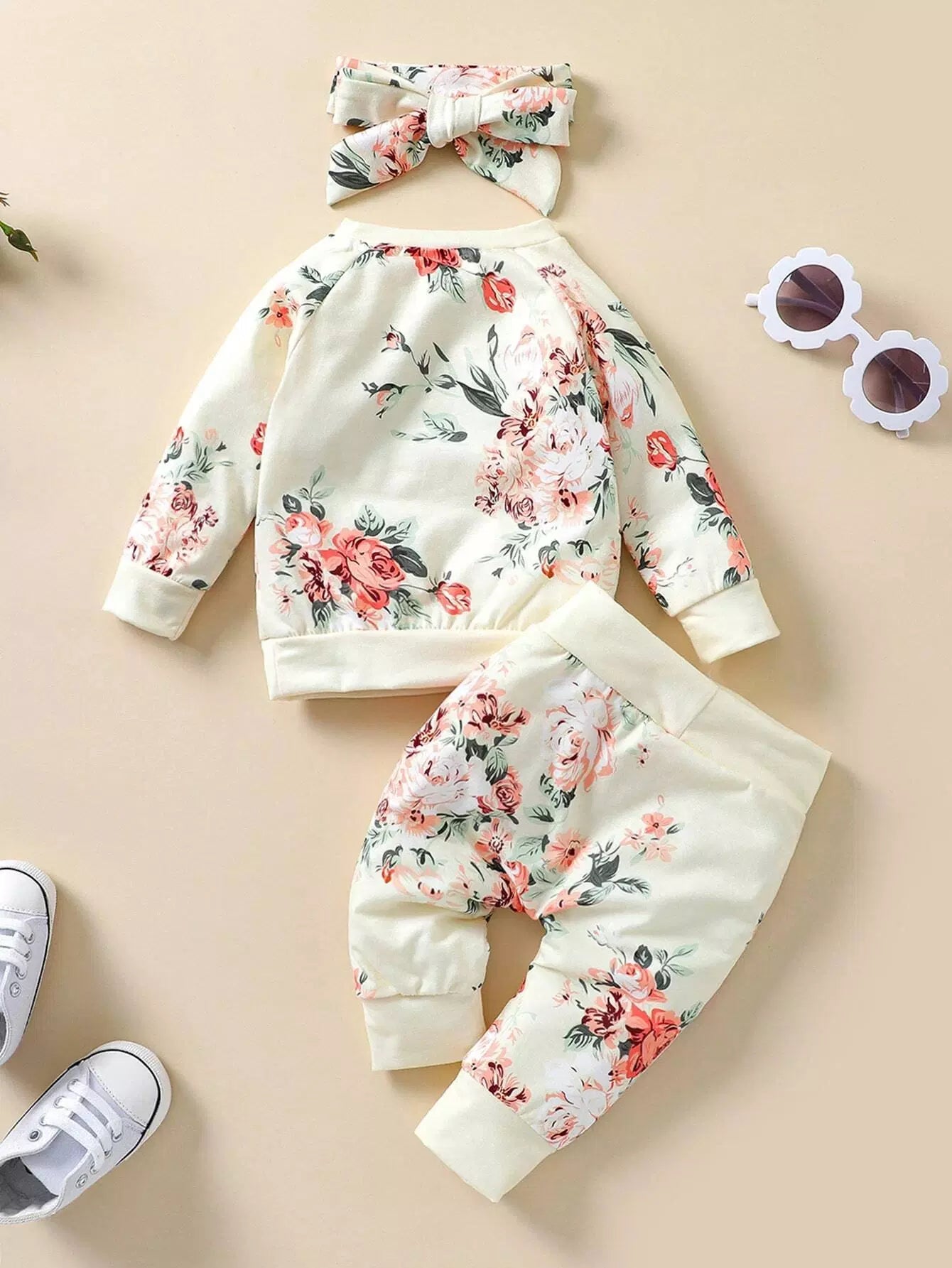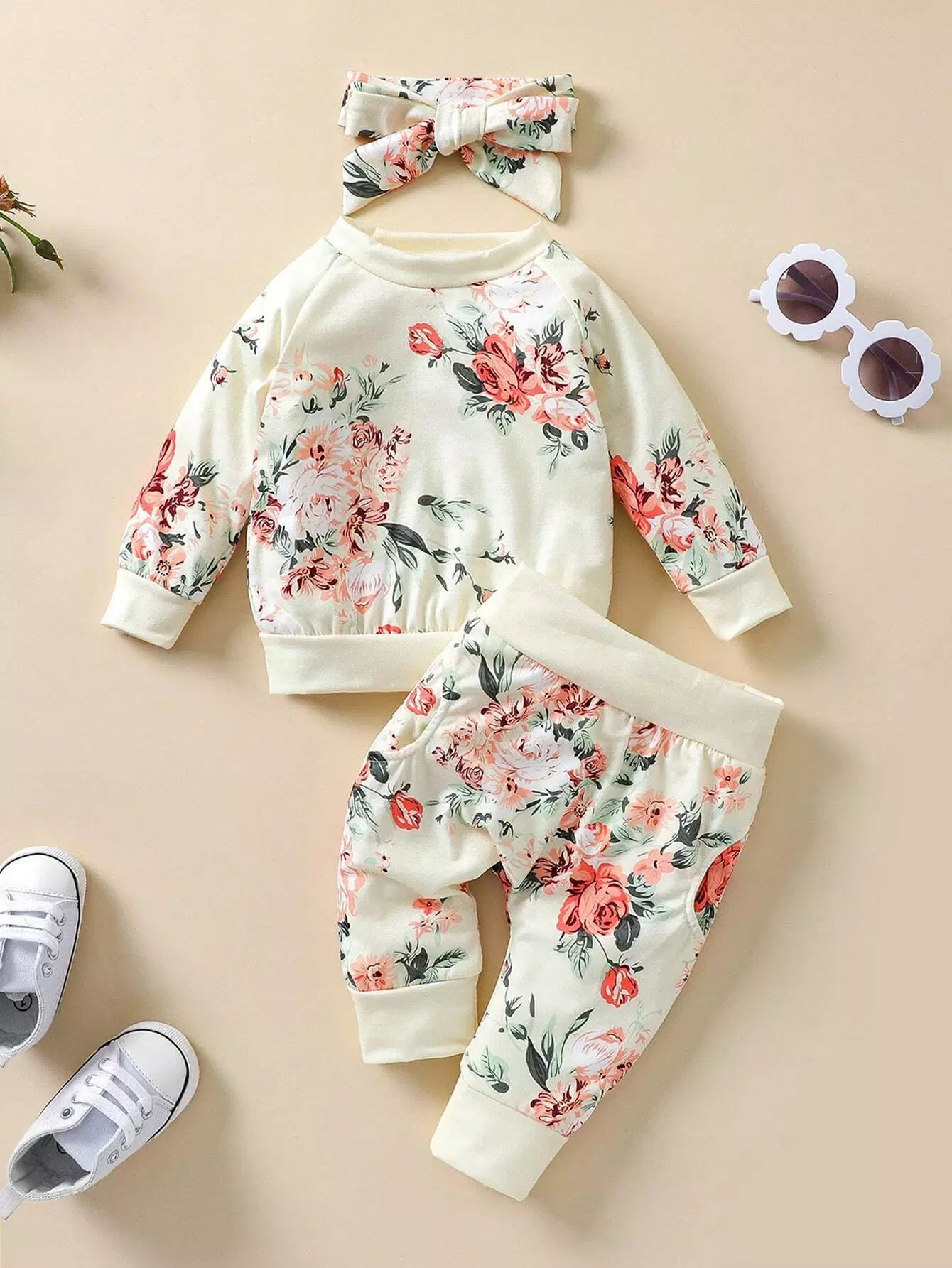 Baby Floral Print Raglan Sleeve Pullover & Sweatpants With Headband
