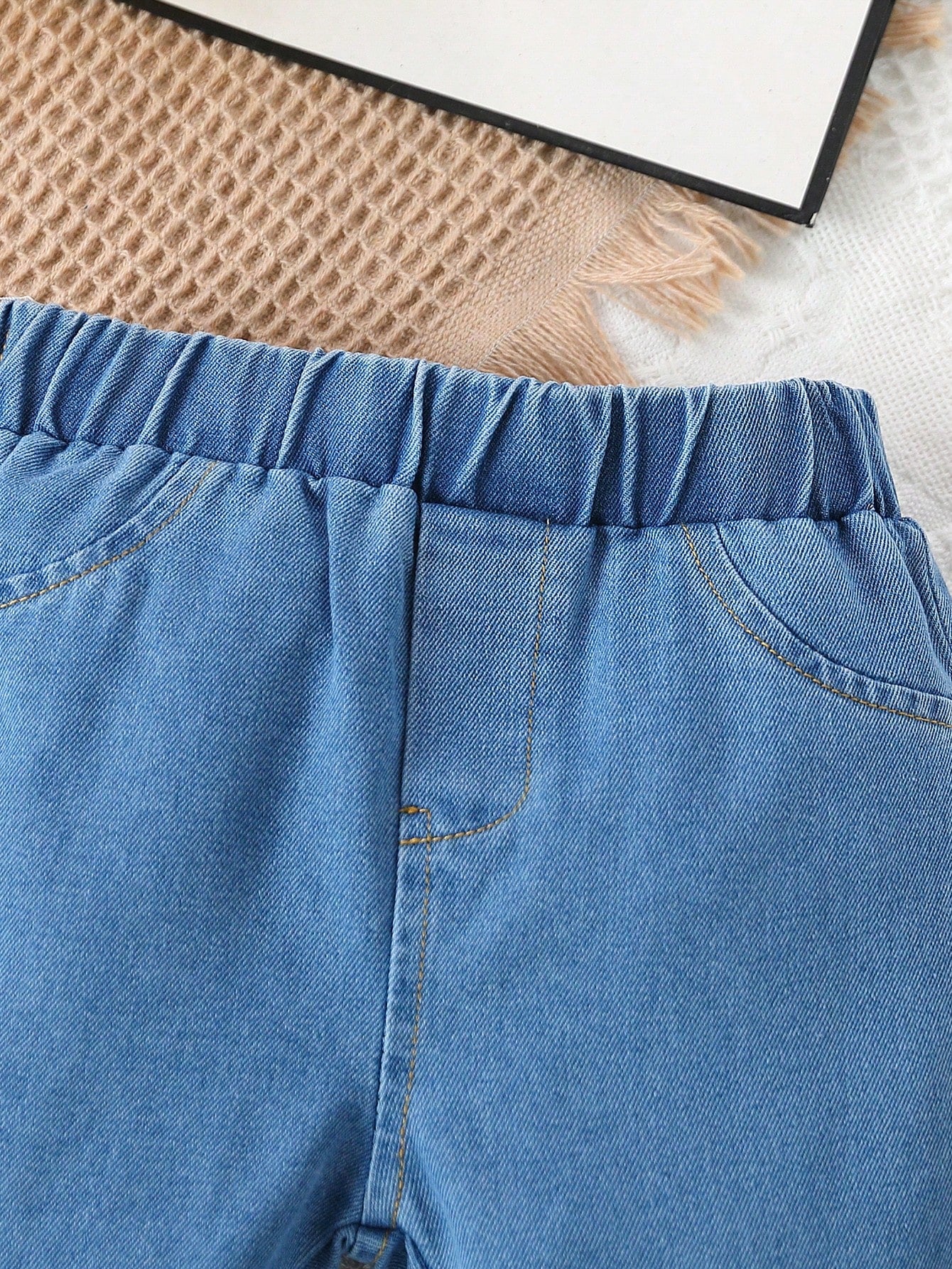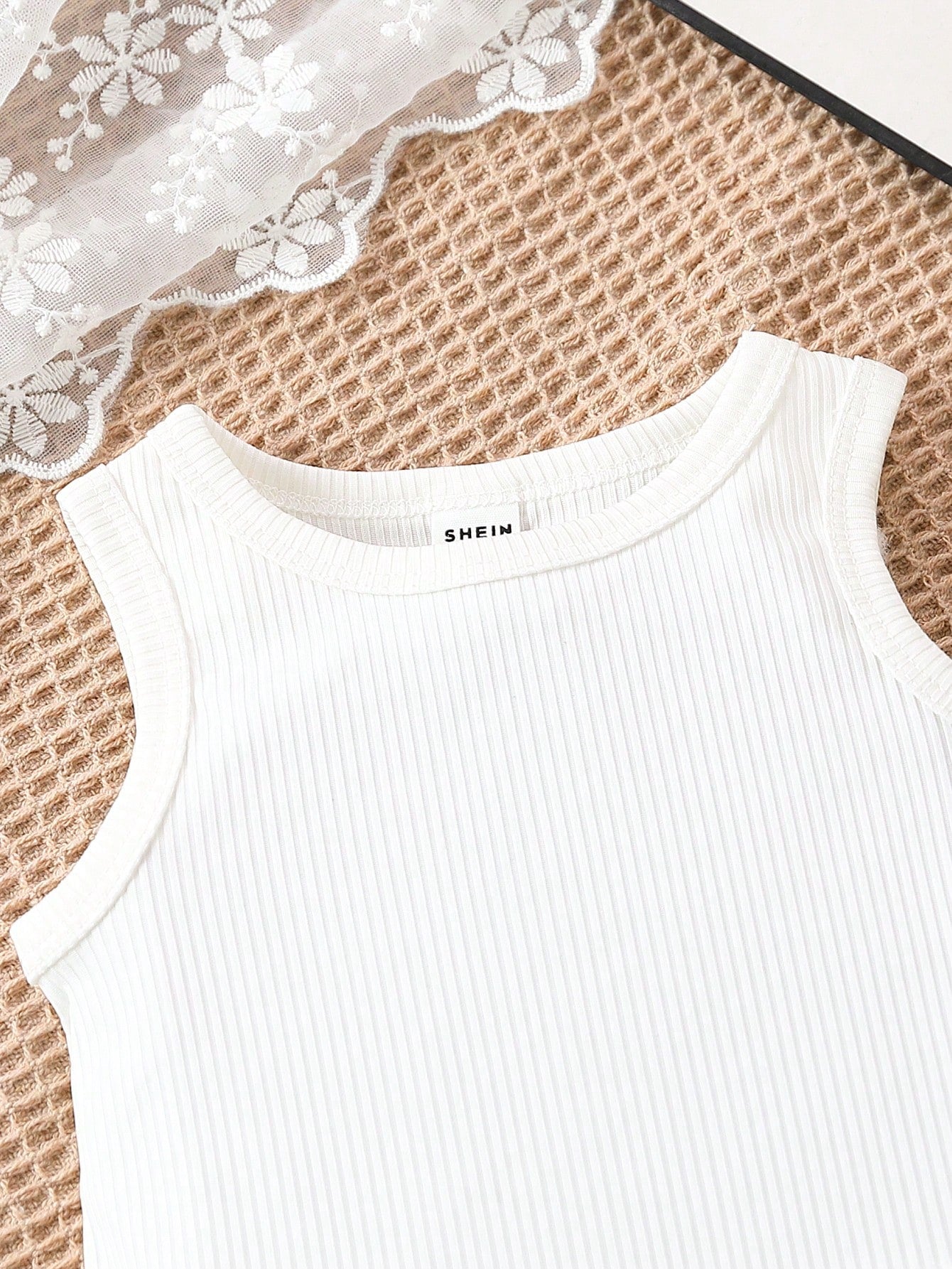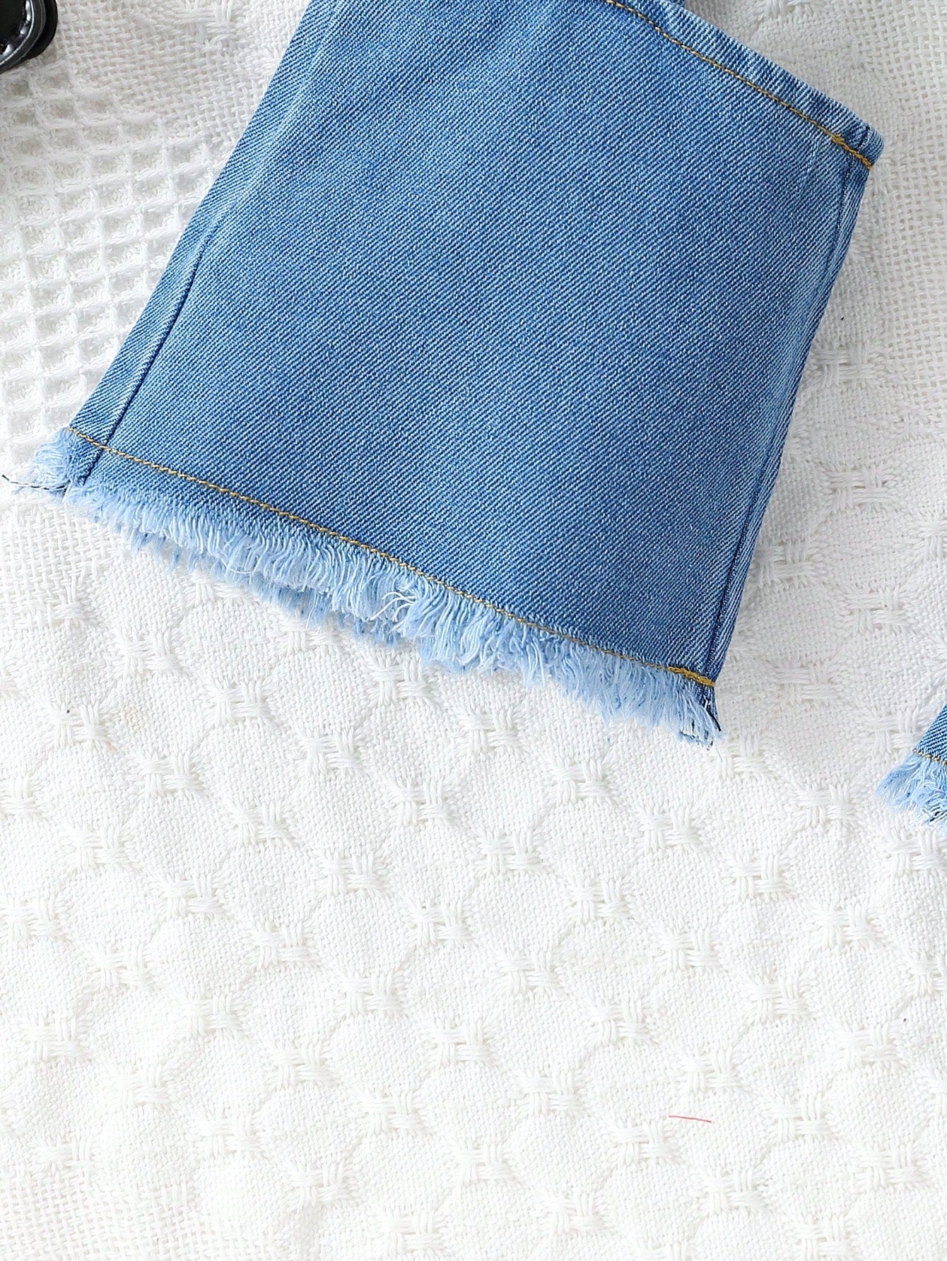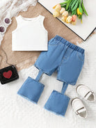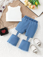 Baby Girl 2pcs/Set Fashionable White Vest And Distressed Denim Shorts Summer Outfit