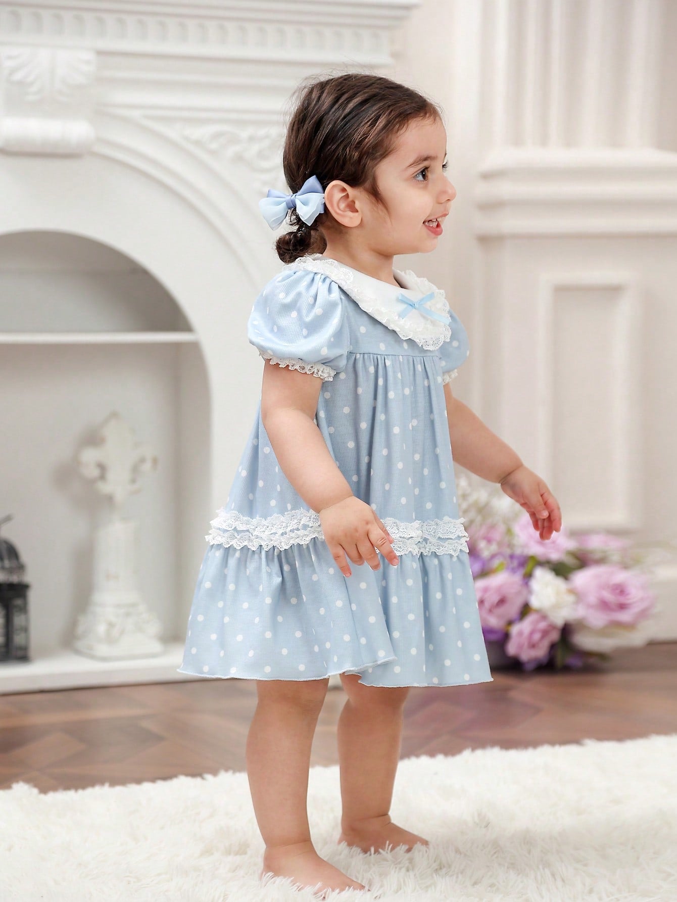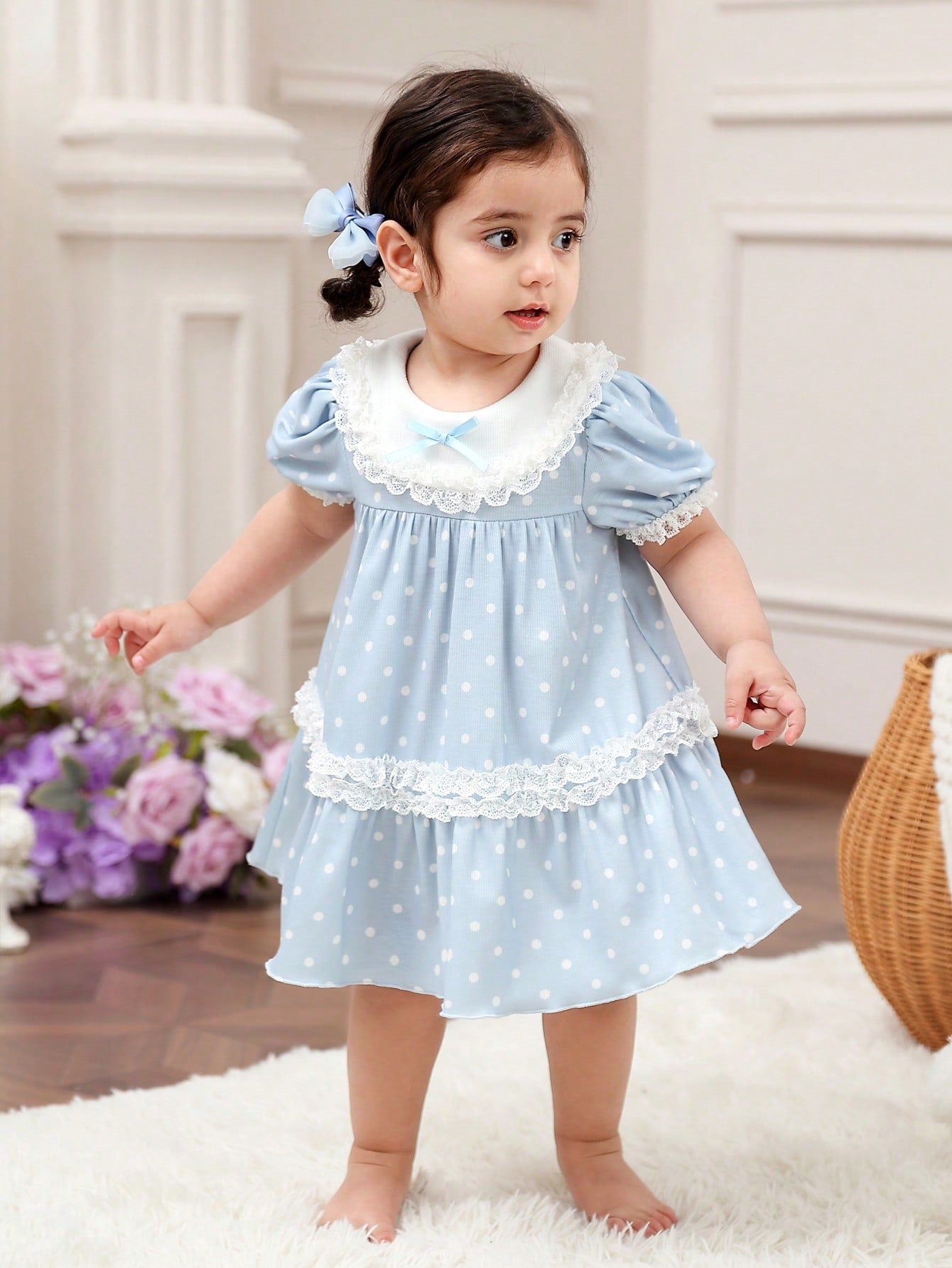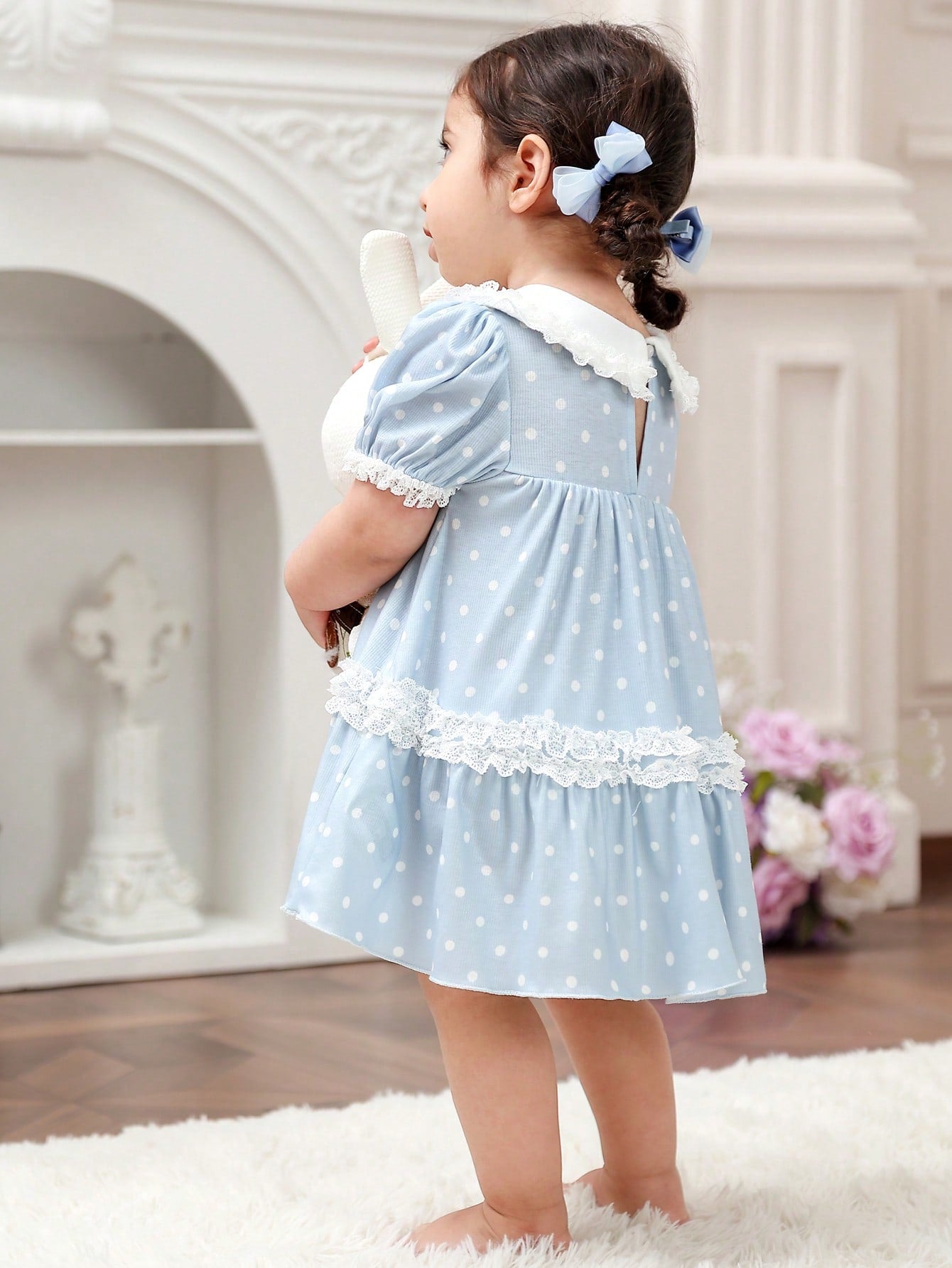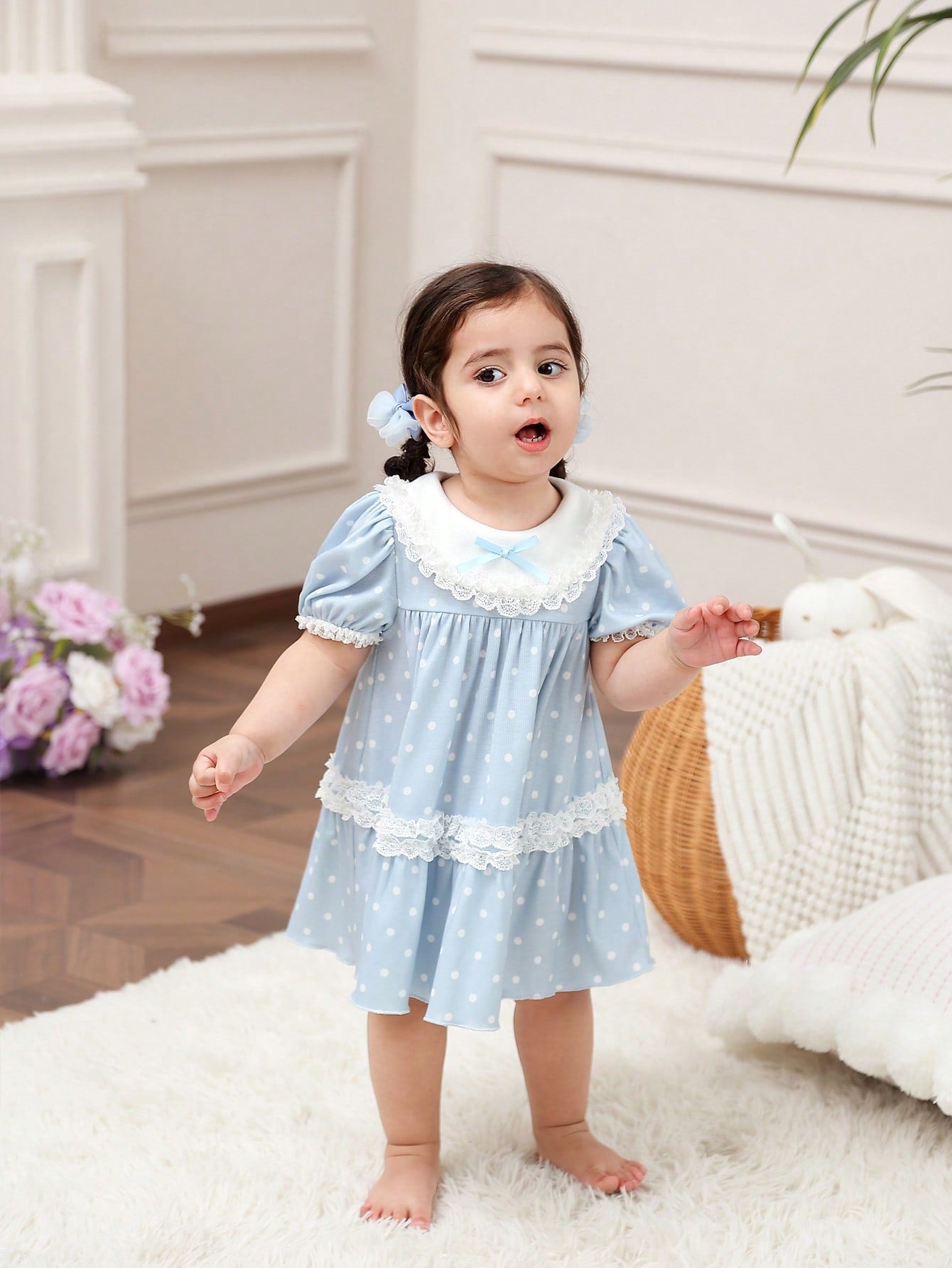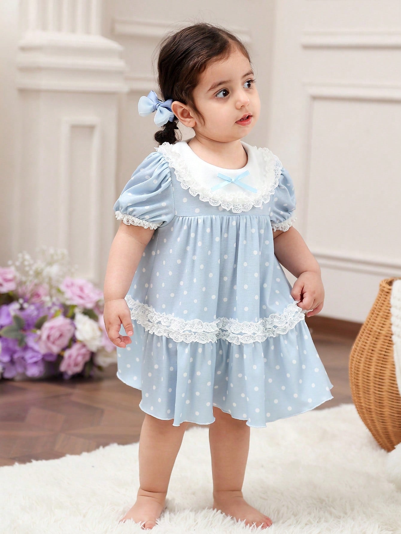 Baby Girl Baby Girls Simple Polka Dot Round Neck Lace Trim Puff Sleeve Loose Princess Style Knit Nightgown,