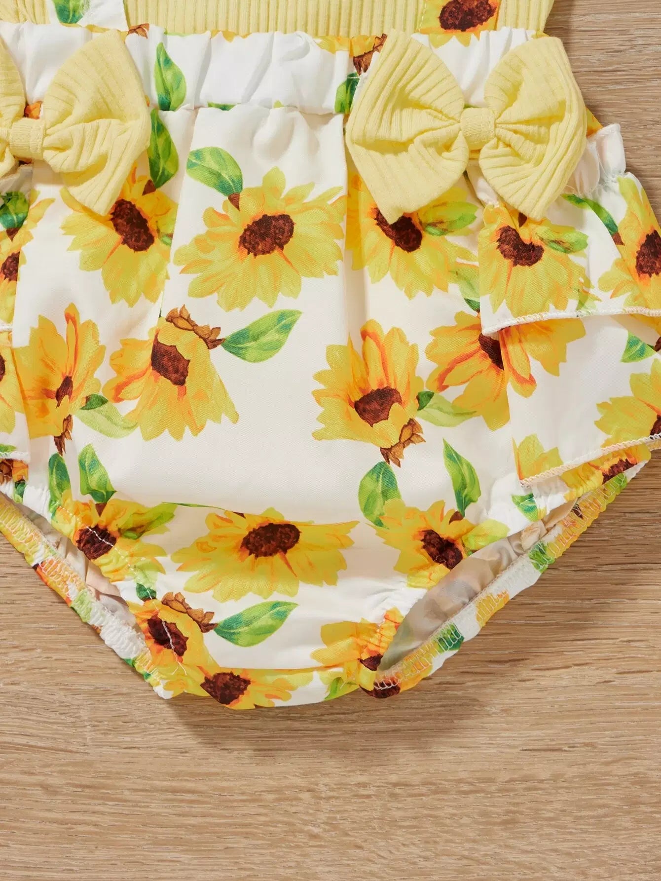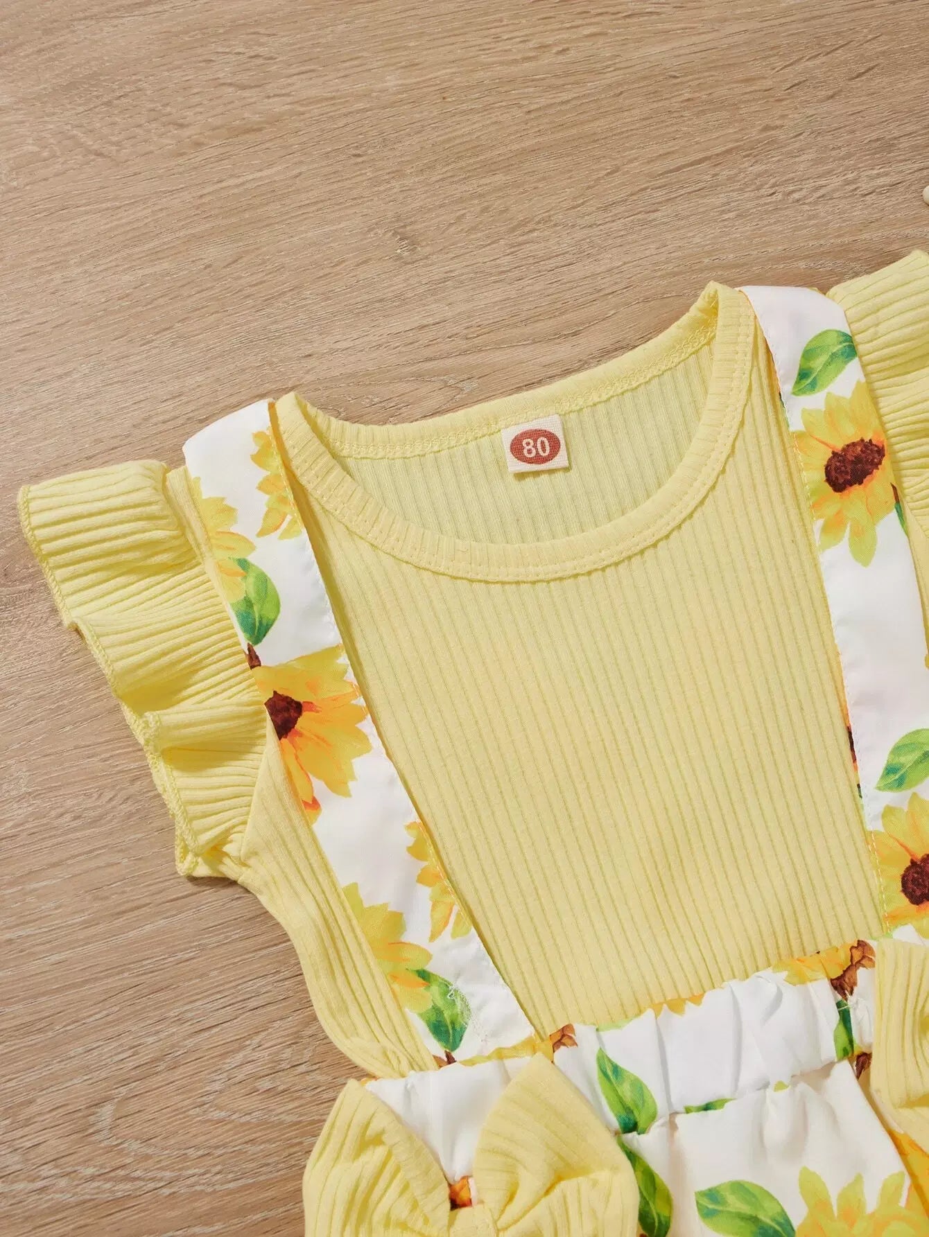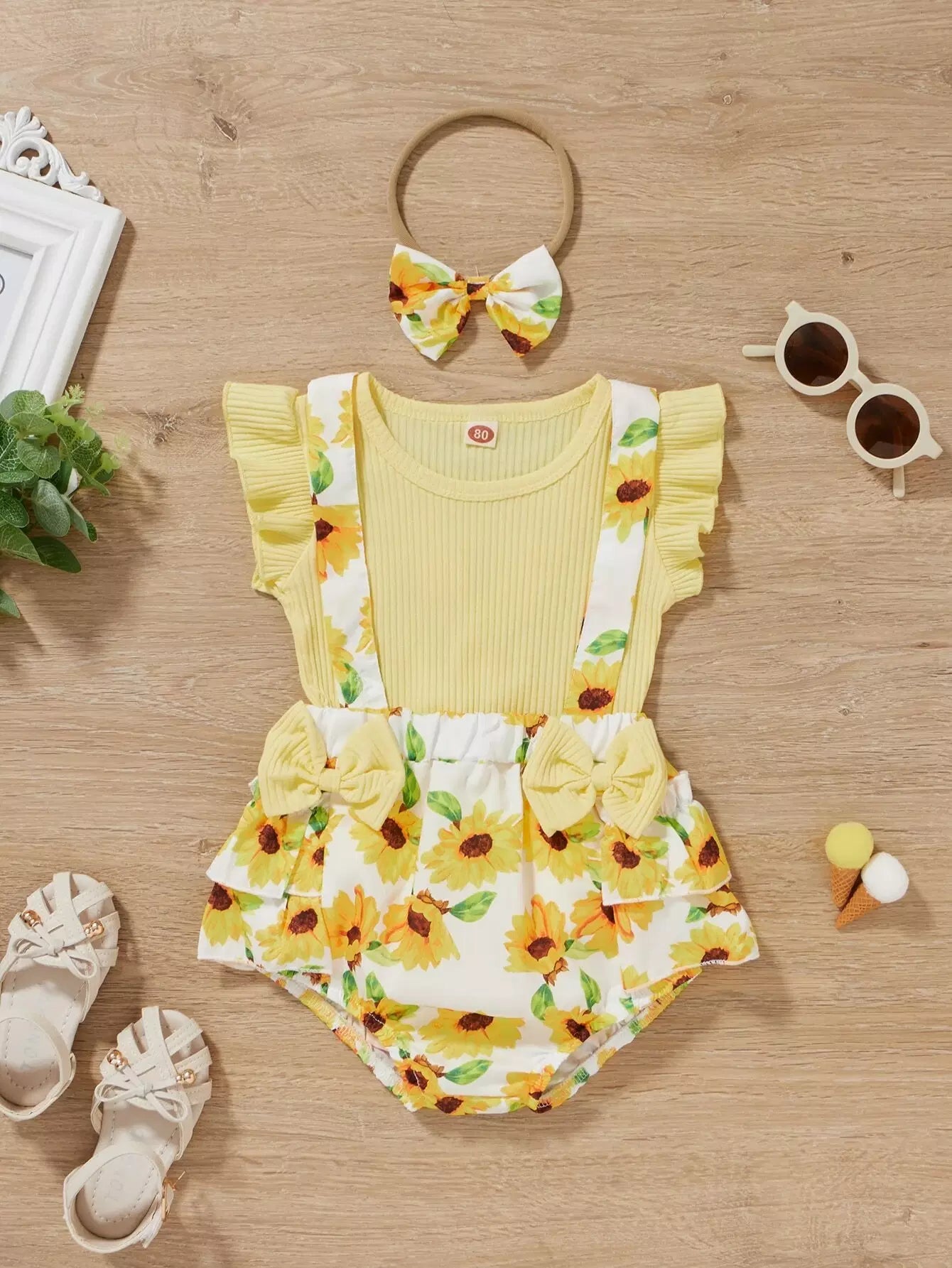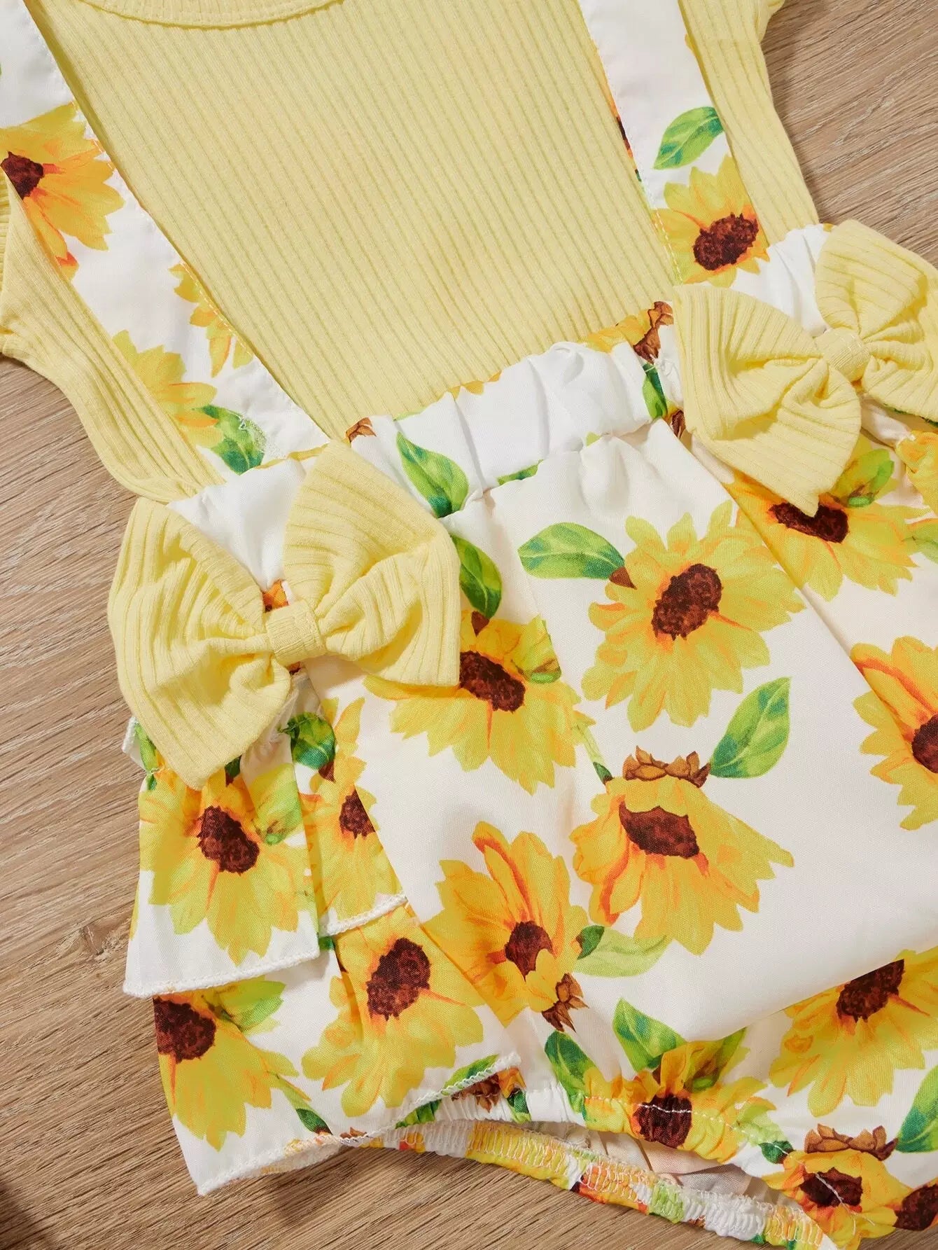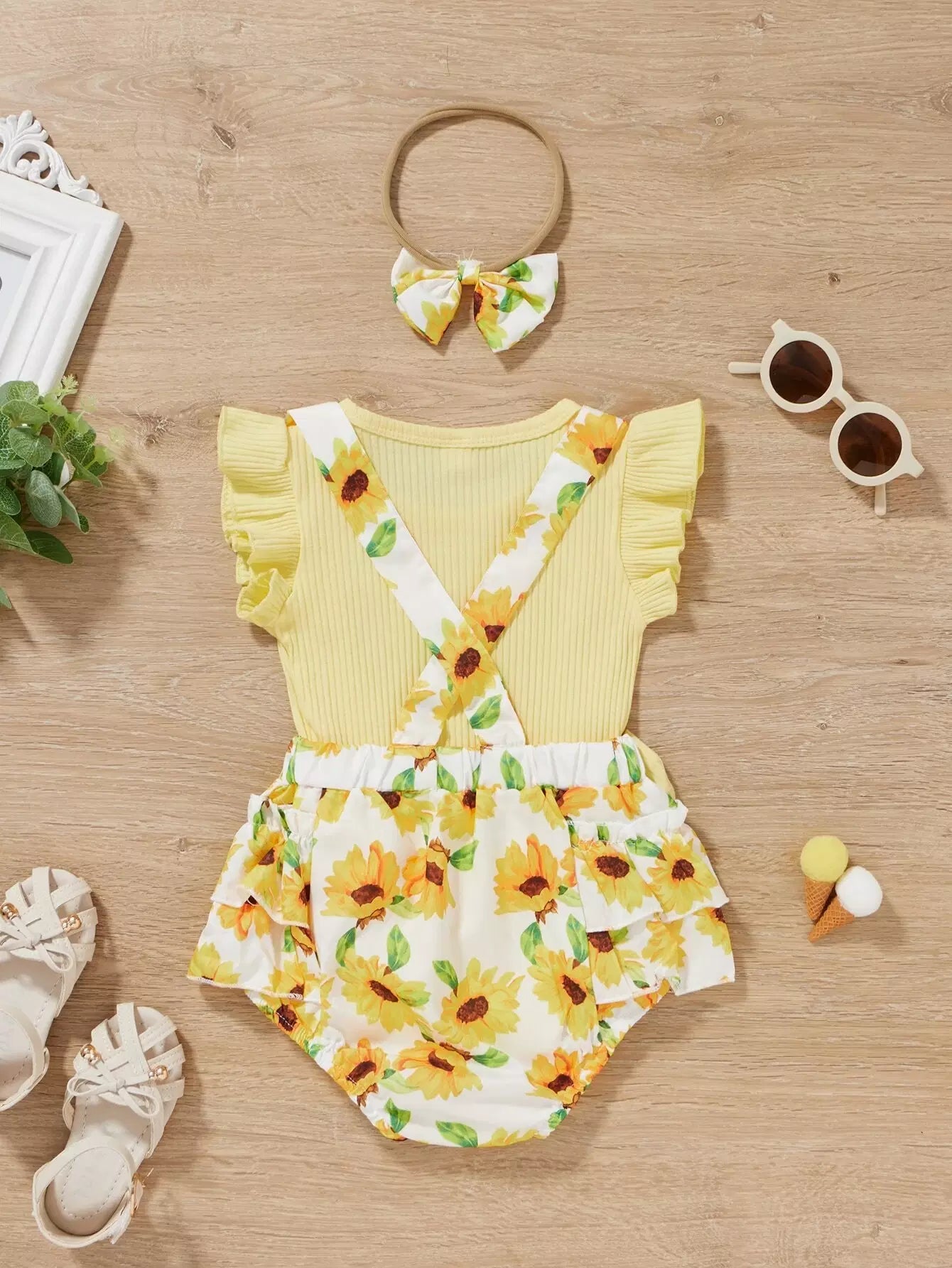 Baby Girl Ribbed Ruffle Trim Bodysuit & Floral Suspender Shorts & Headband