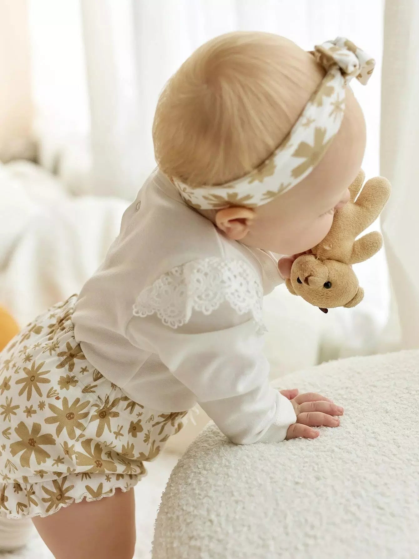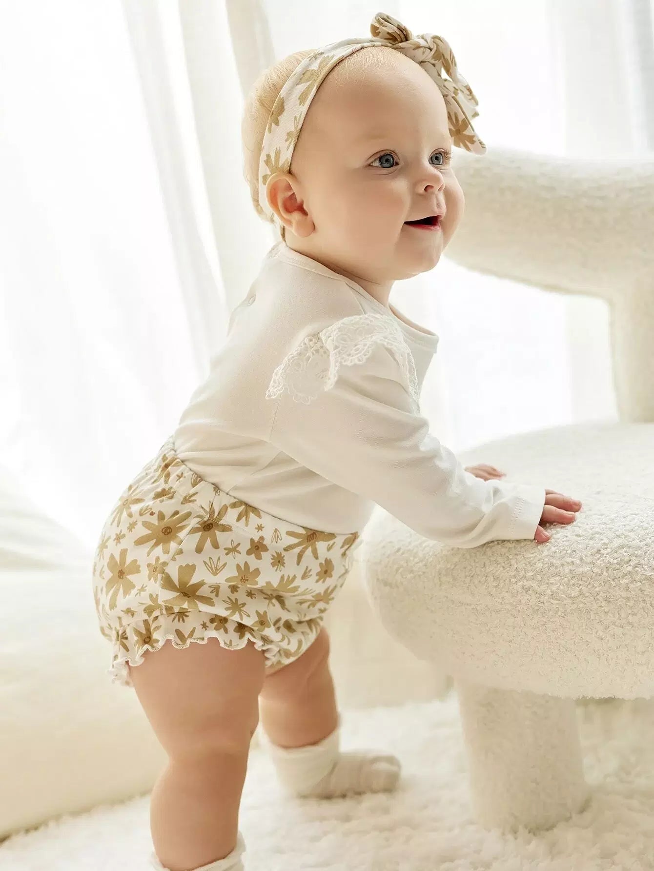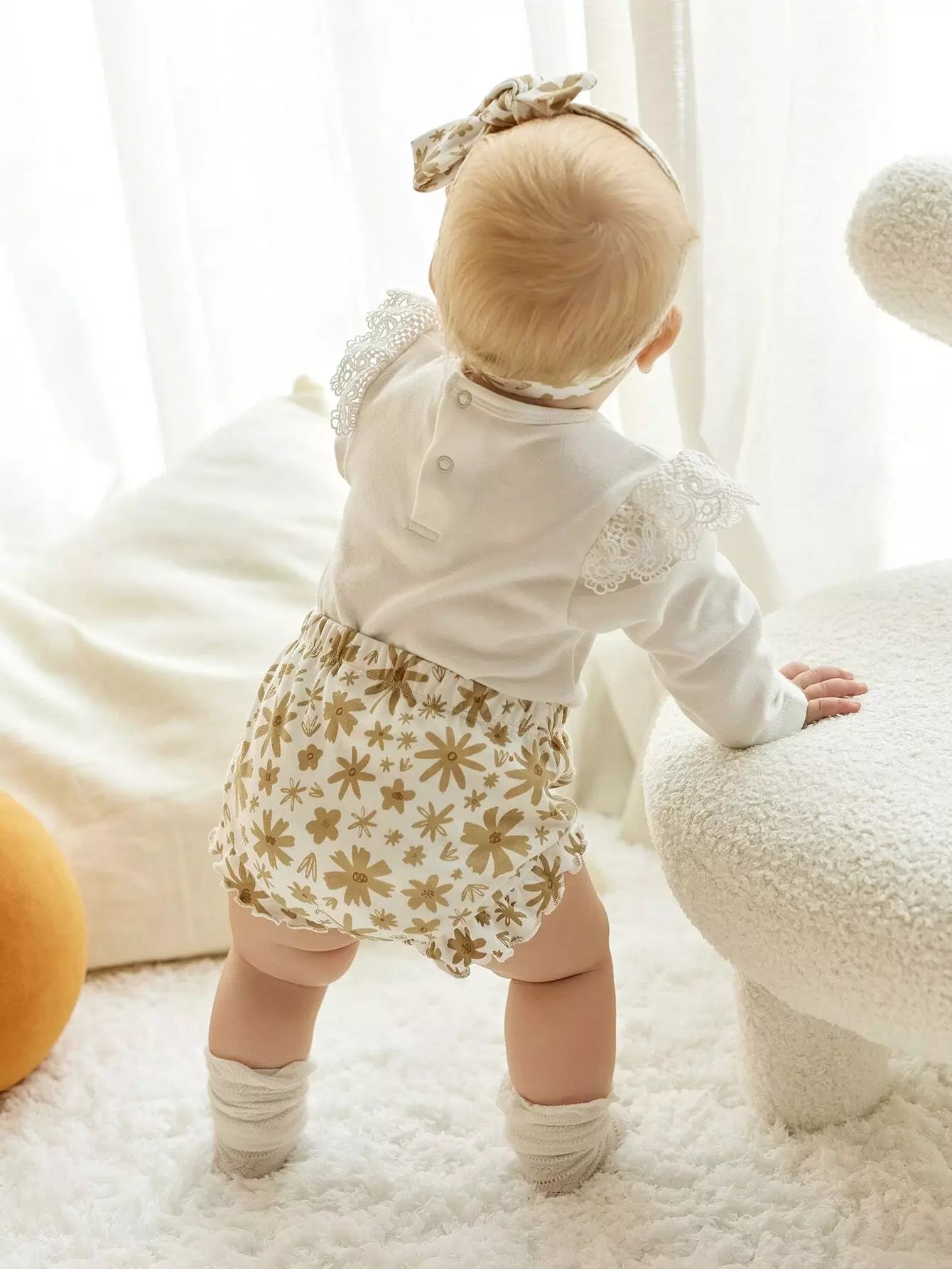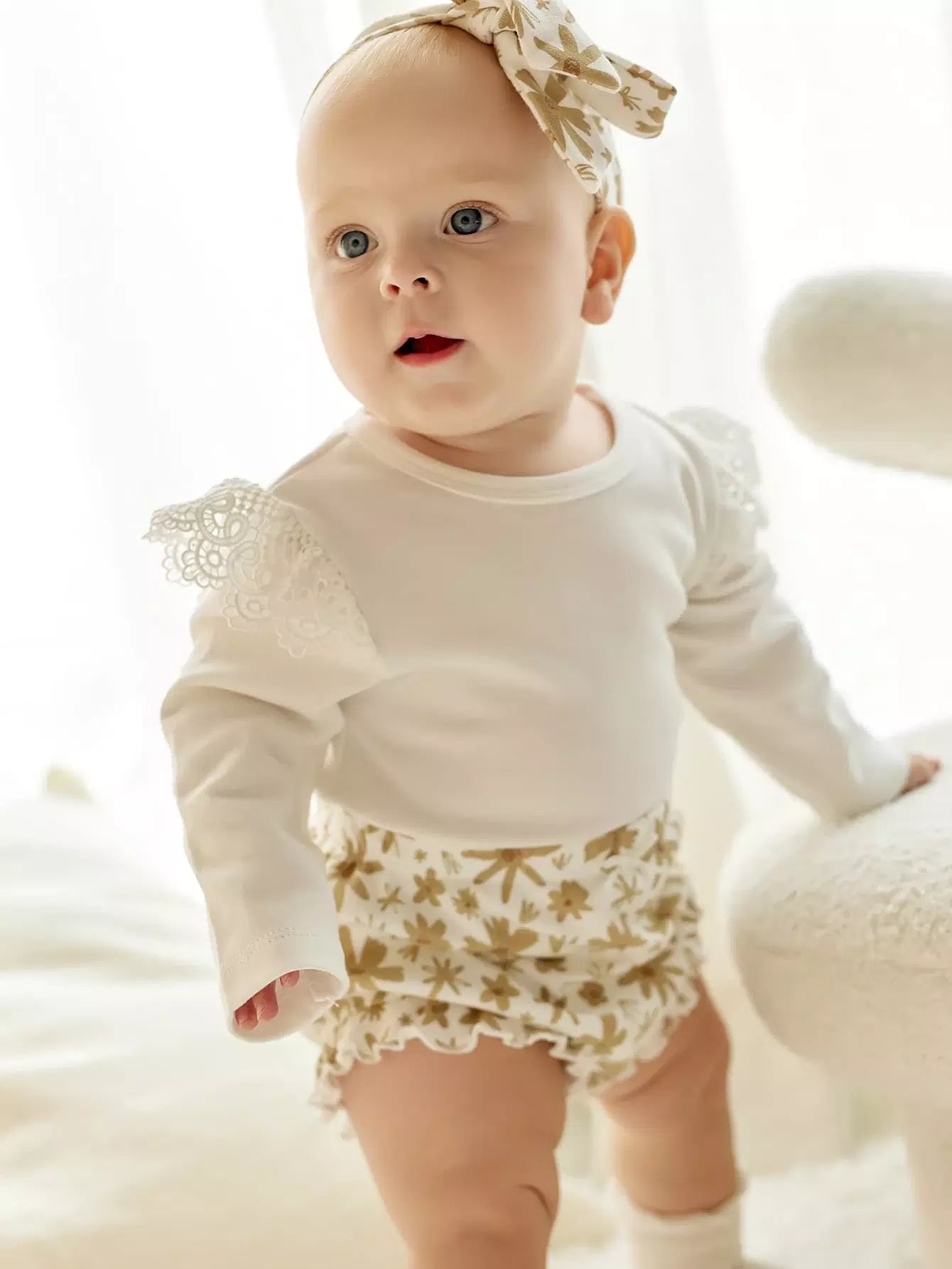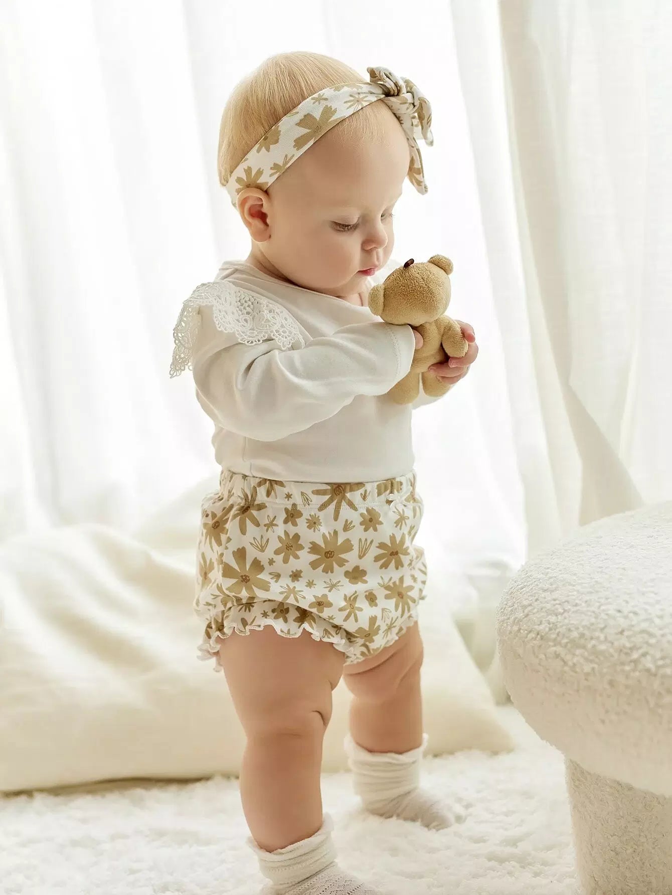 Baby Guipure Lace Insert Bodysuit & Floral Shorts & Headband