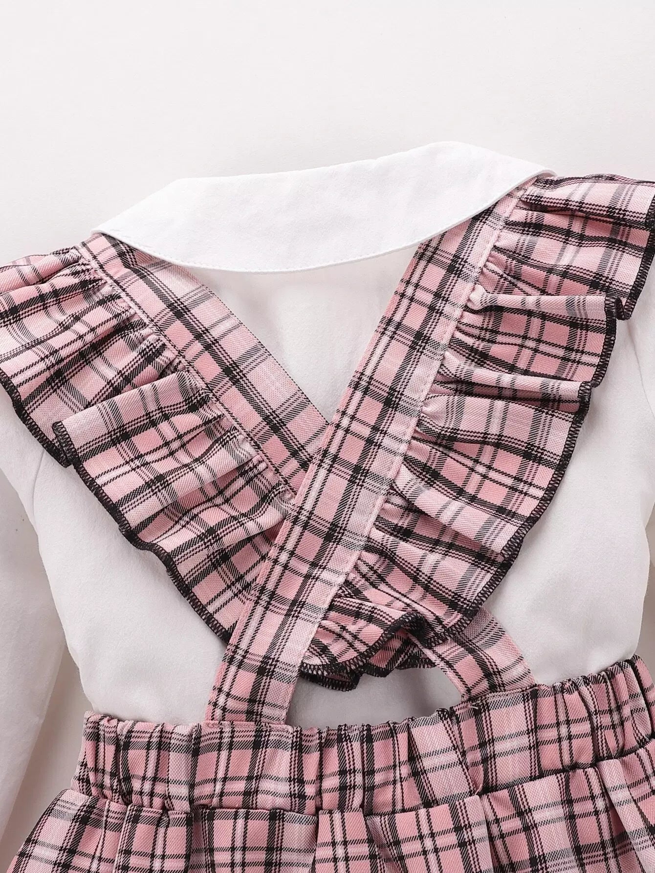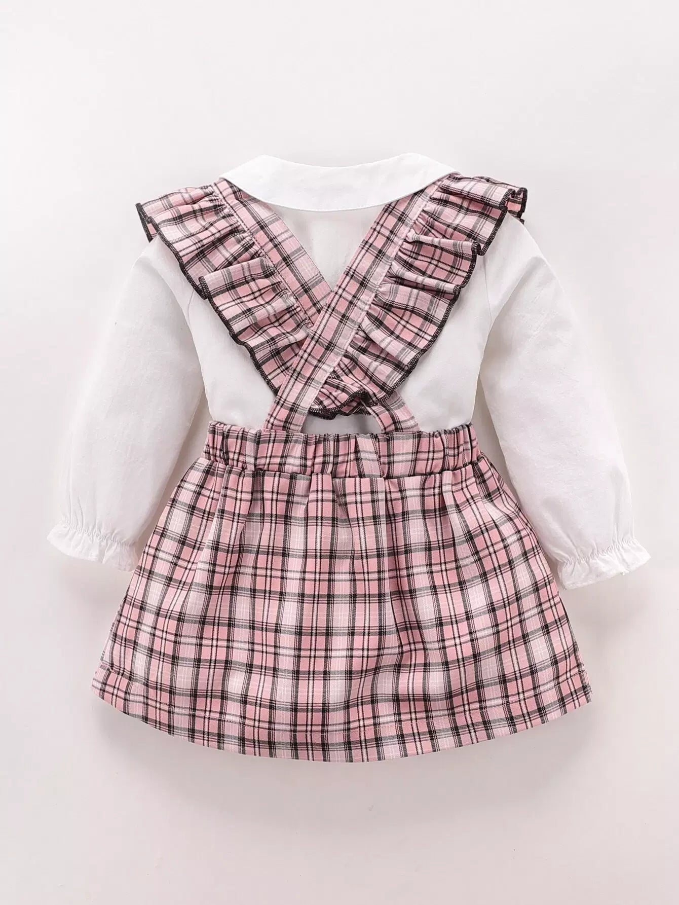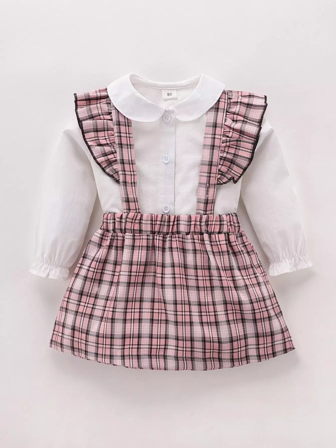 Baby Peter Pan Collar Blouse With Plaid Ruffle Pinafore Skirt