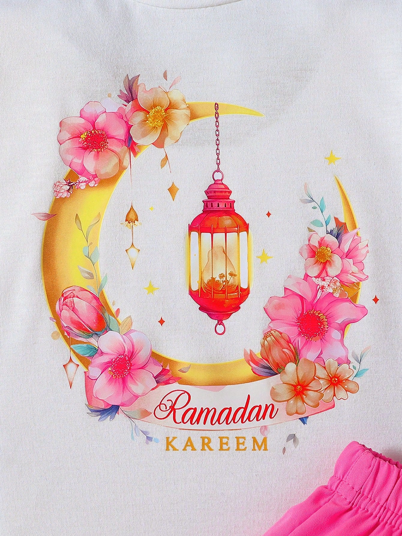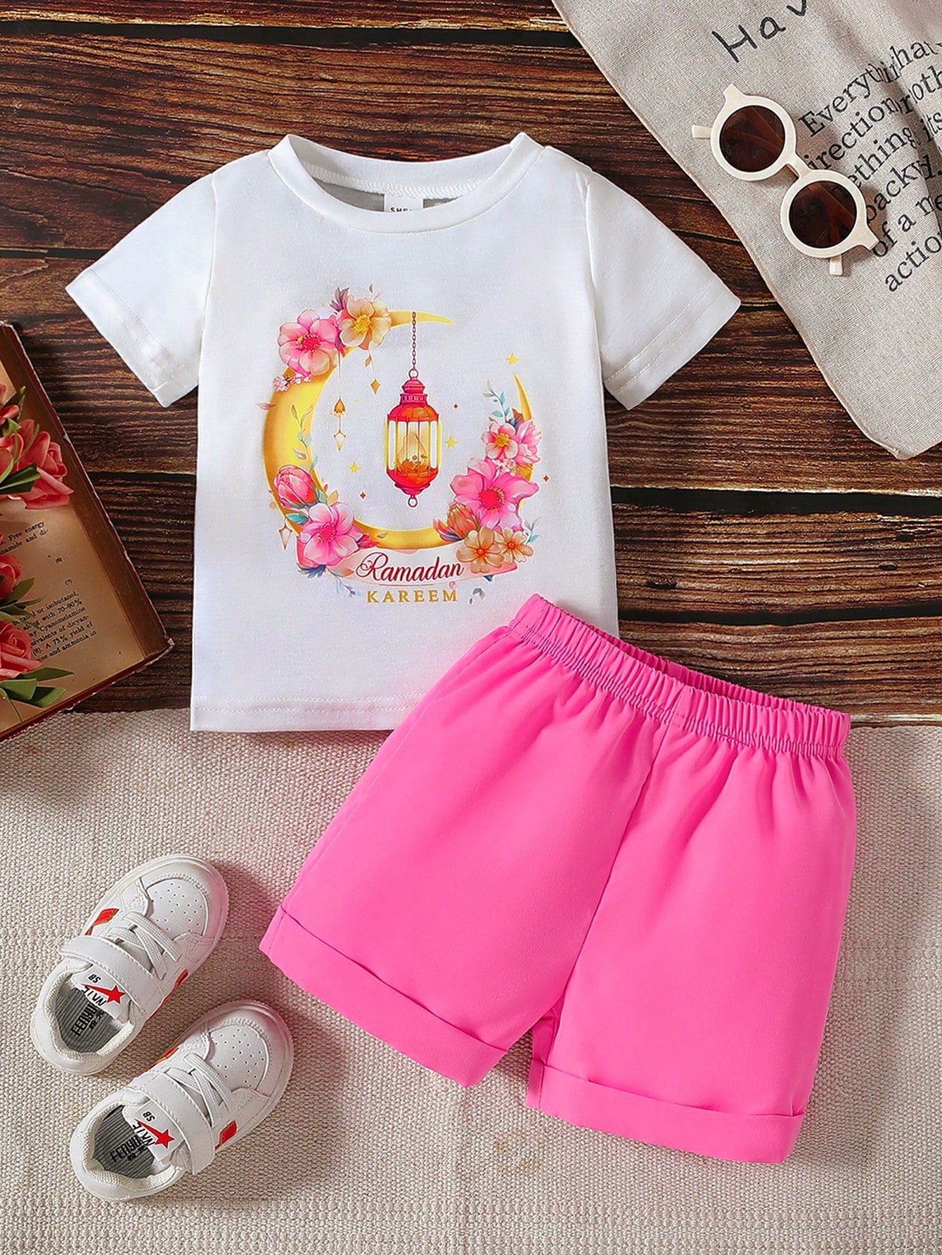 SHEIN Baby Girls Casual Ramadan Print Short Sleeve T-Shirt And Shorts Set