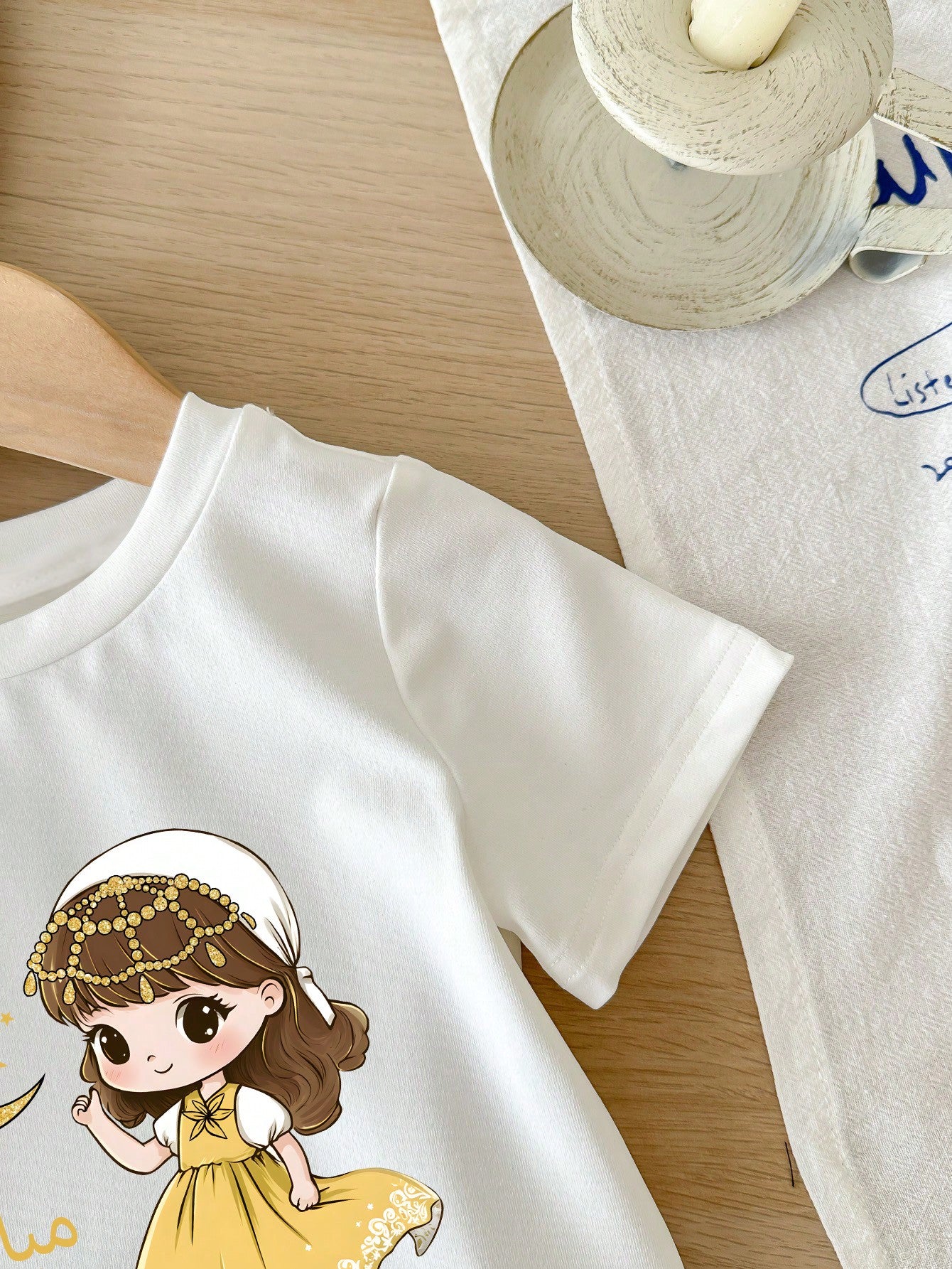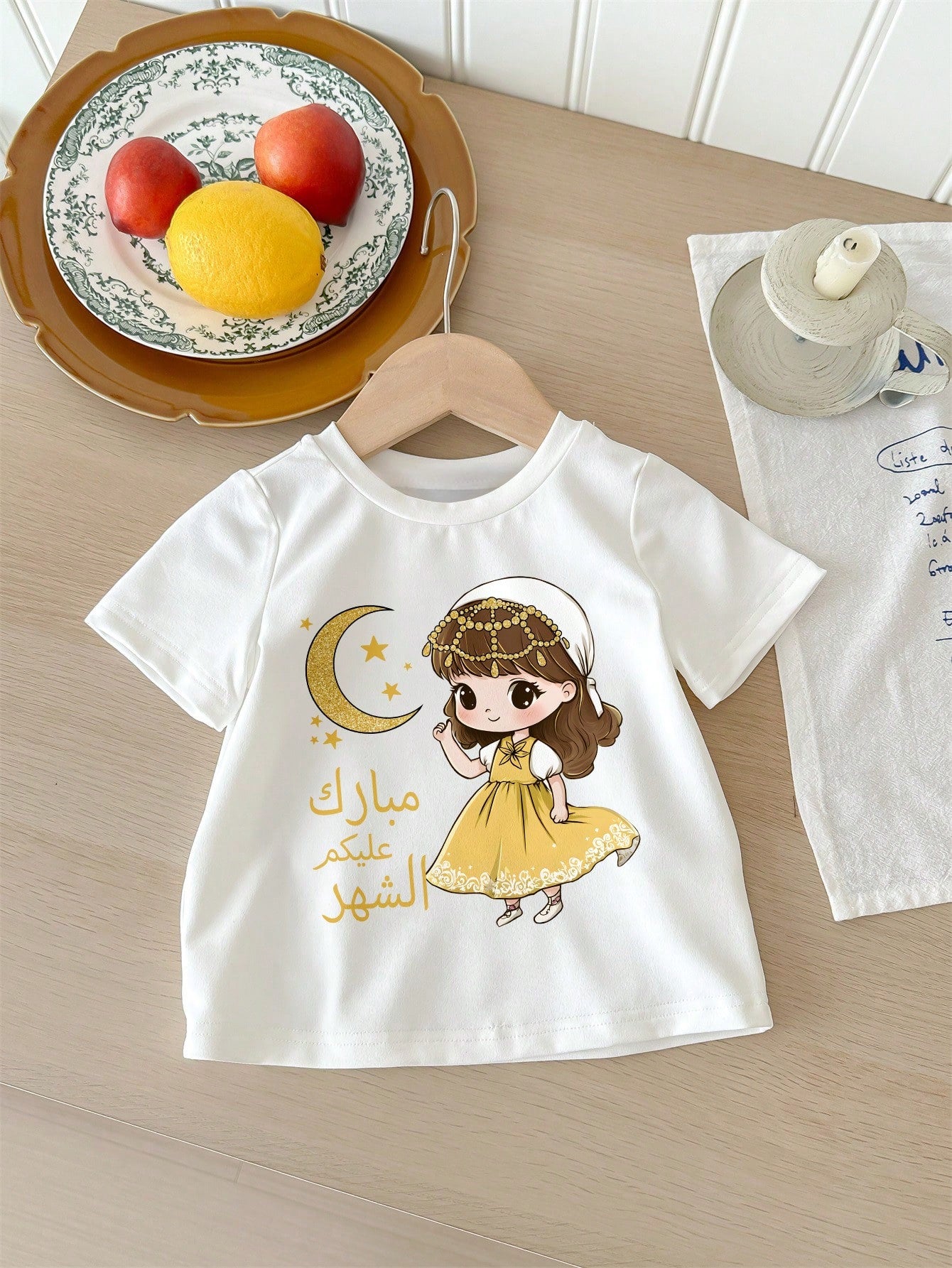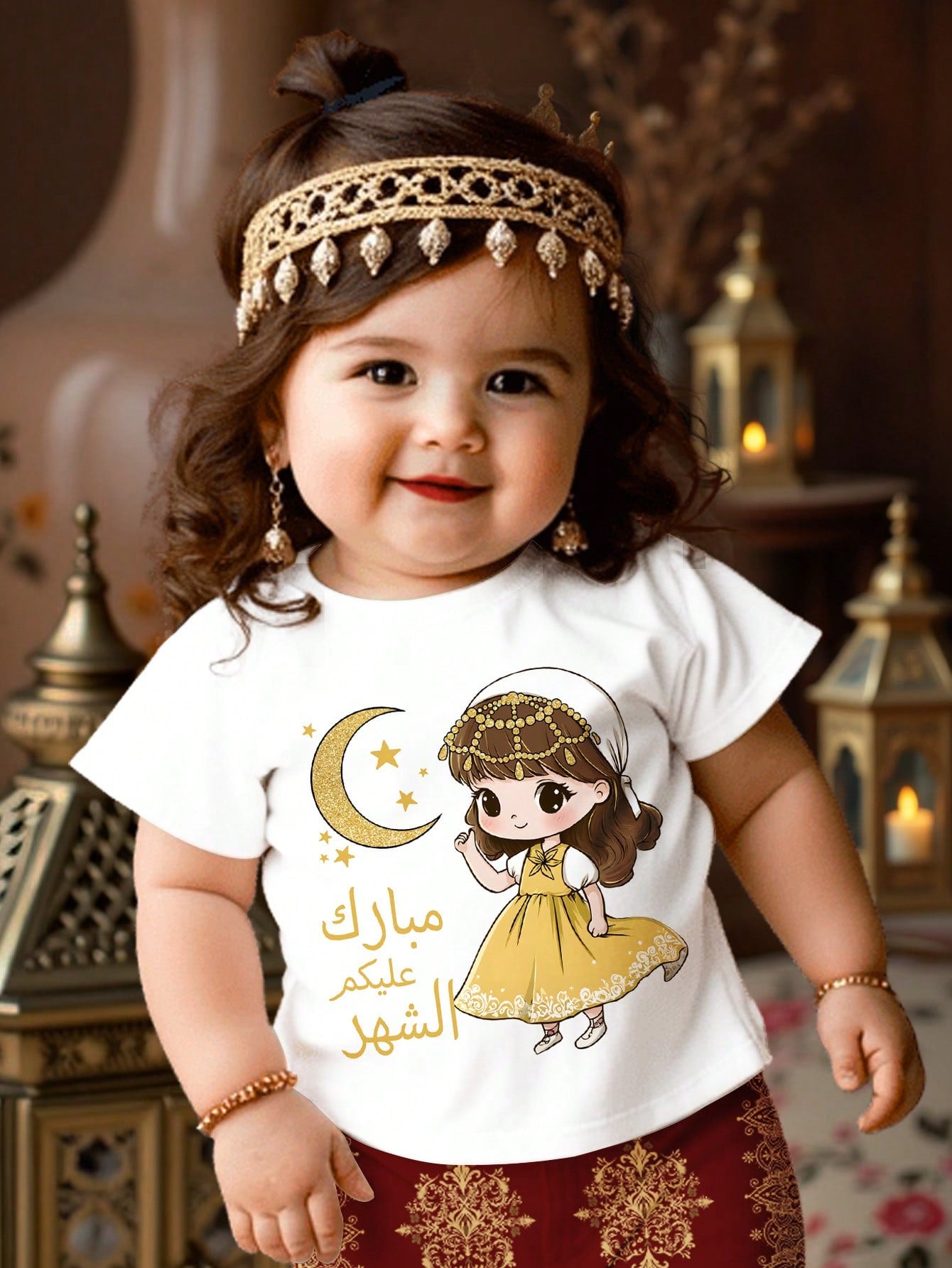 Girl's Ramadan Crescent Moon & Star Print Casual Short Sleeve Crew Neck Top, Summer
