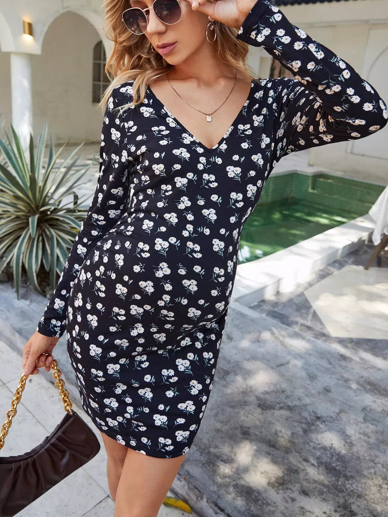 Maternity Floral Print Plunging Neck Bodycon Dress