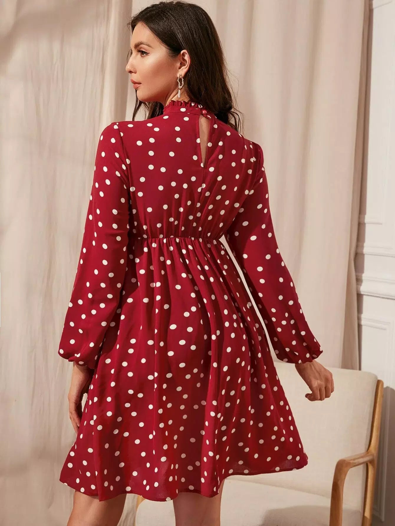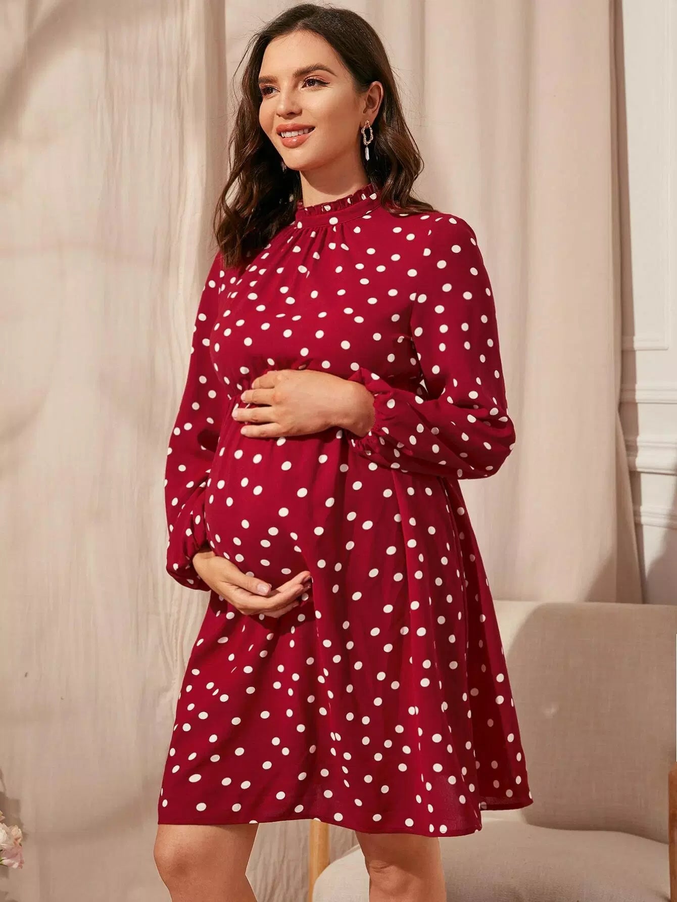 Maternity Frill Neck Bishop Sleeve Polka Dot Dress