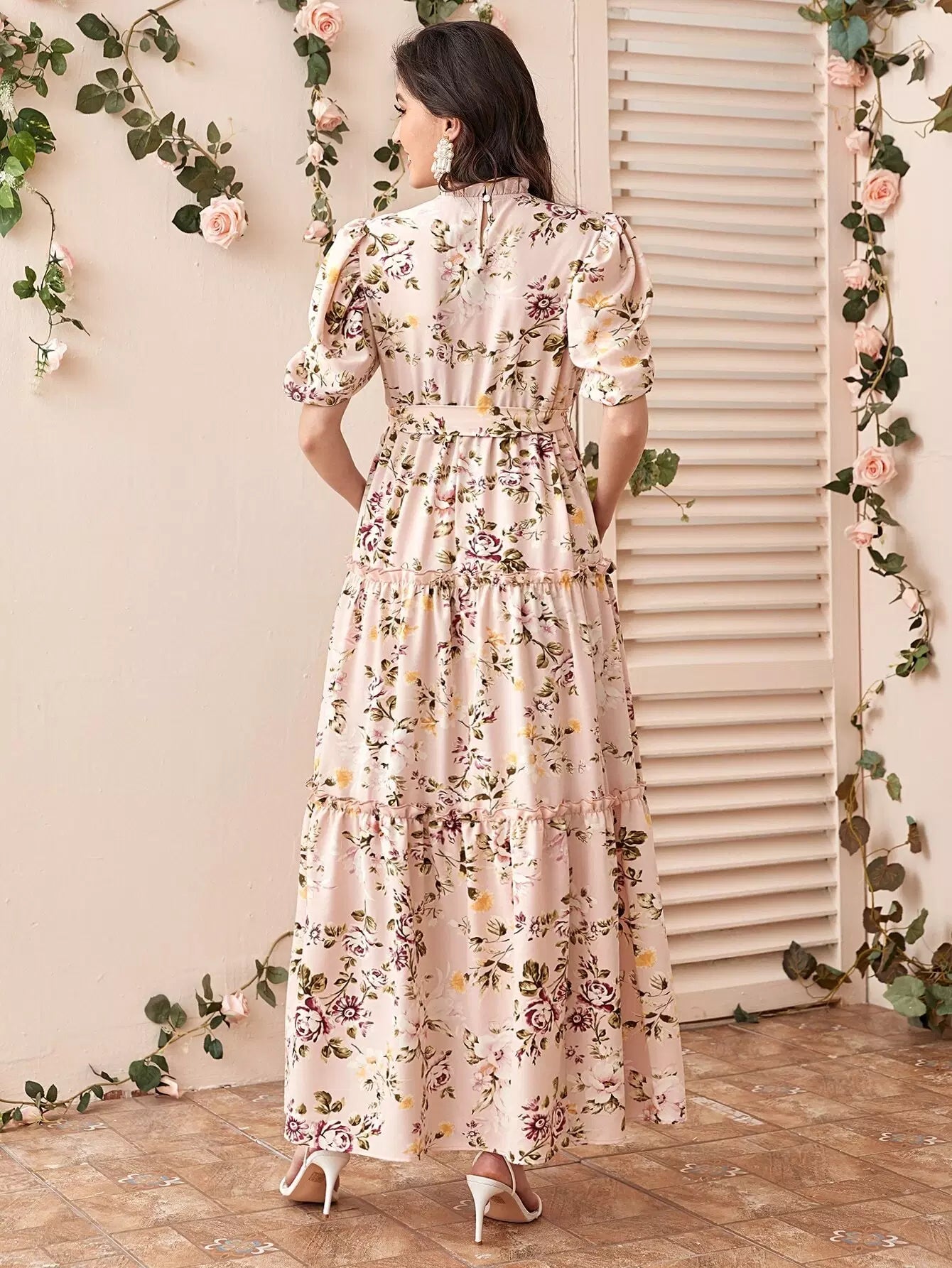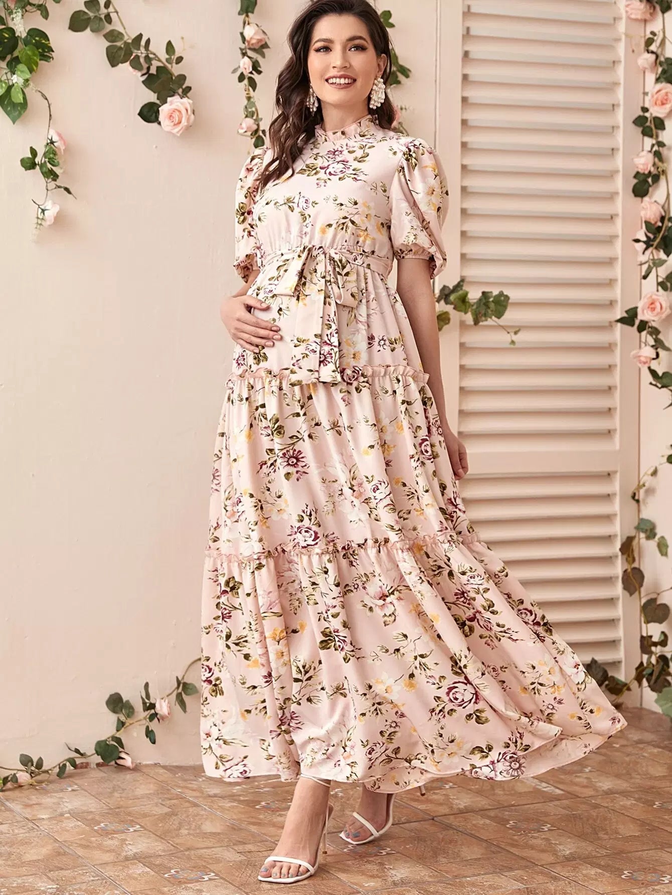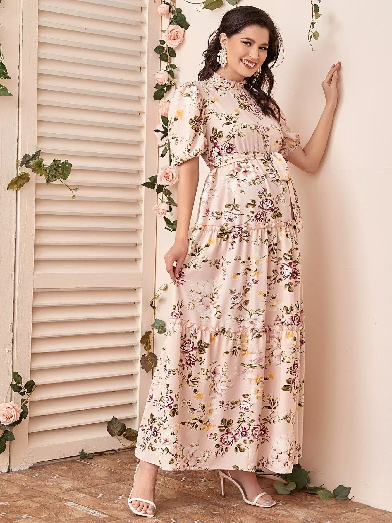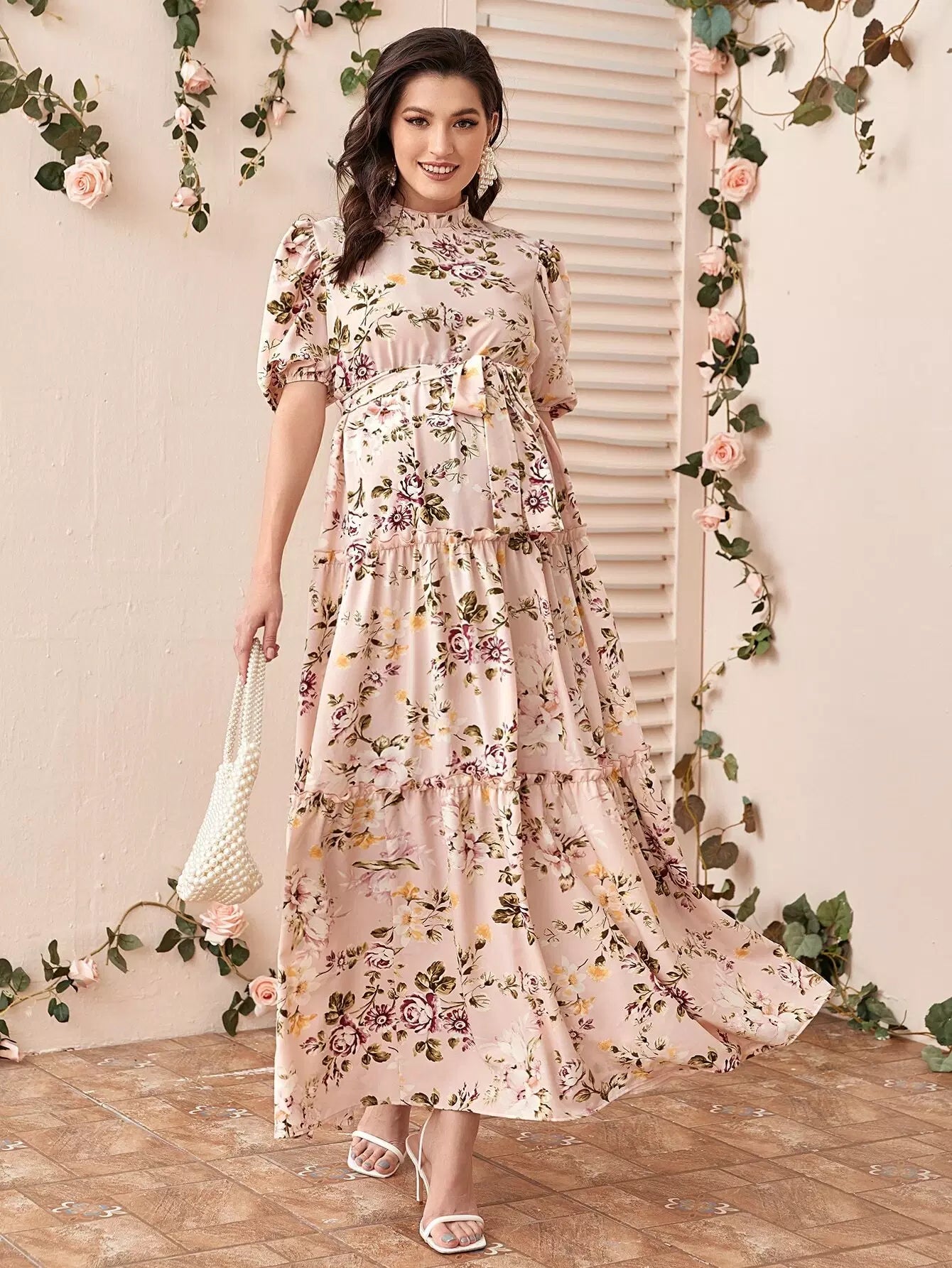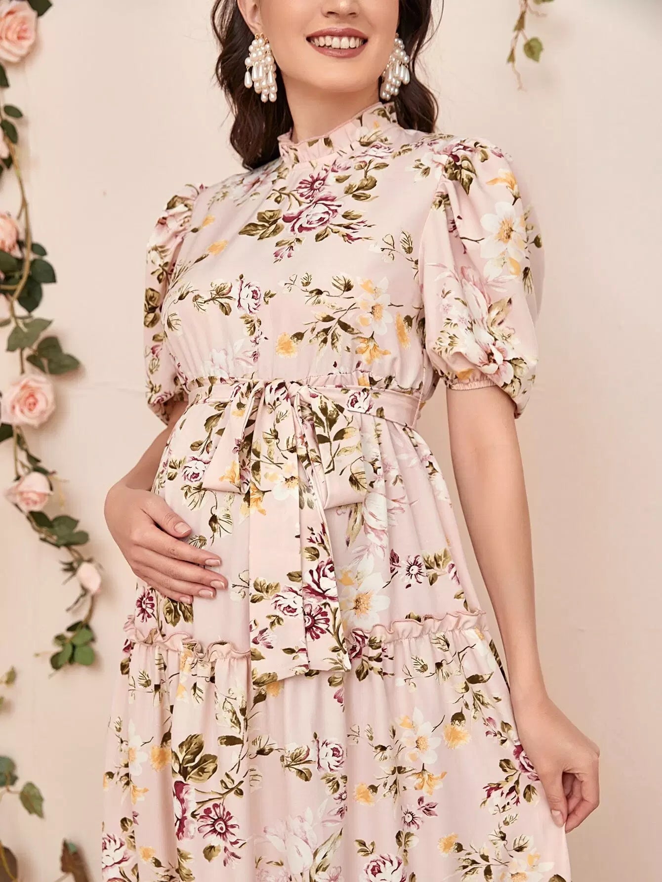 Maternity Puff Sleeve Layered Frill Trim Floral Dress Without Belt