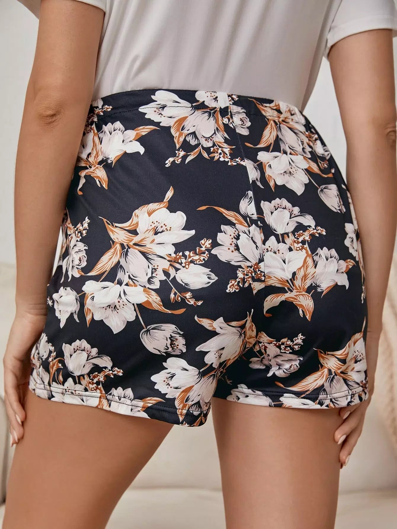 Maternity Solid Tee & Floral Print Knot Front Shorts Lounge Set