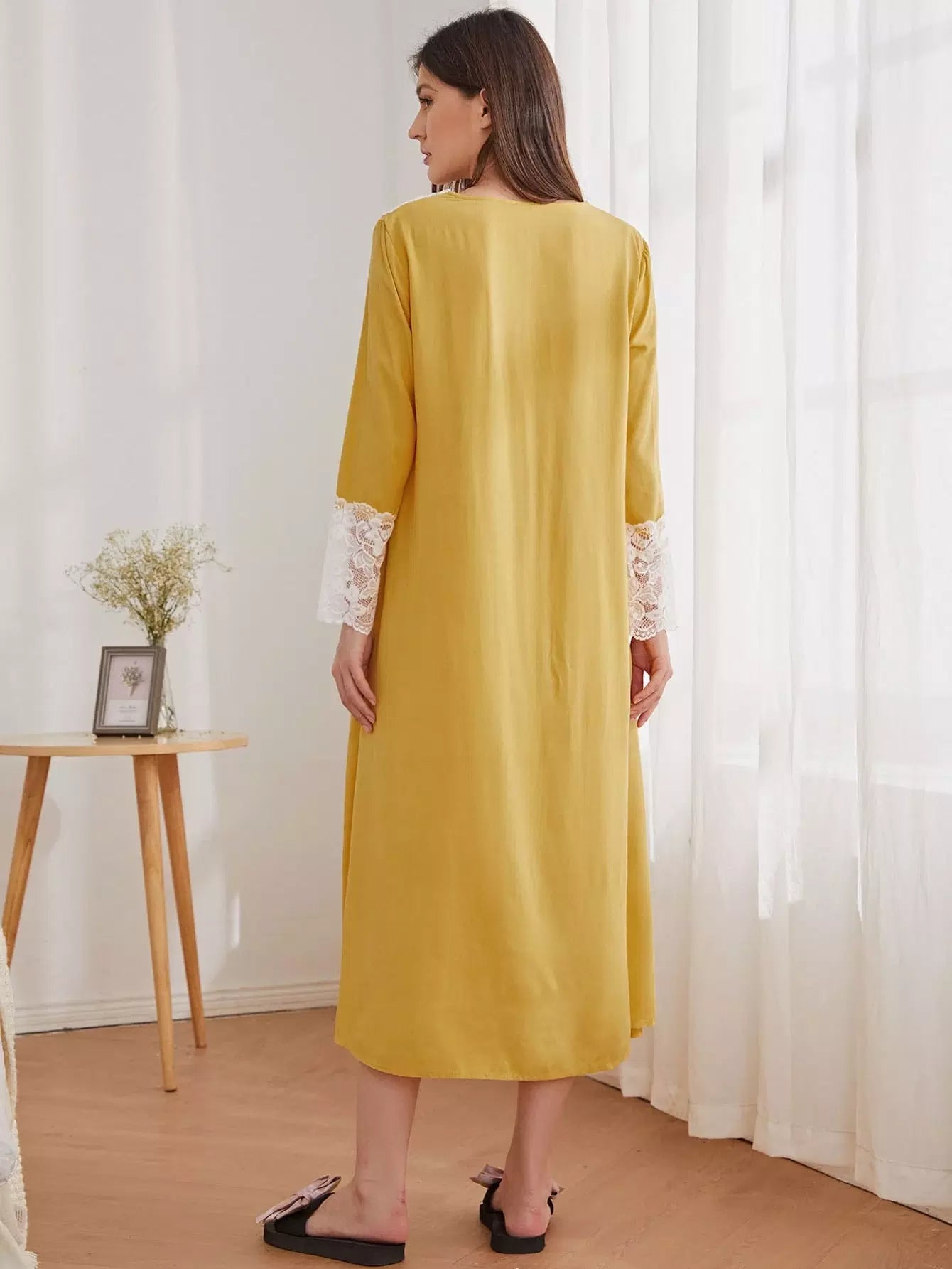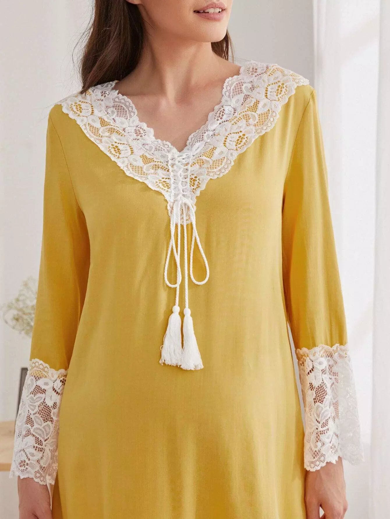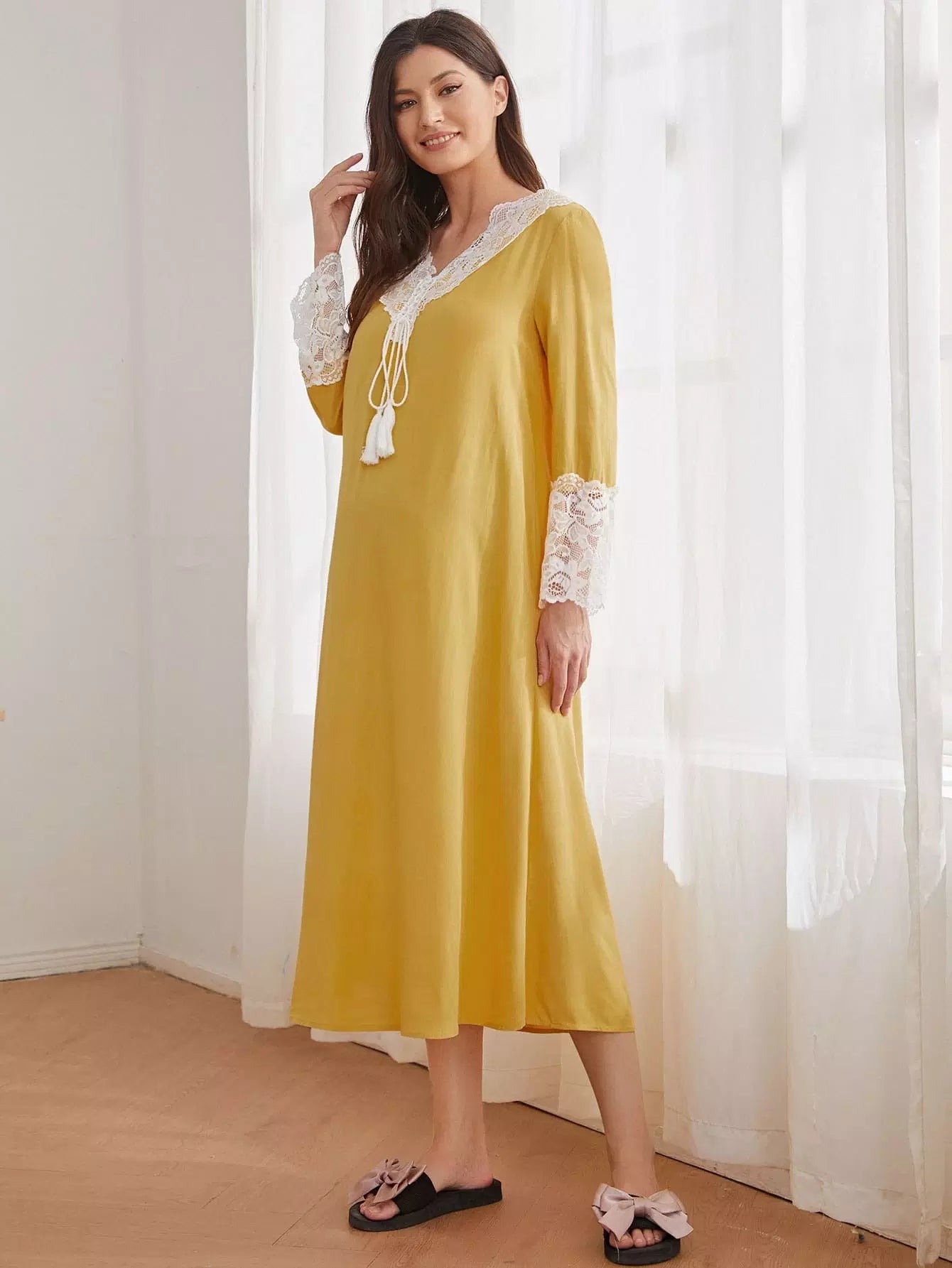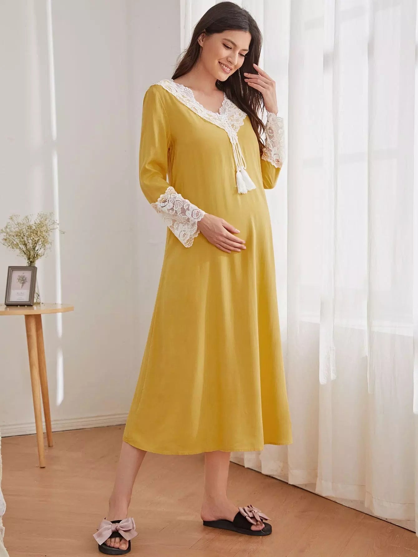 Maternity Tie Front Fringe Lace Trimed Lounge Dress