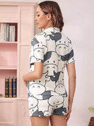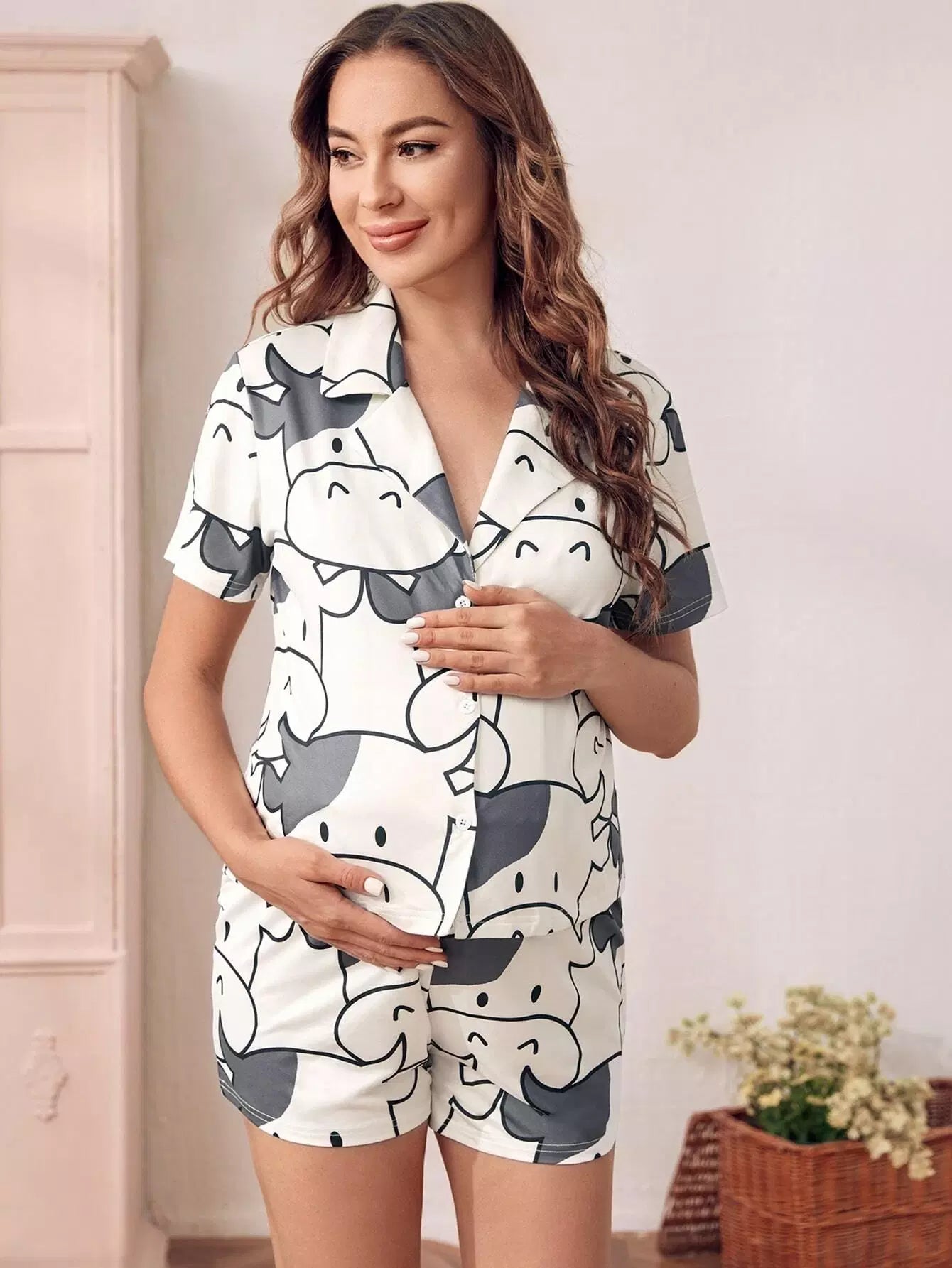 Maternity Cartoon Cow Print Blouse & Adjustable Waist Shorts Lounge Set