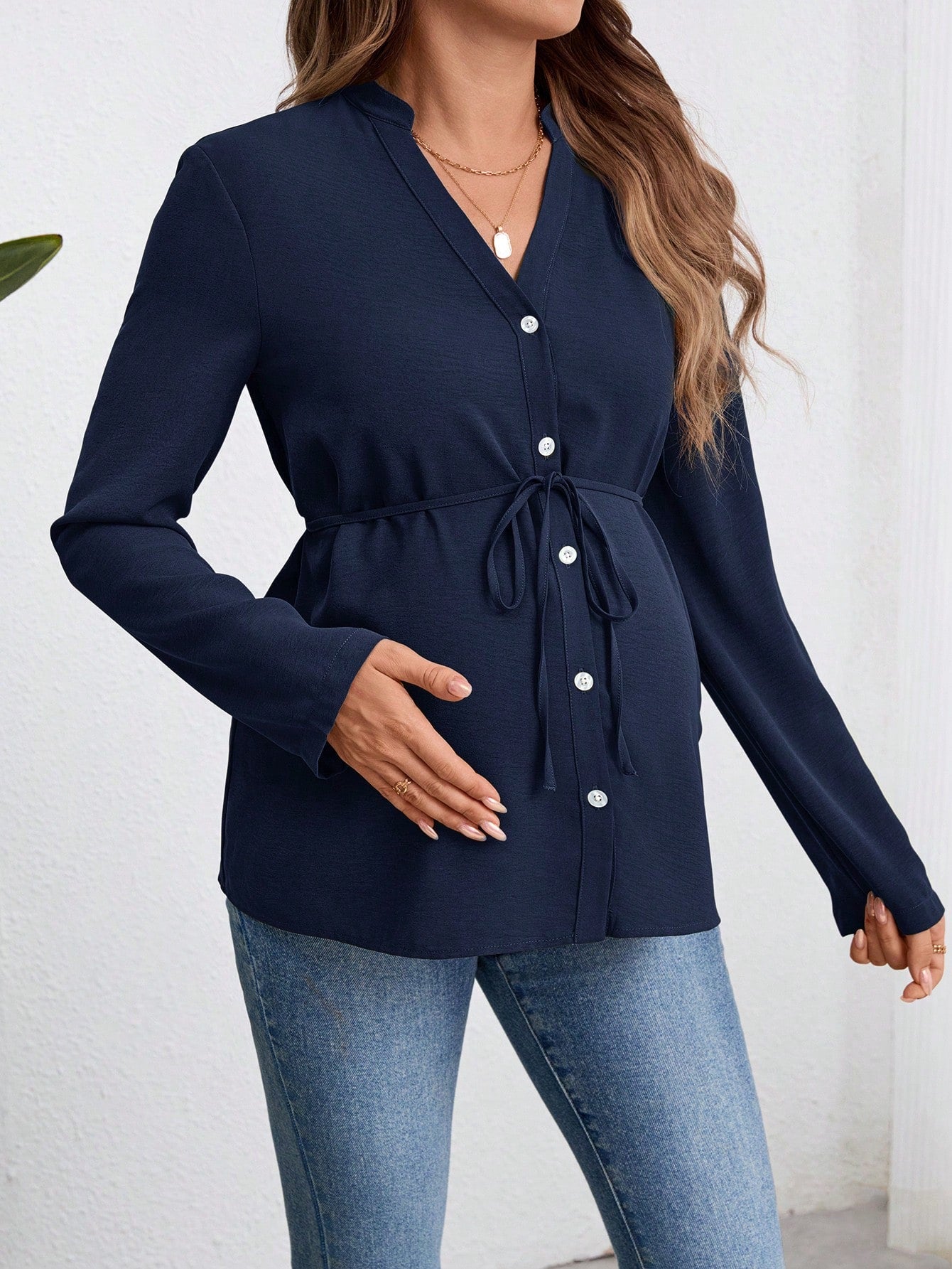 Maternity Women Long Sleeve Shirt - Military Green Button-Down Blouse