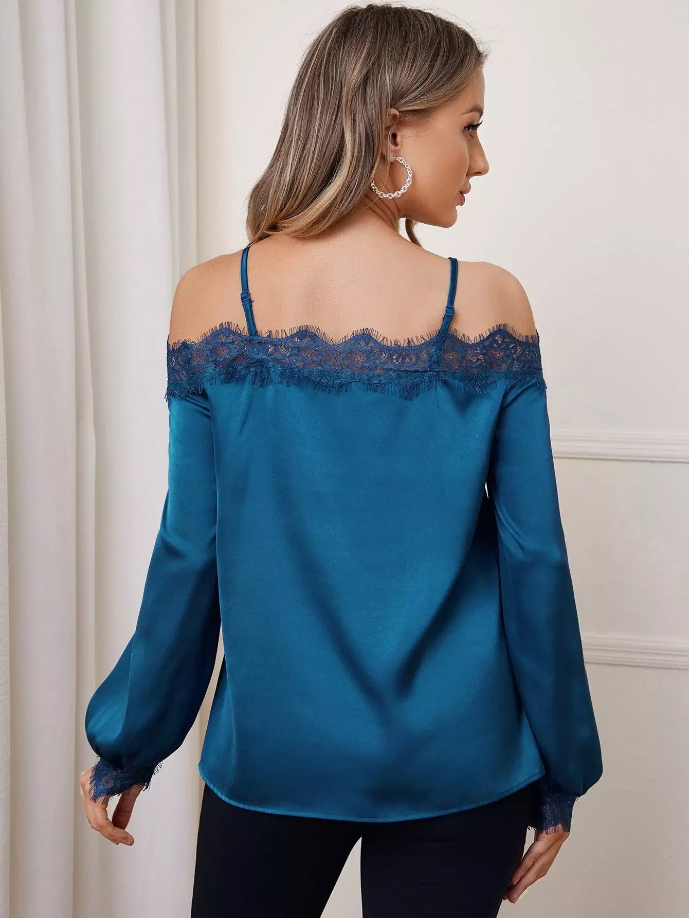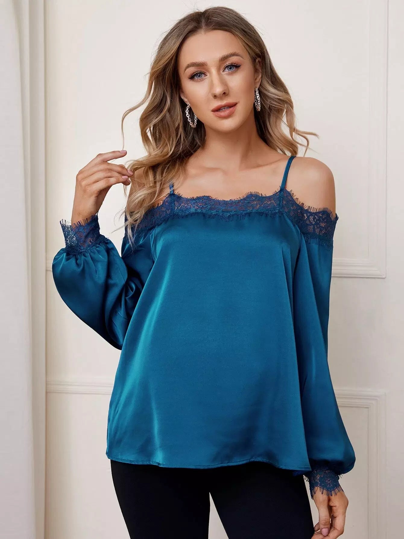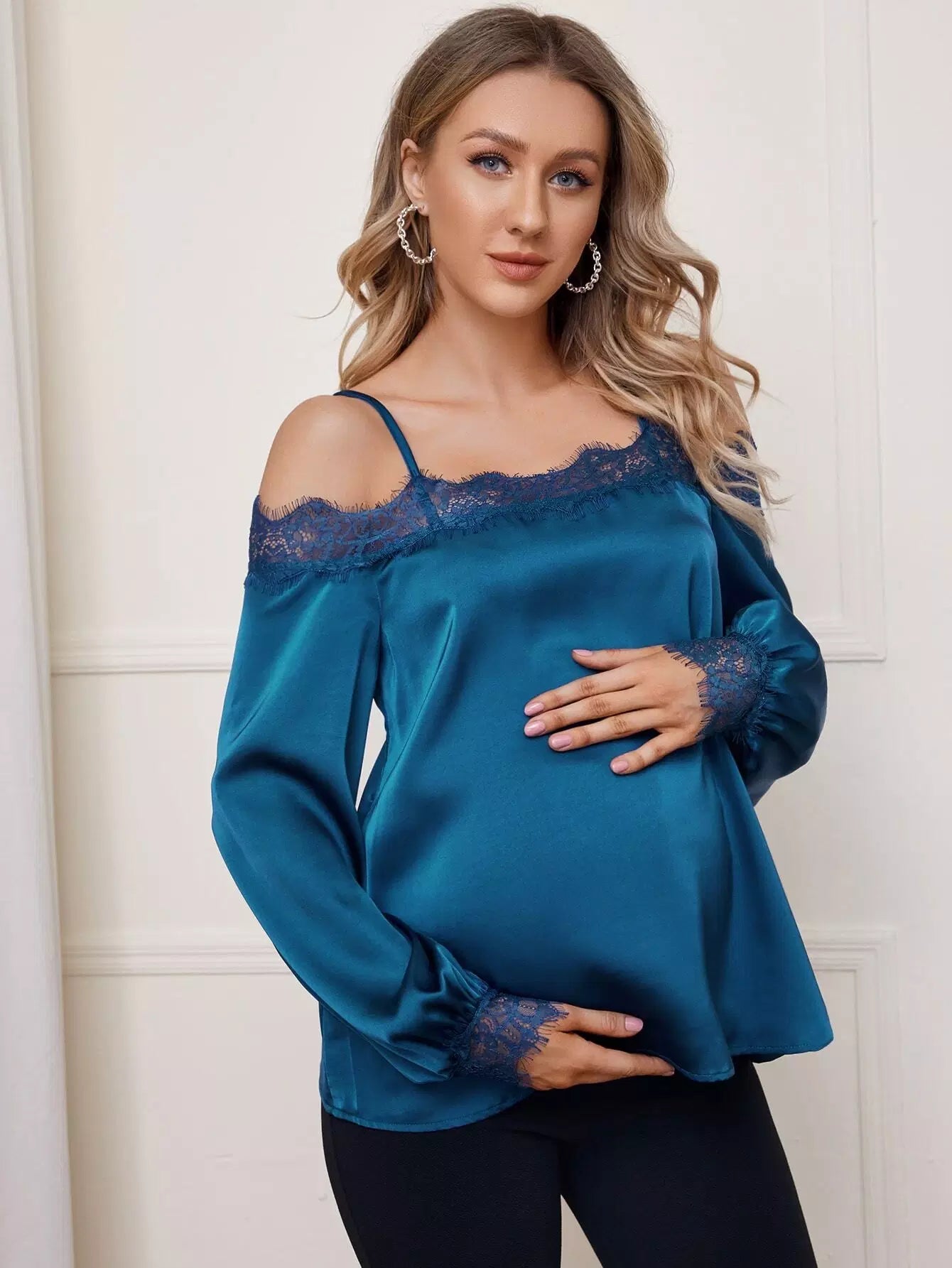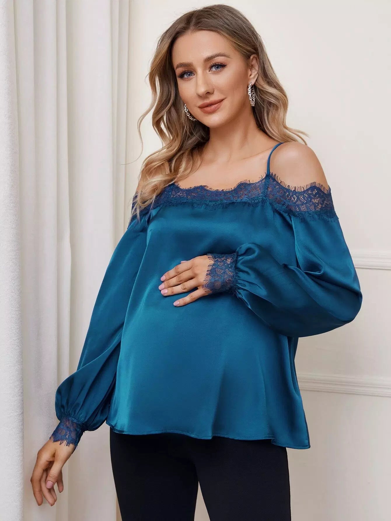 Maternity Cold Shoulder Eyelash Lace Satin Top