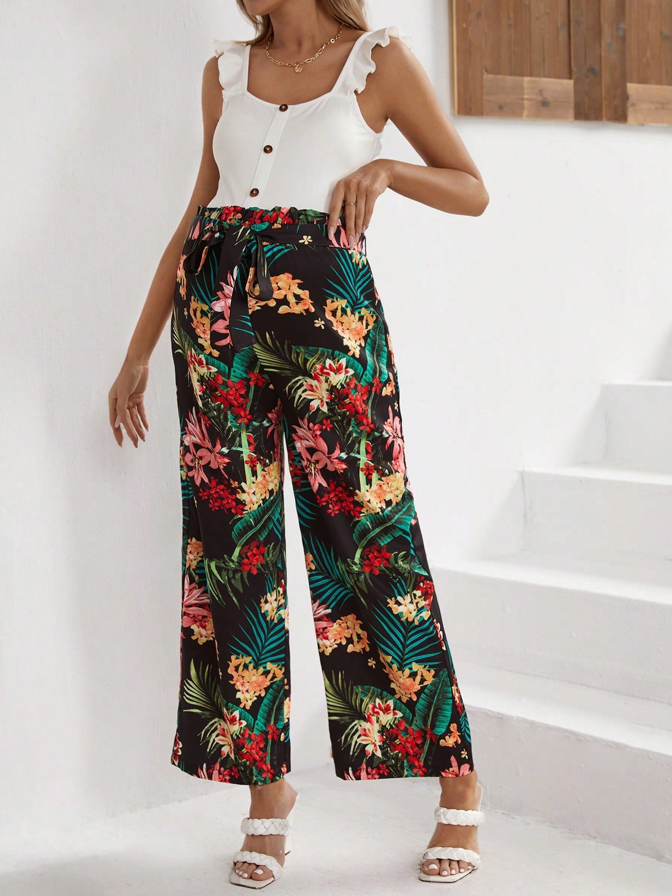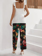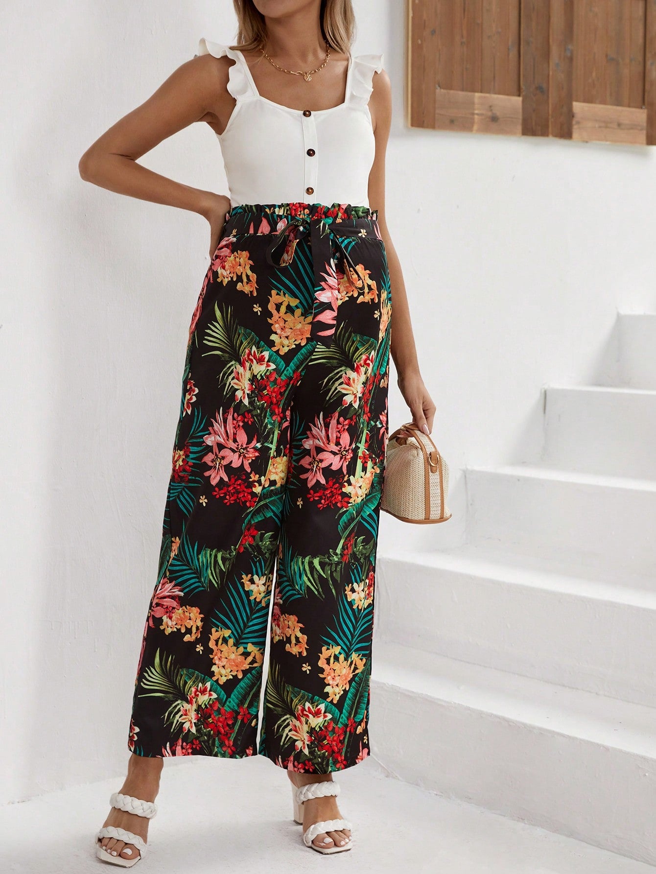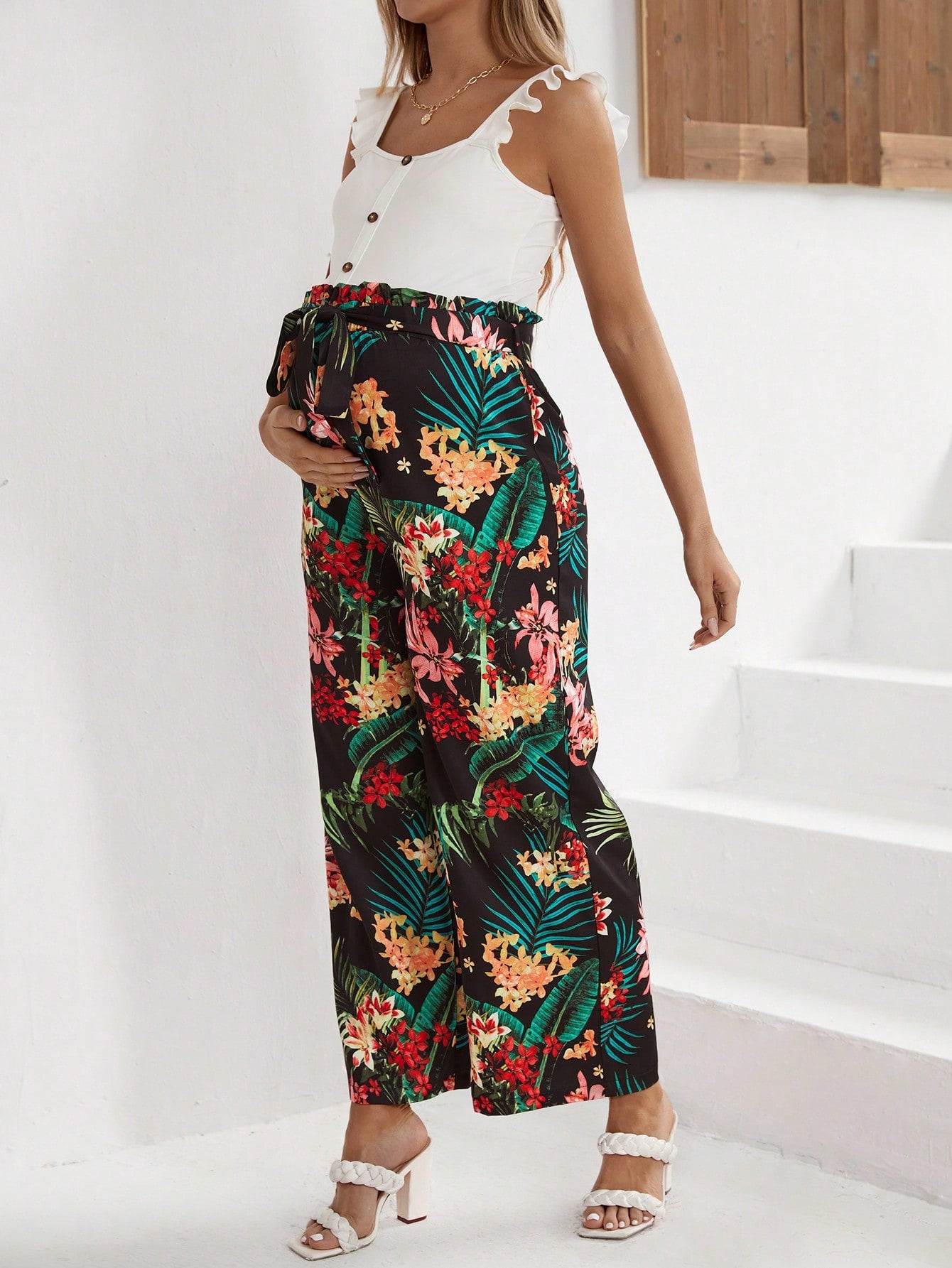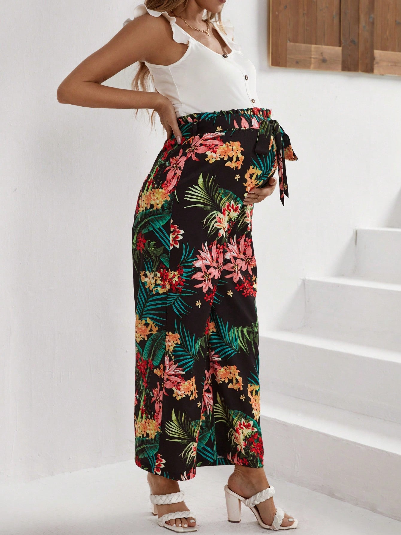 Maternity Elegant Commuter Tight Flounce Sleeve Tank Top And Floral Printed Adjustable Elastic Waist
