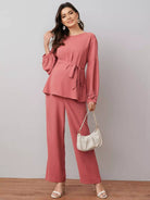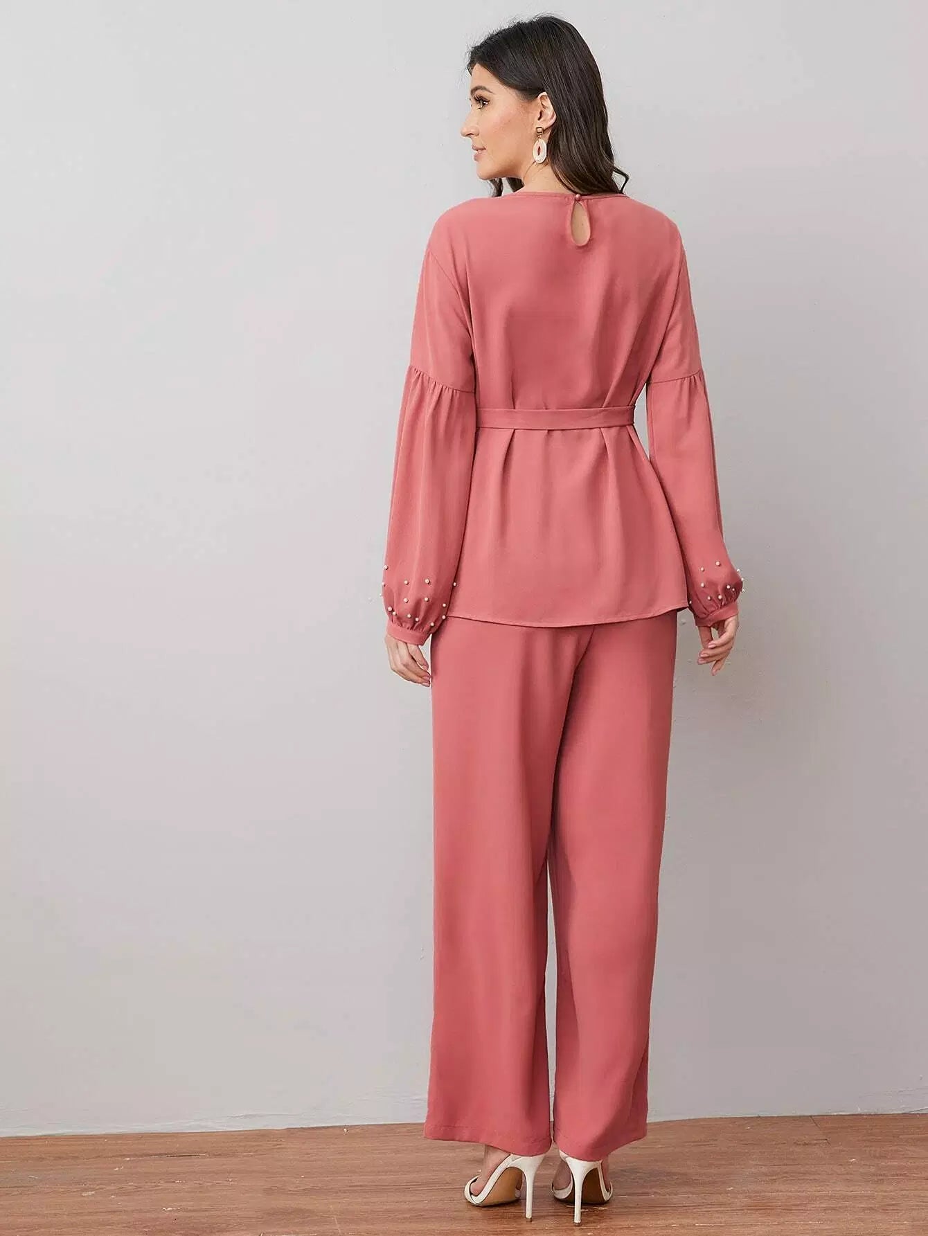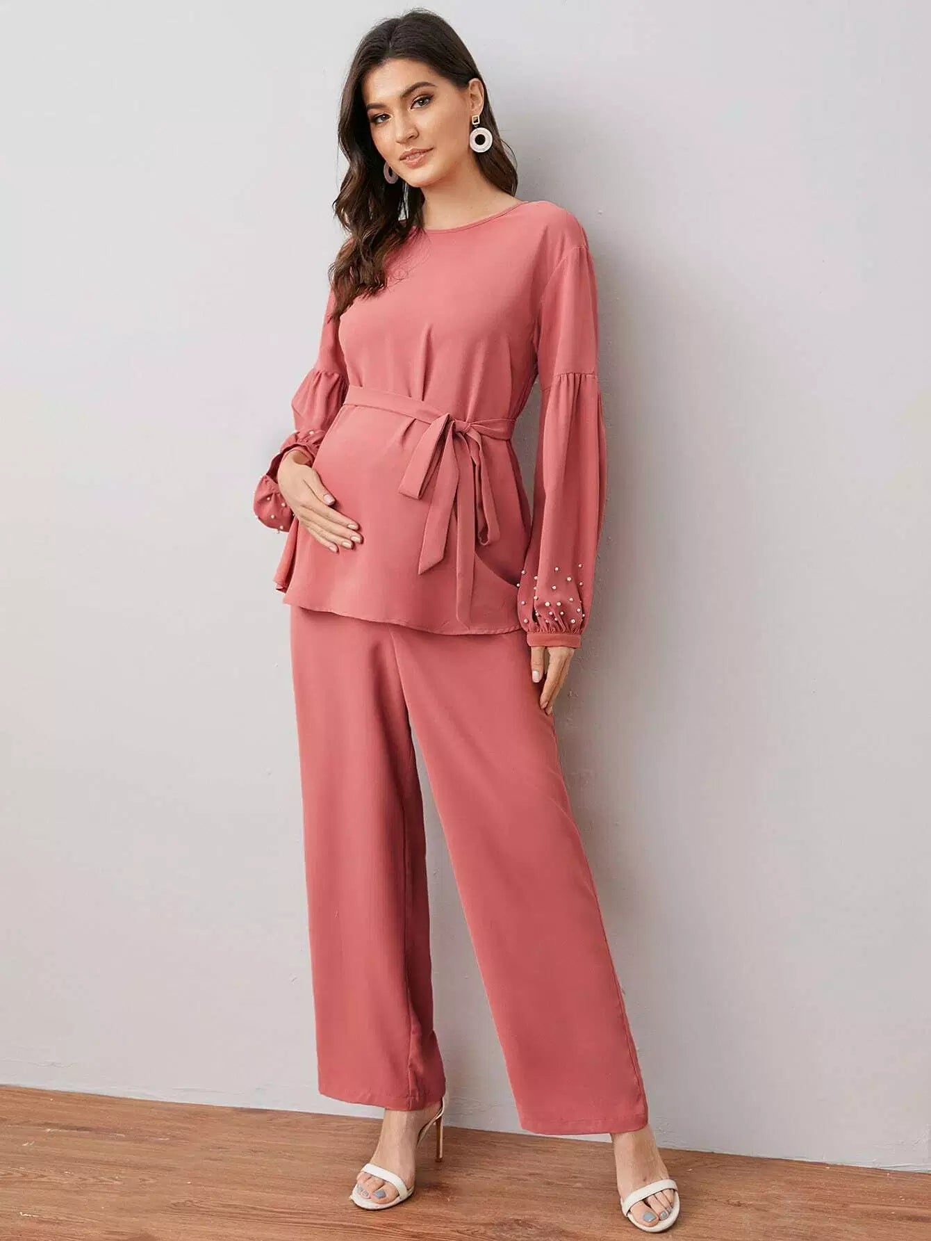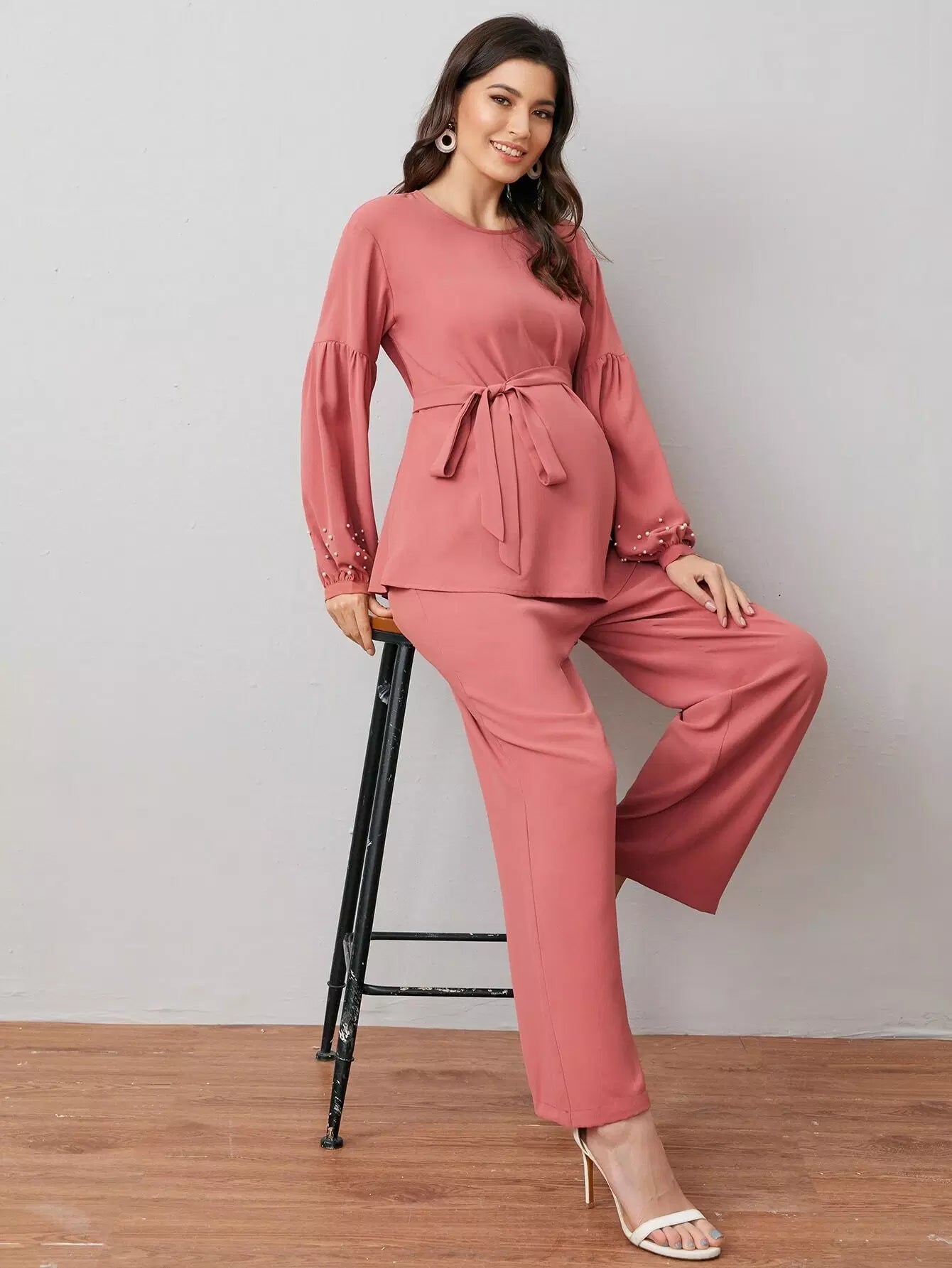 Maternity Pearl Beaded Self Top and Pants Set Without Belt