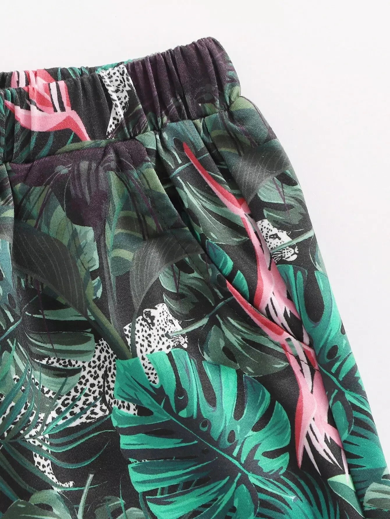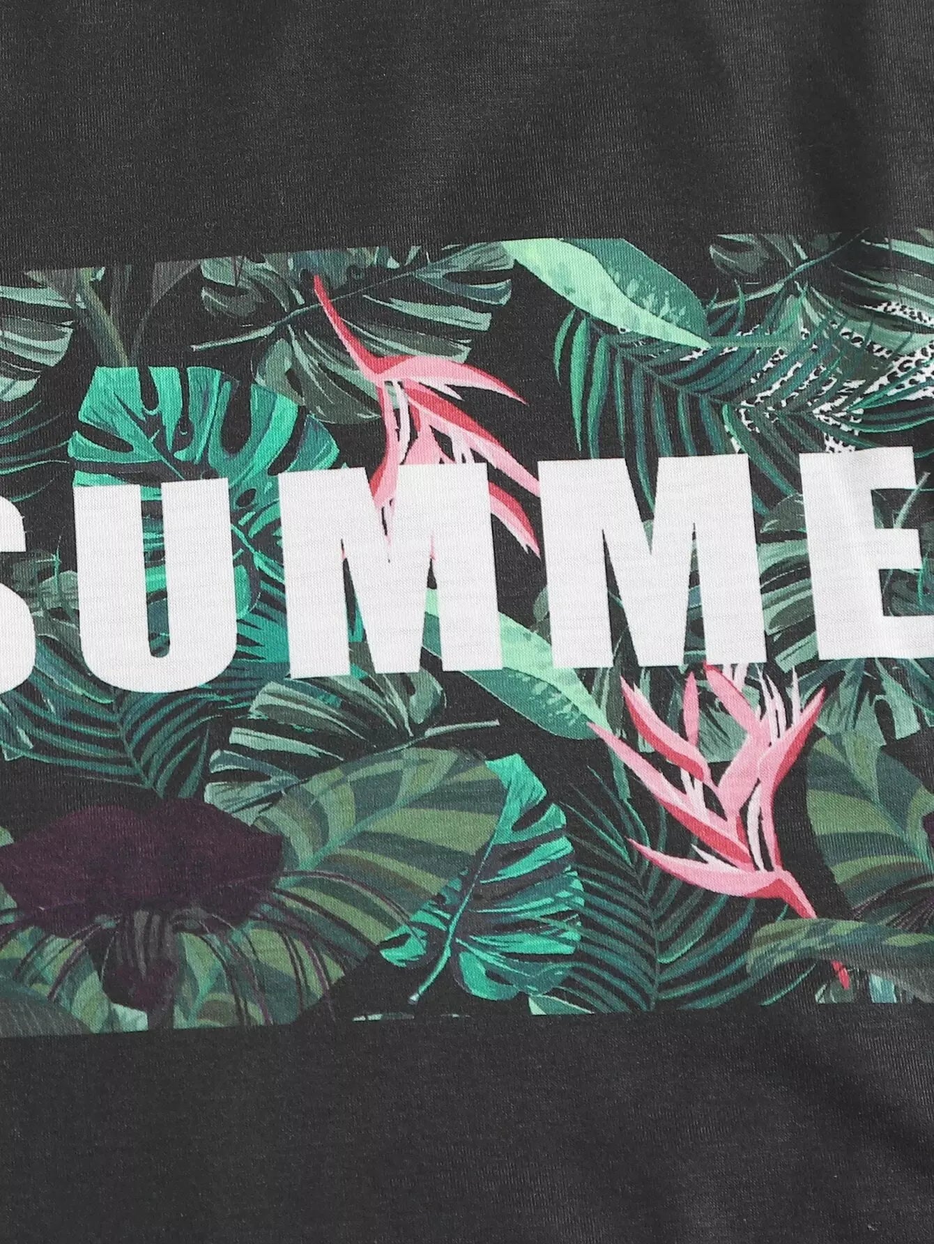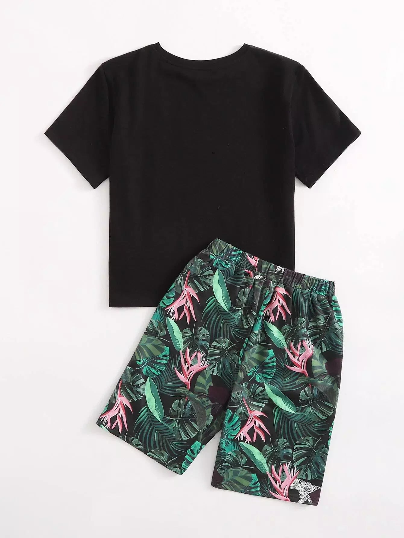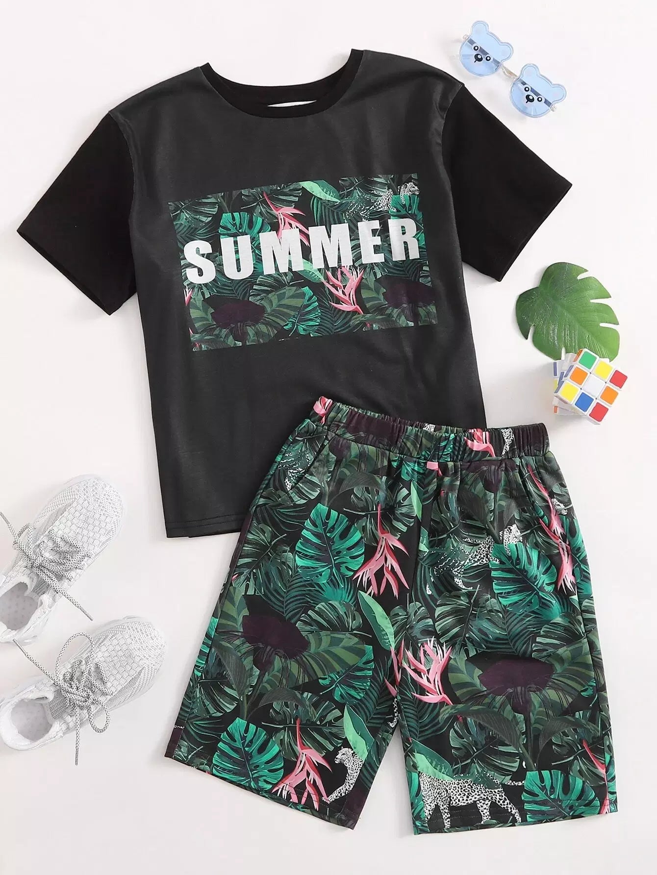 Boys Letter Graphic Tee & Allover Tropical Print Shorts Set