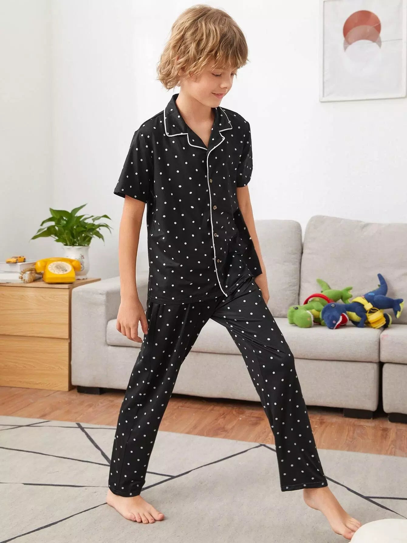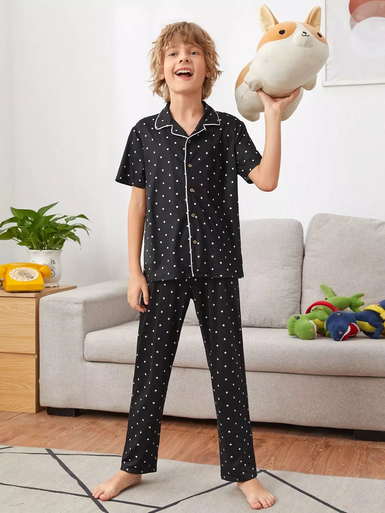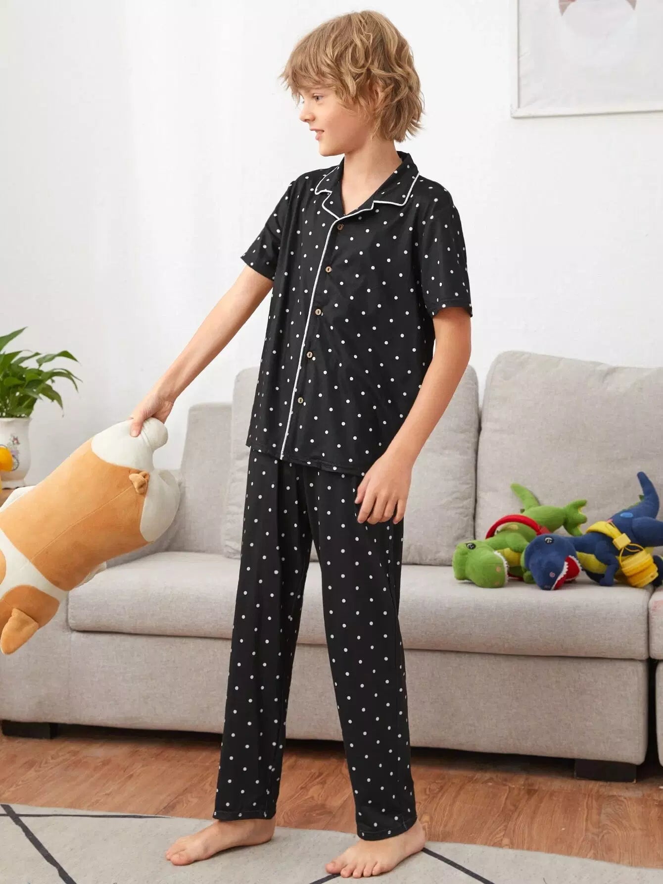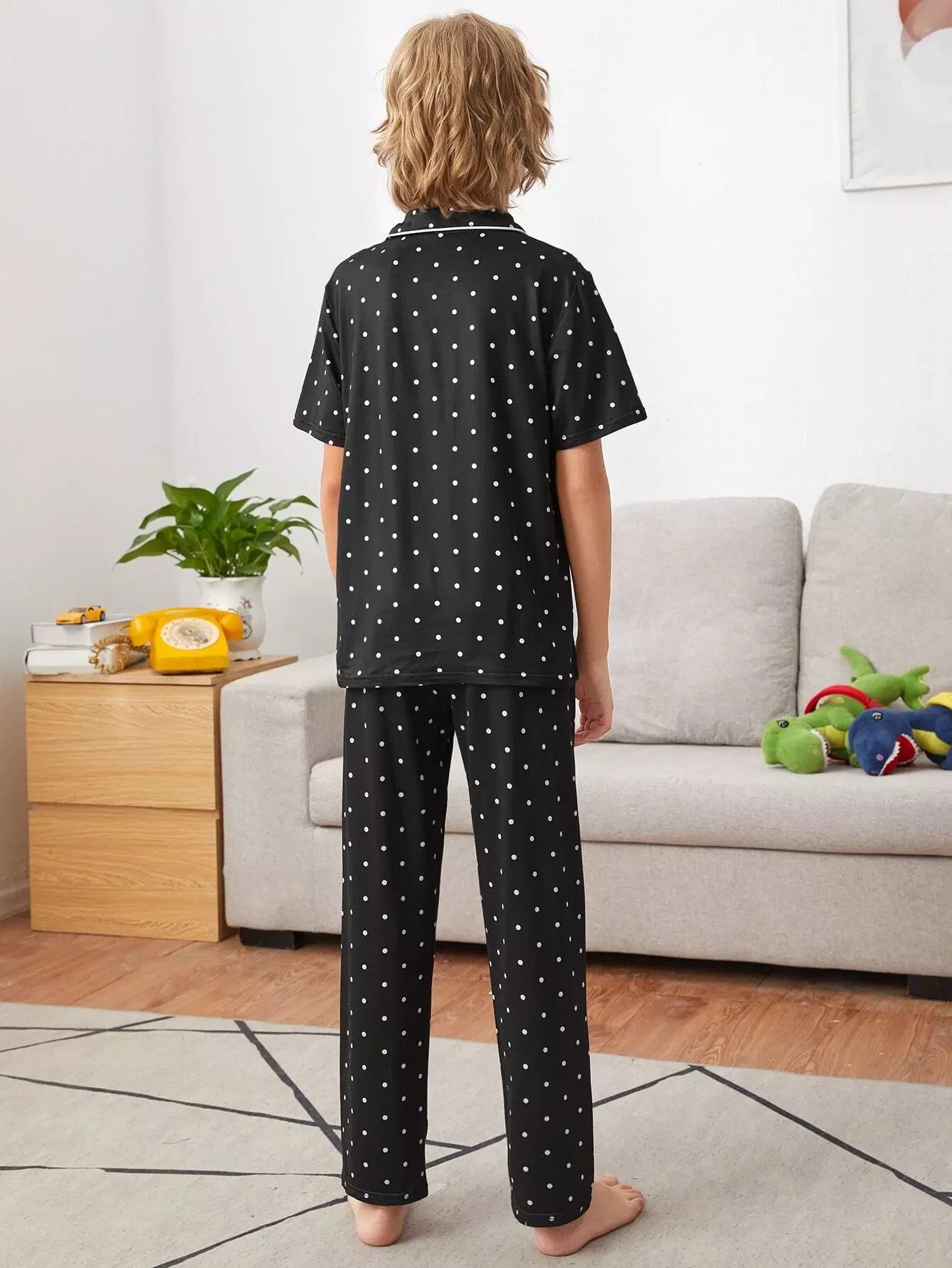 Boys Polka Dot Contrast Piping Shirt & Pants PJ Set