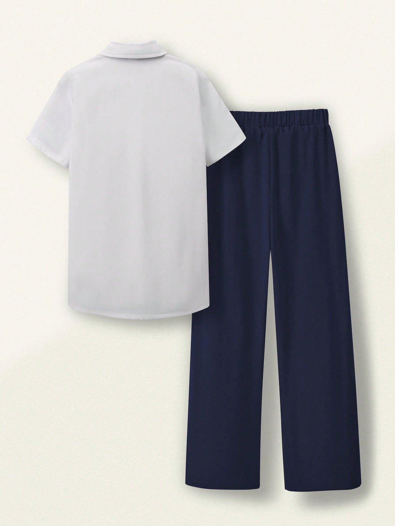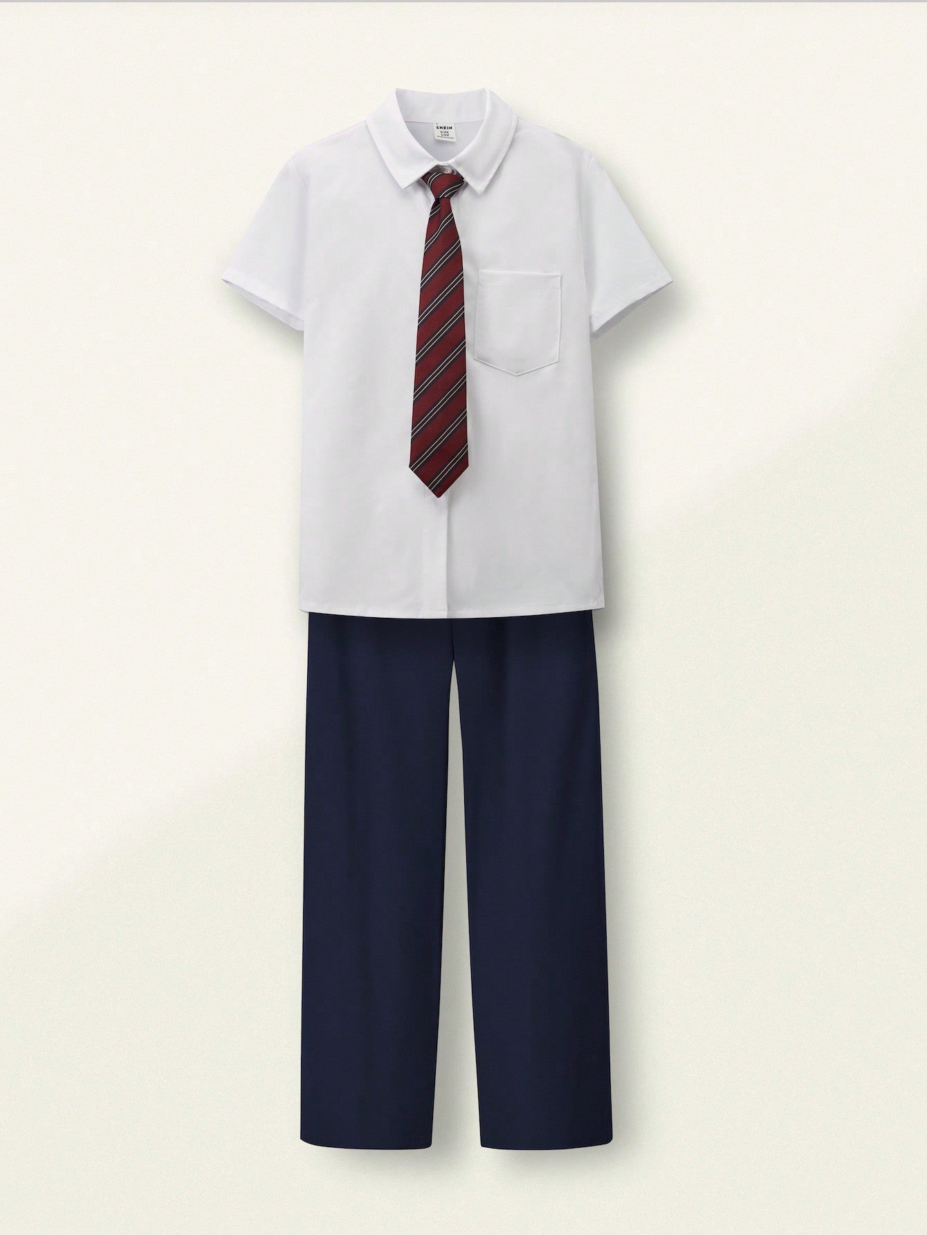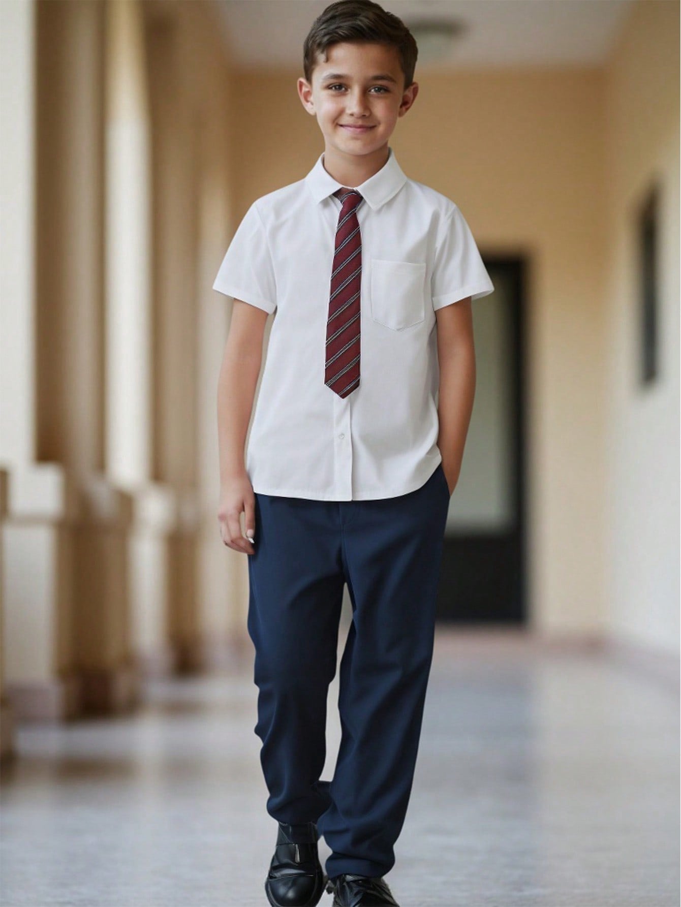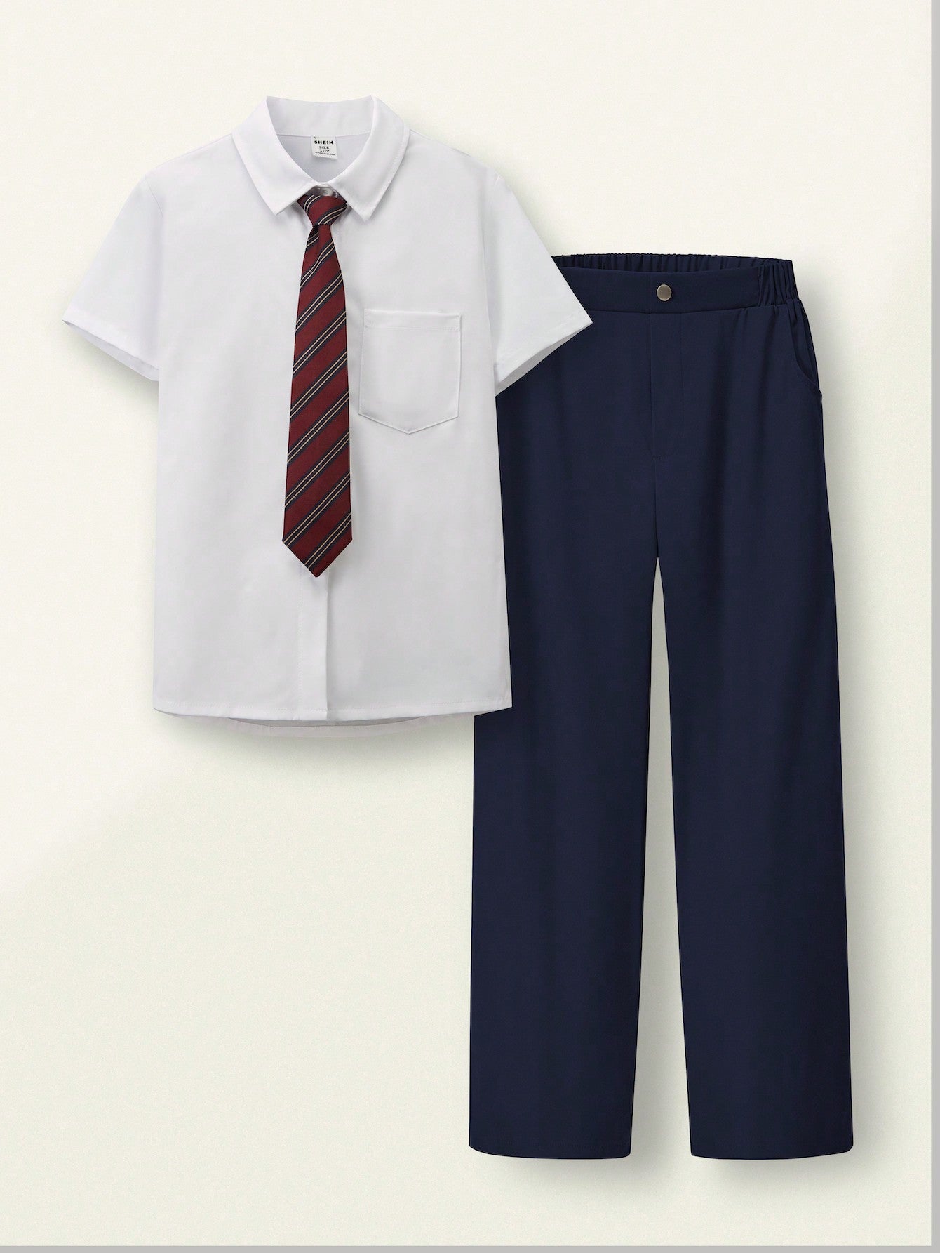 SHEIN 3pcs Boys Collegiate Style School Uniform Set: White Short Sleeve Shirt