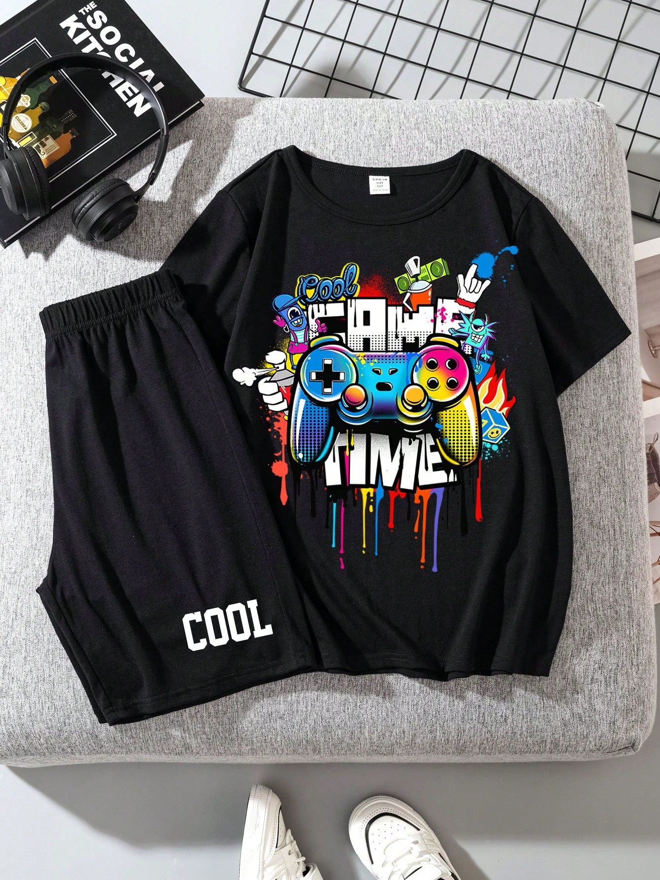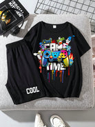 SHEIN Tween Boys' Casual Simple Video Game Controller Printed Short Sleeve T-Shirt And Shorts Set