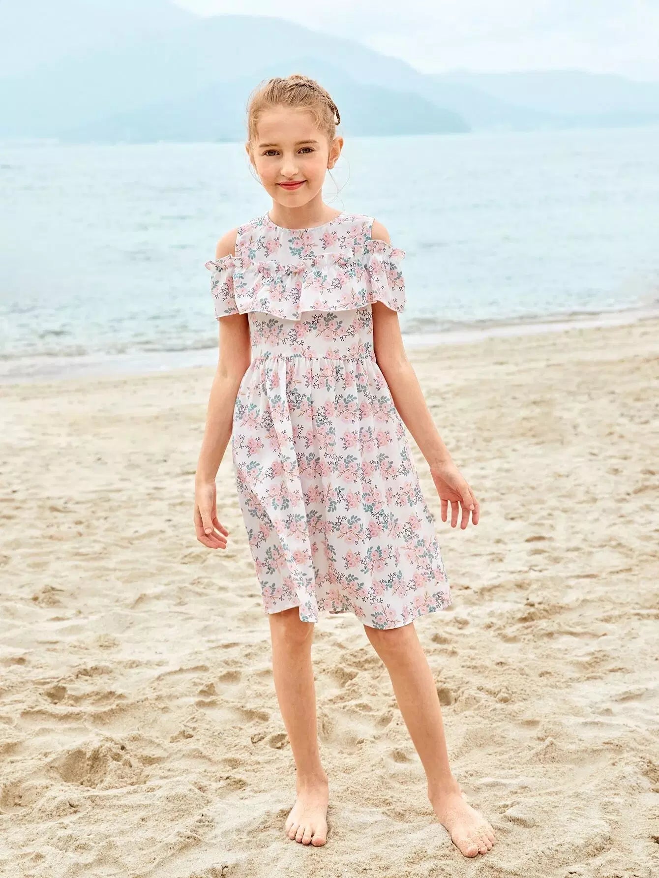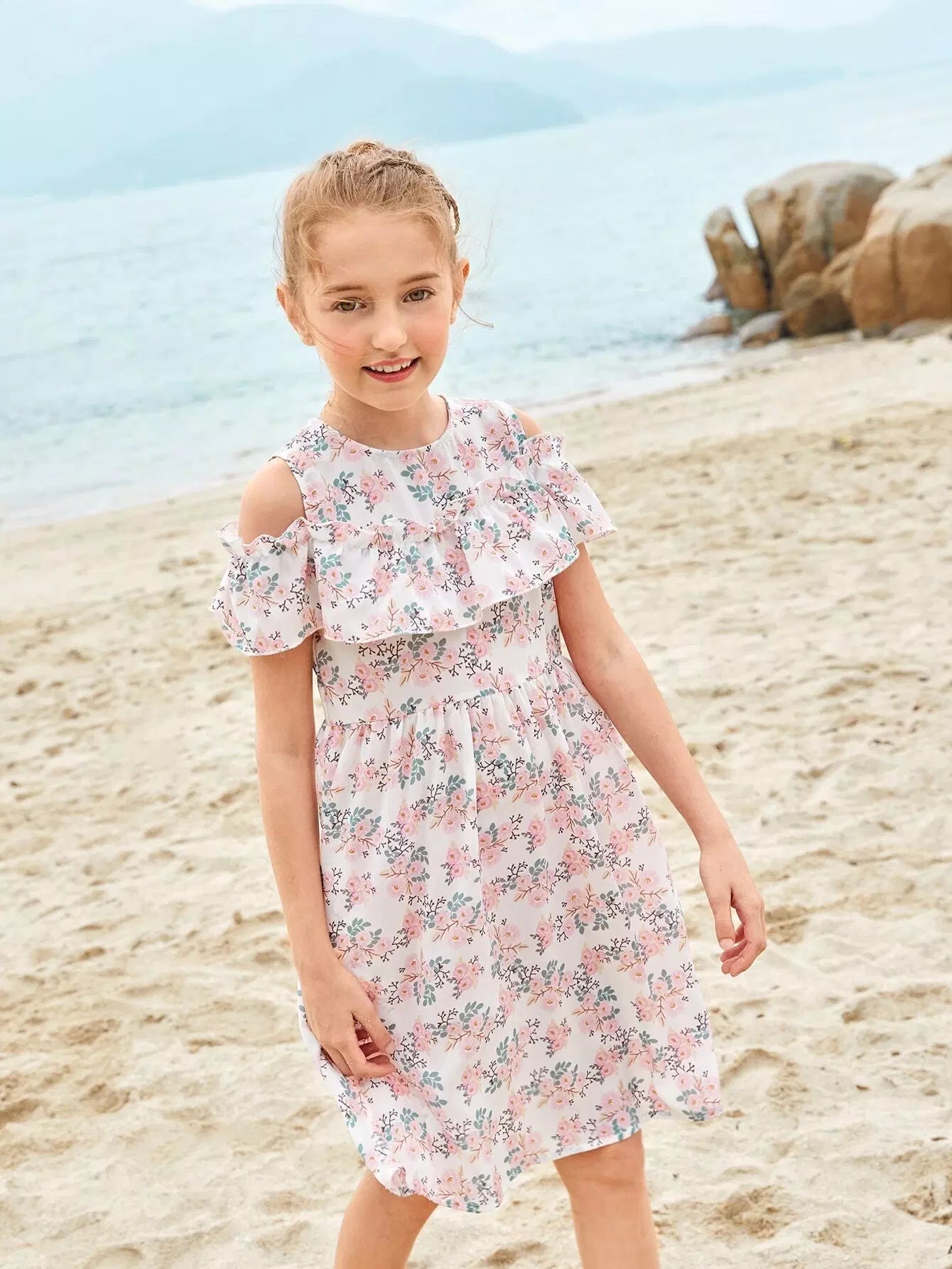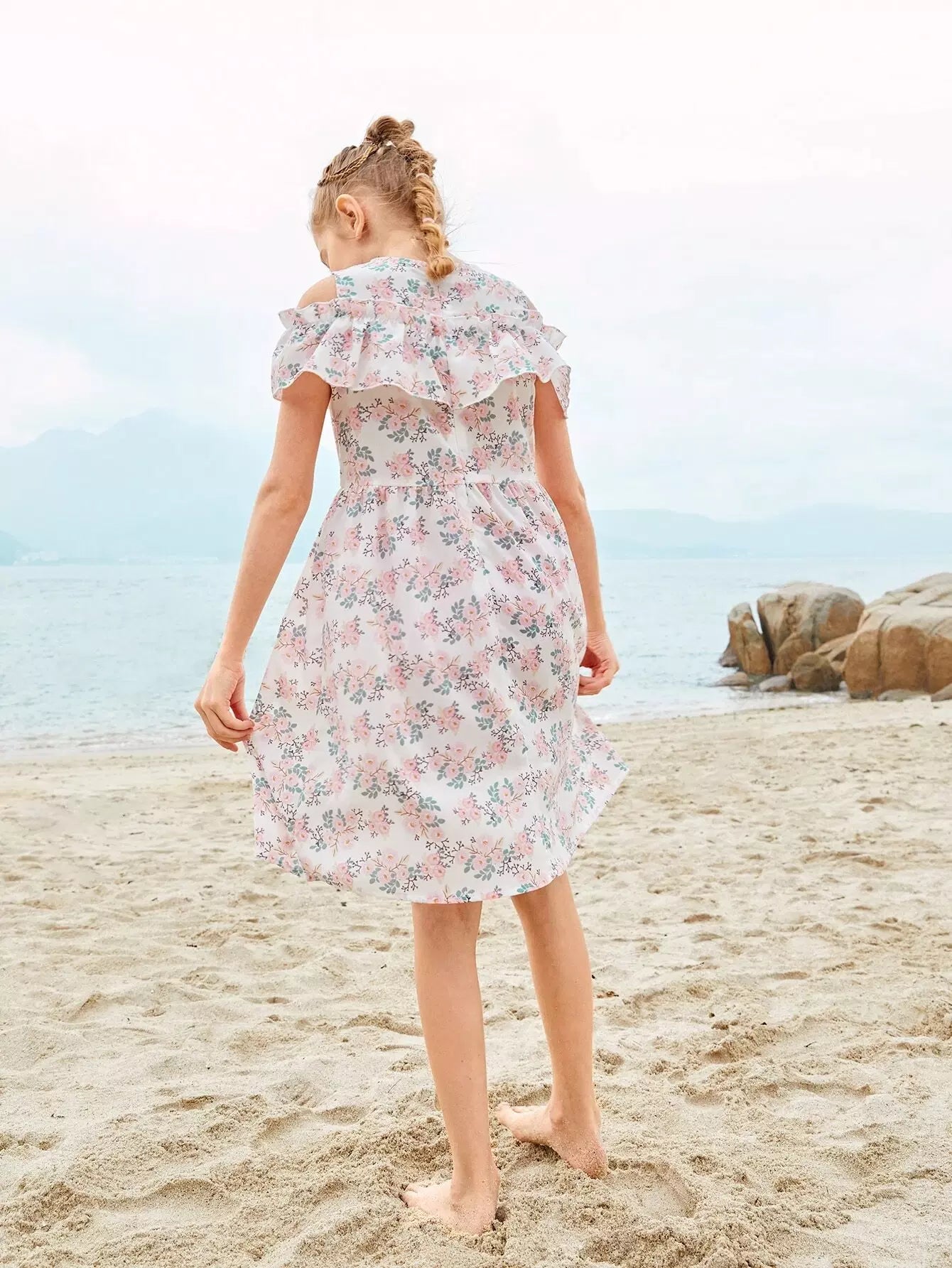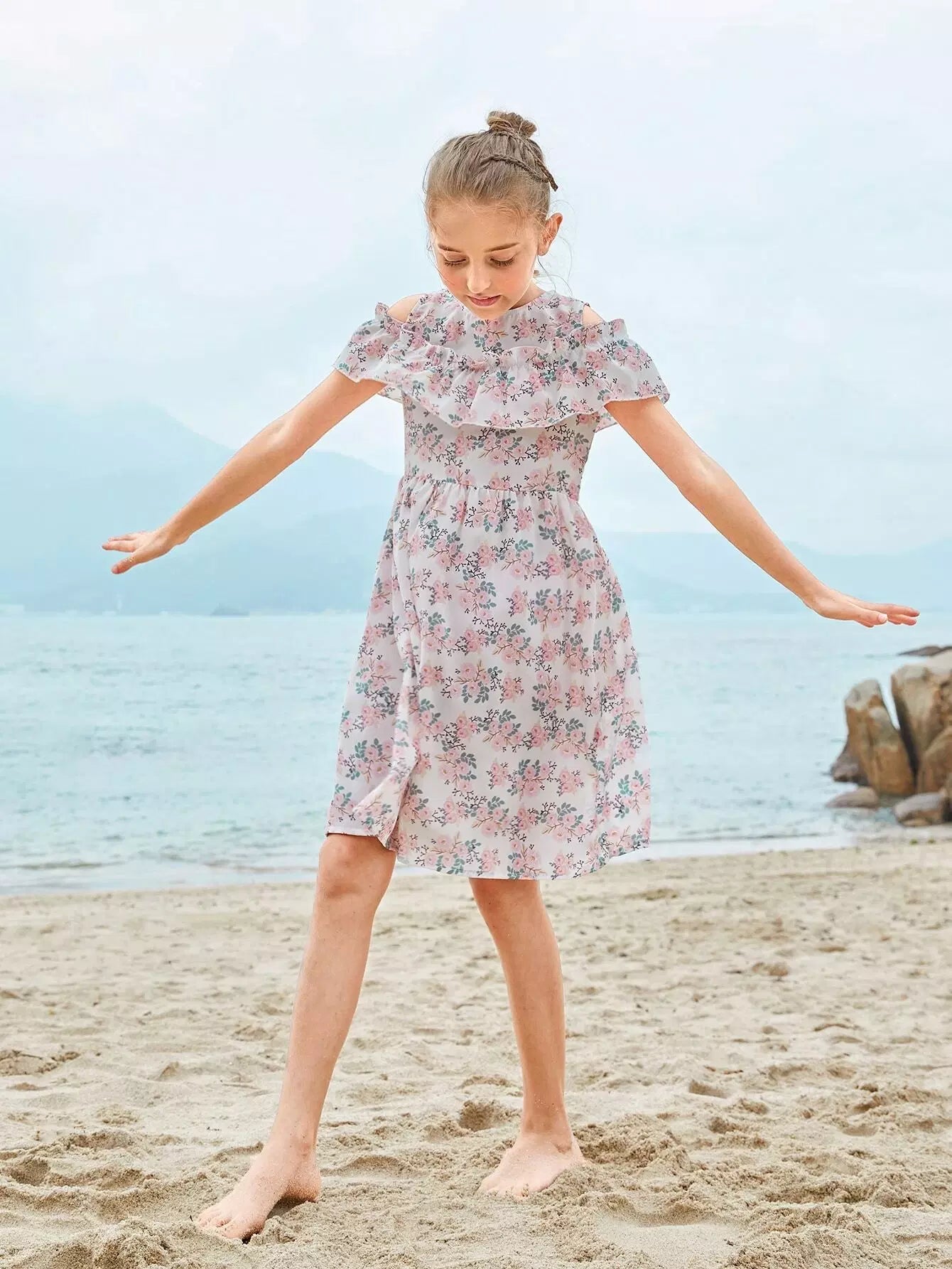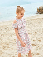 Girls Cold Shoulder Ruffle Trim Ditsy Floral Dress