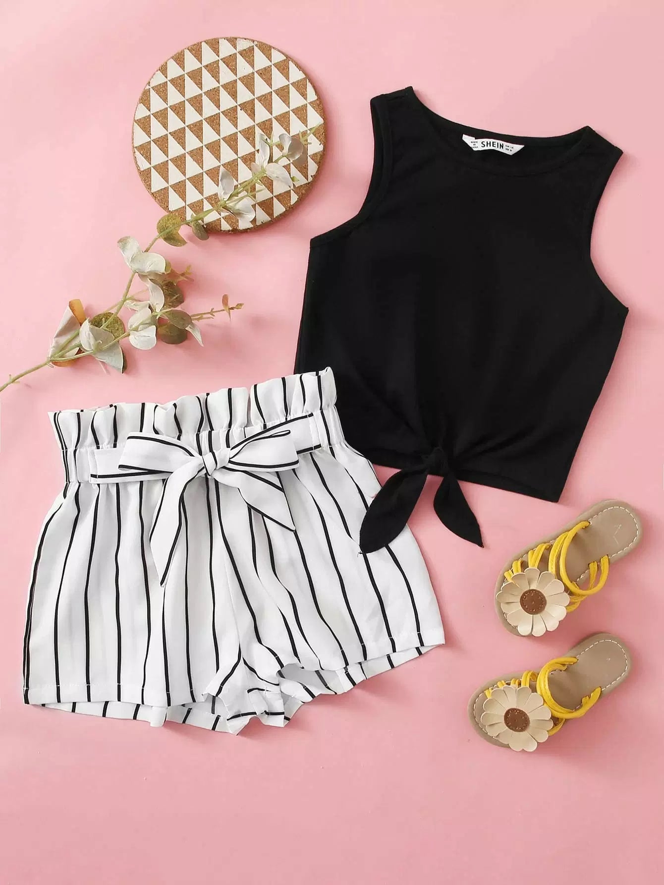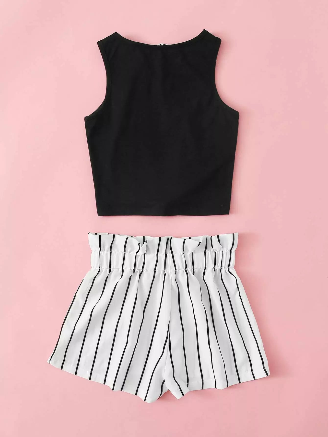 Girls Knot Hem Tank Top & Paperbag Waist Striped Shorts Set
