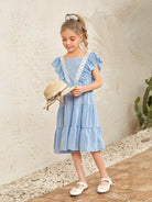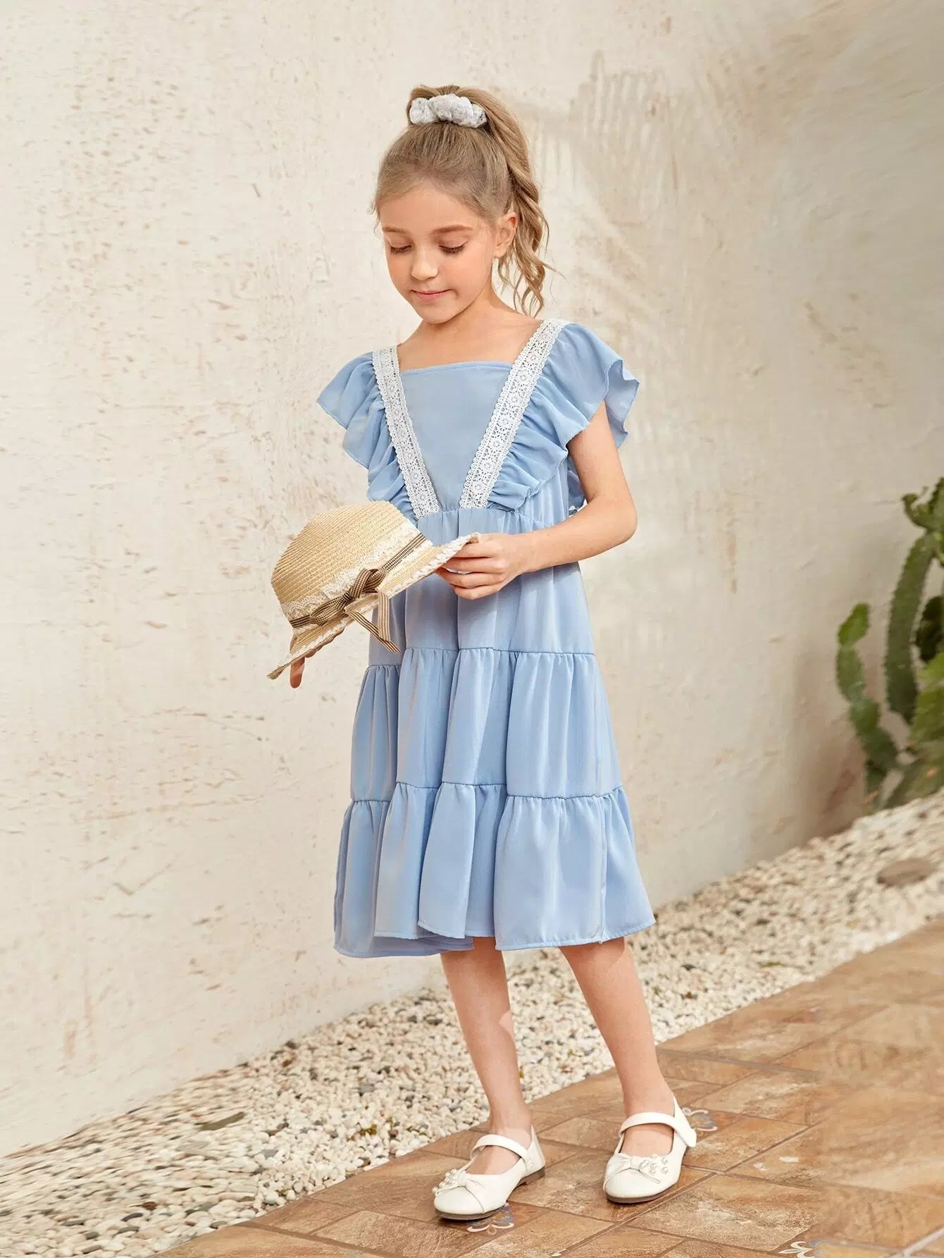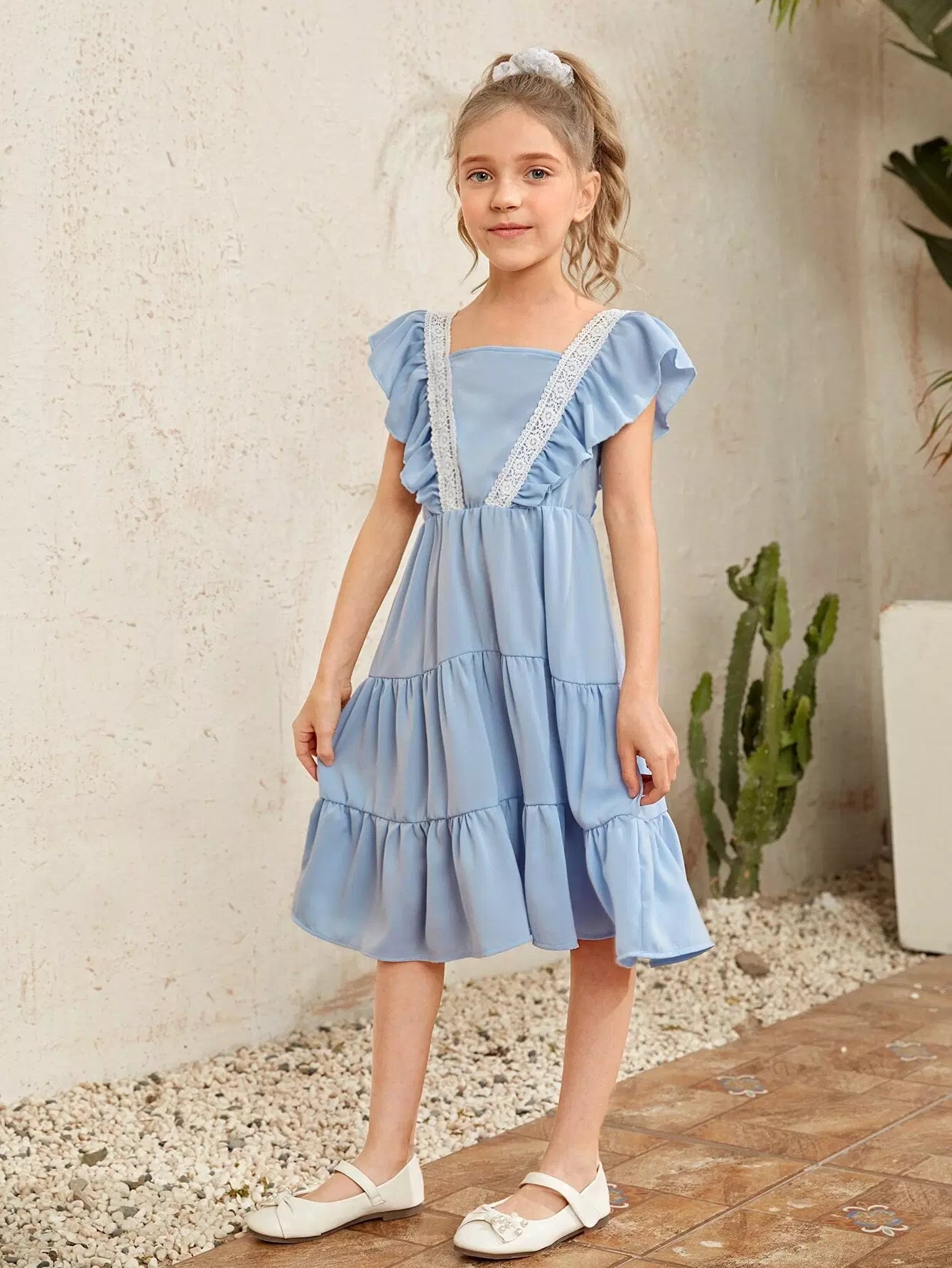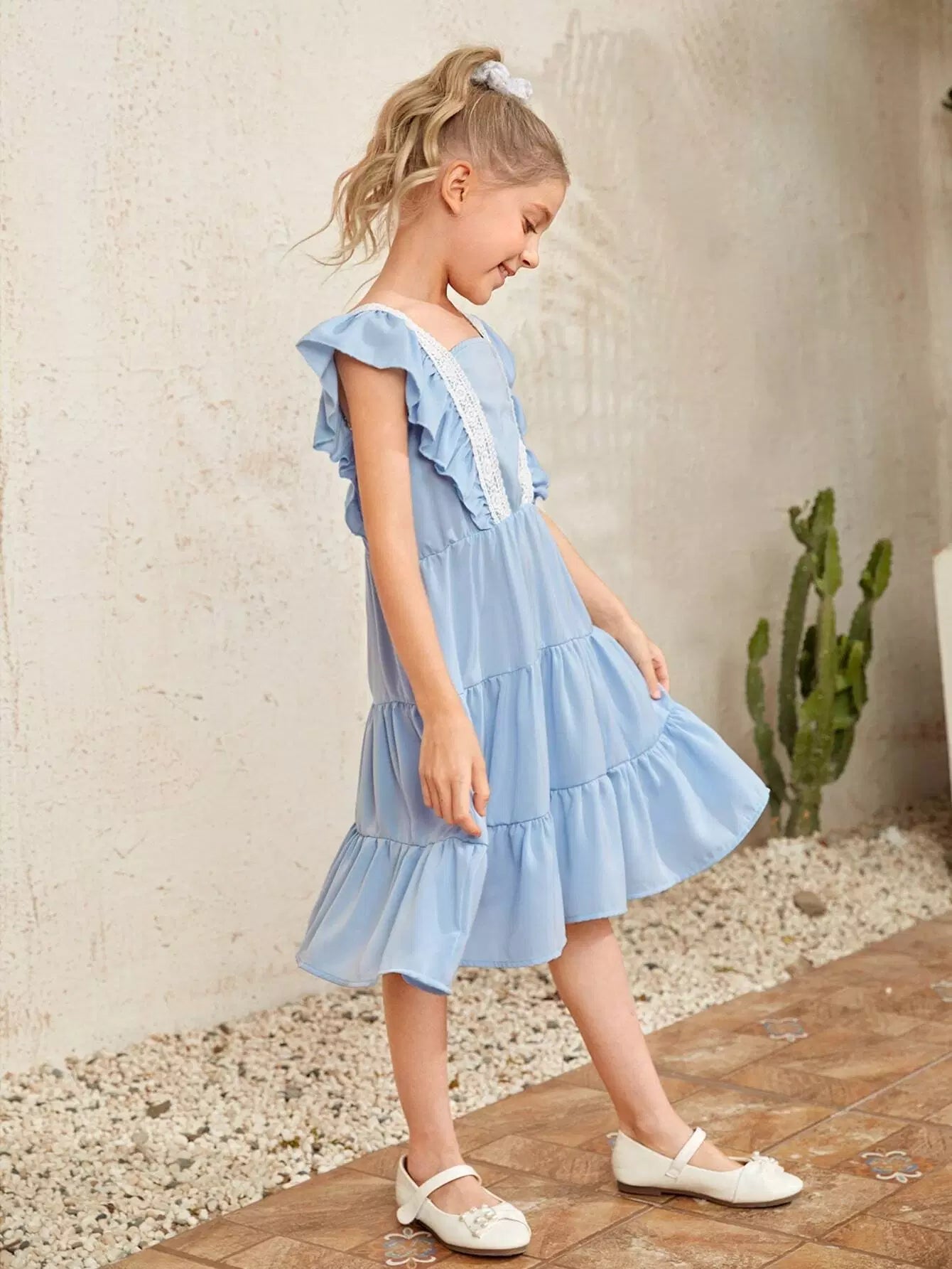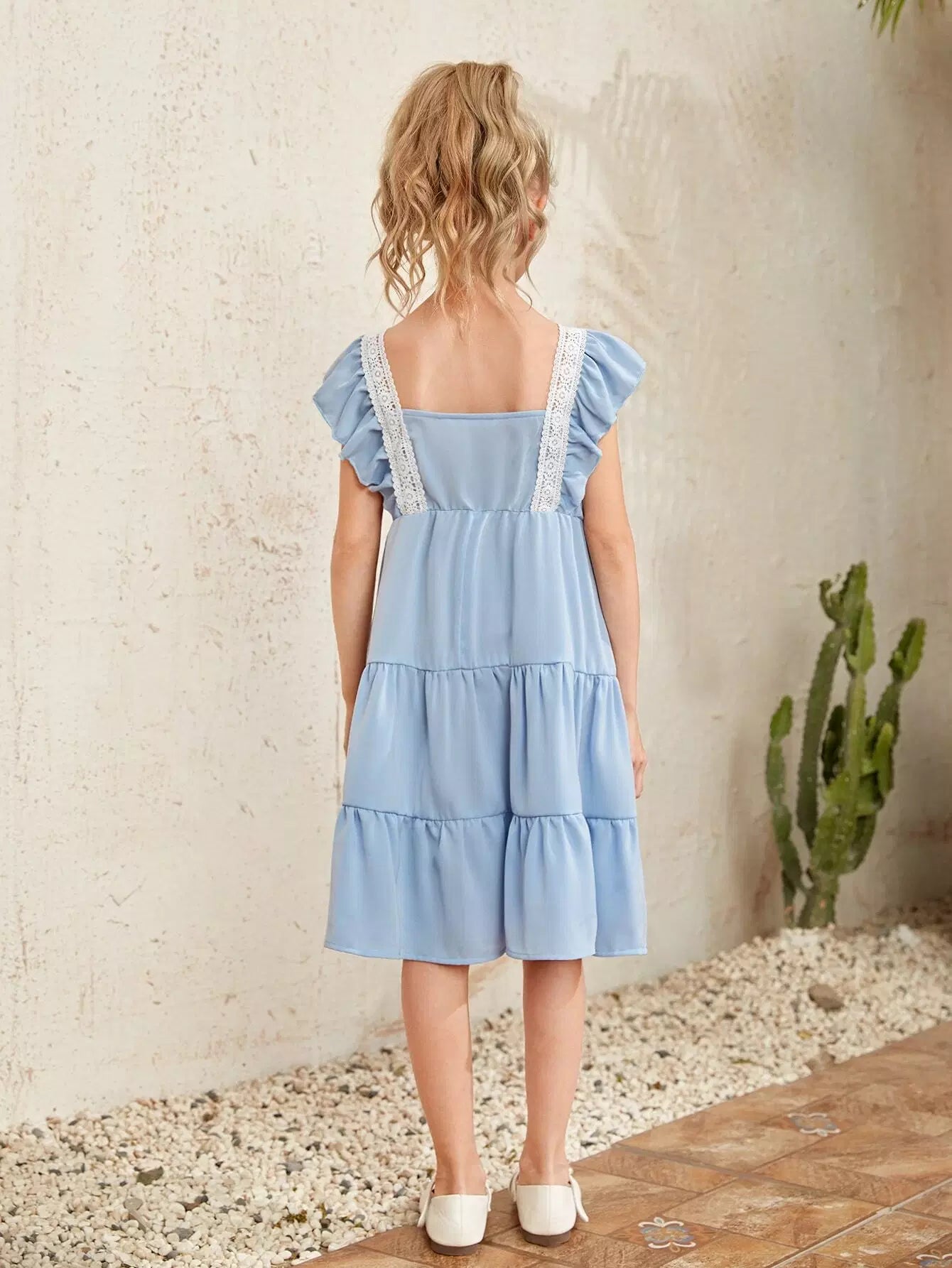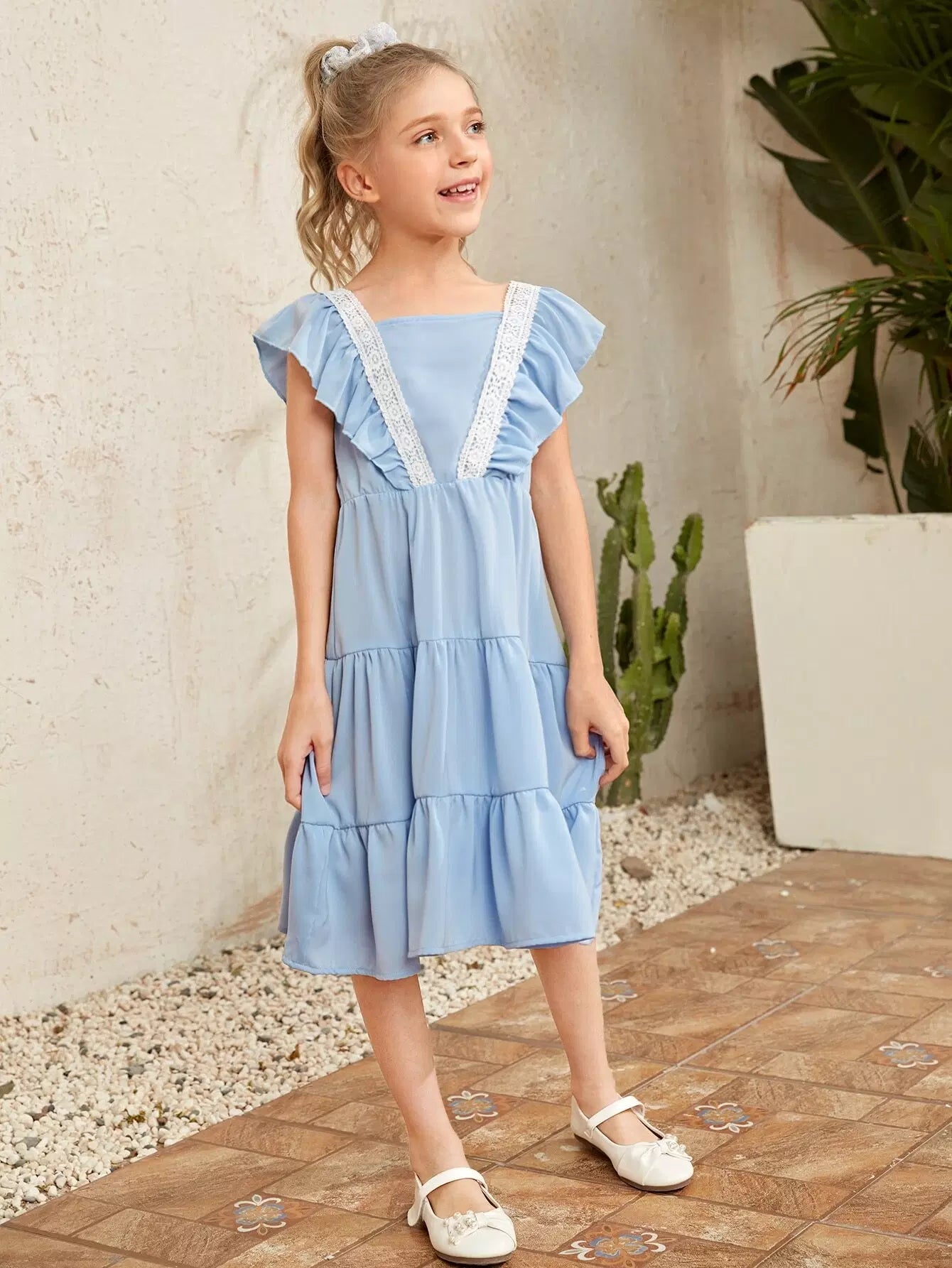 Girls Ruffle Armhole Contrast Lace Detail Tiered Hem Dress