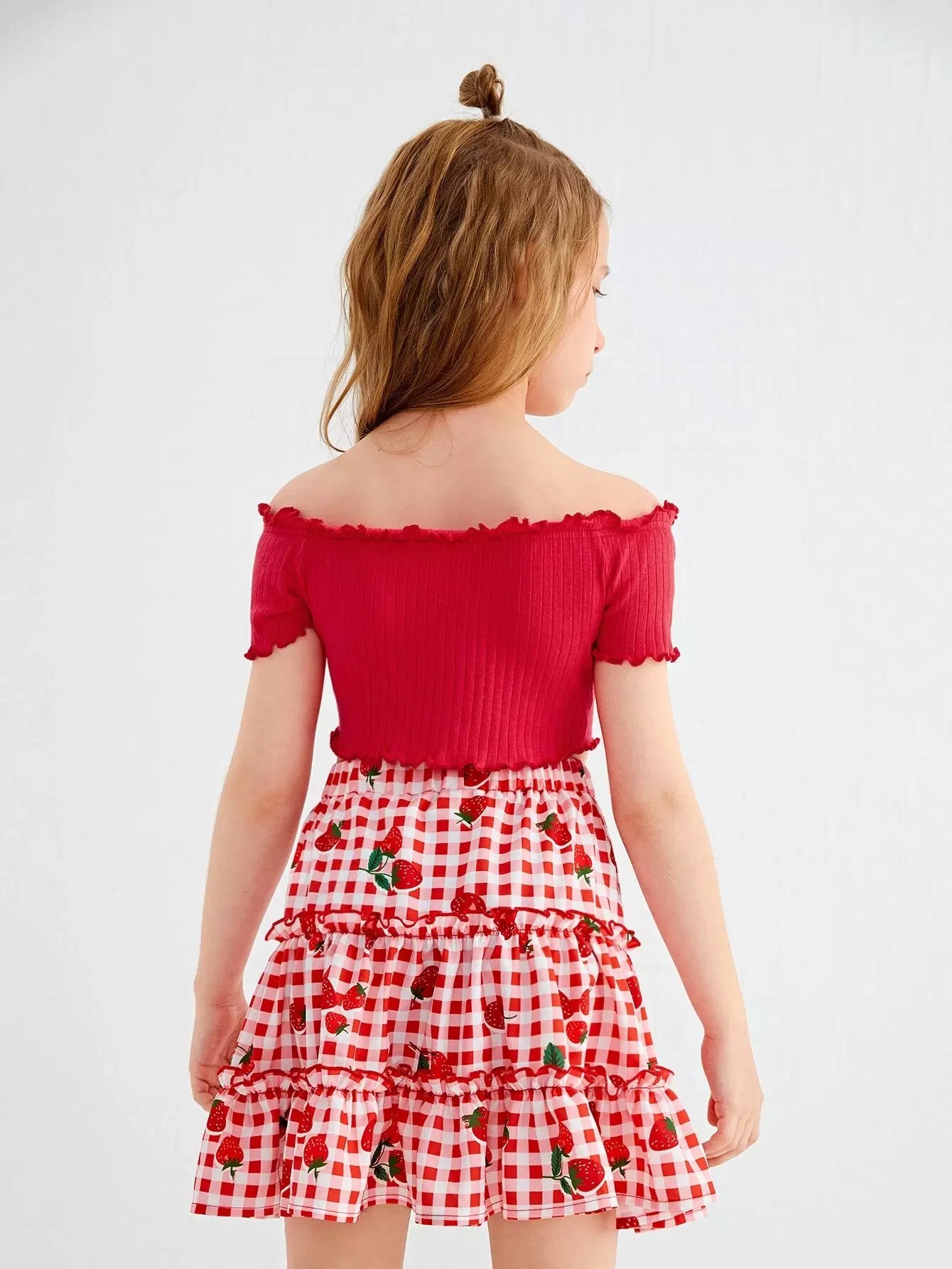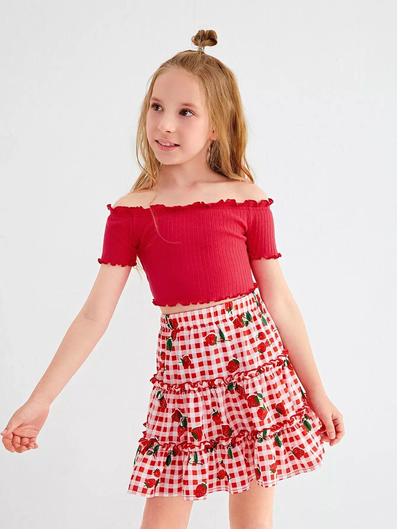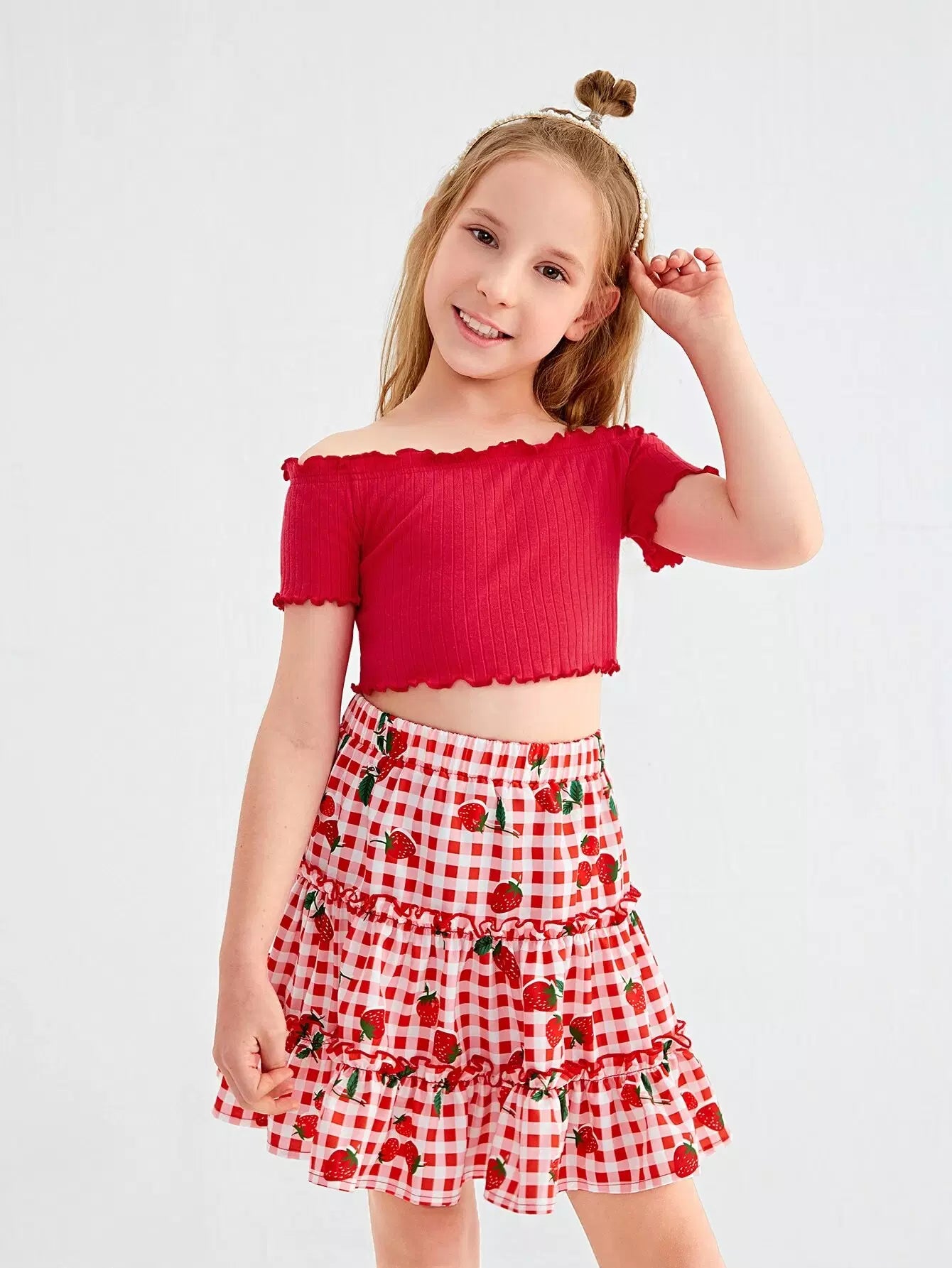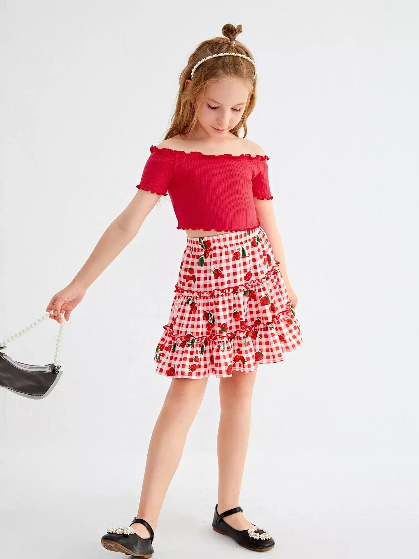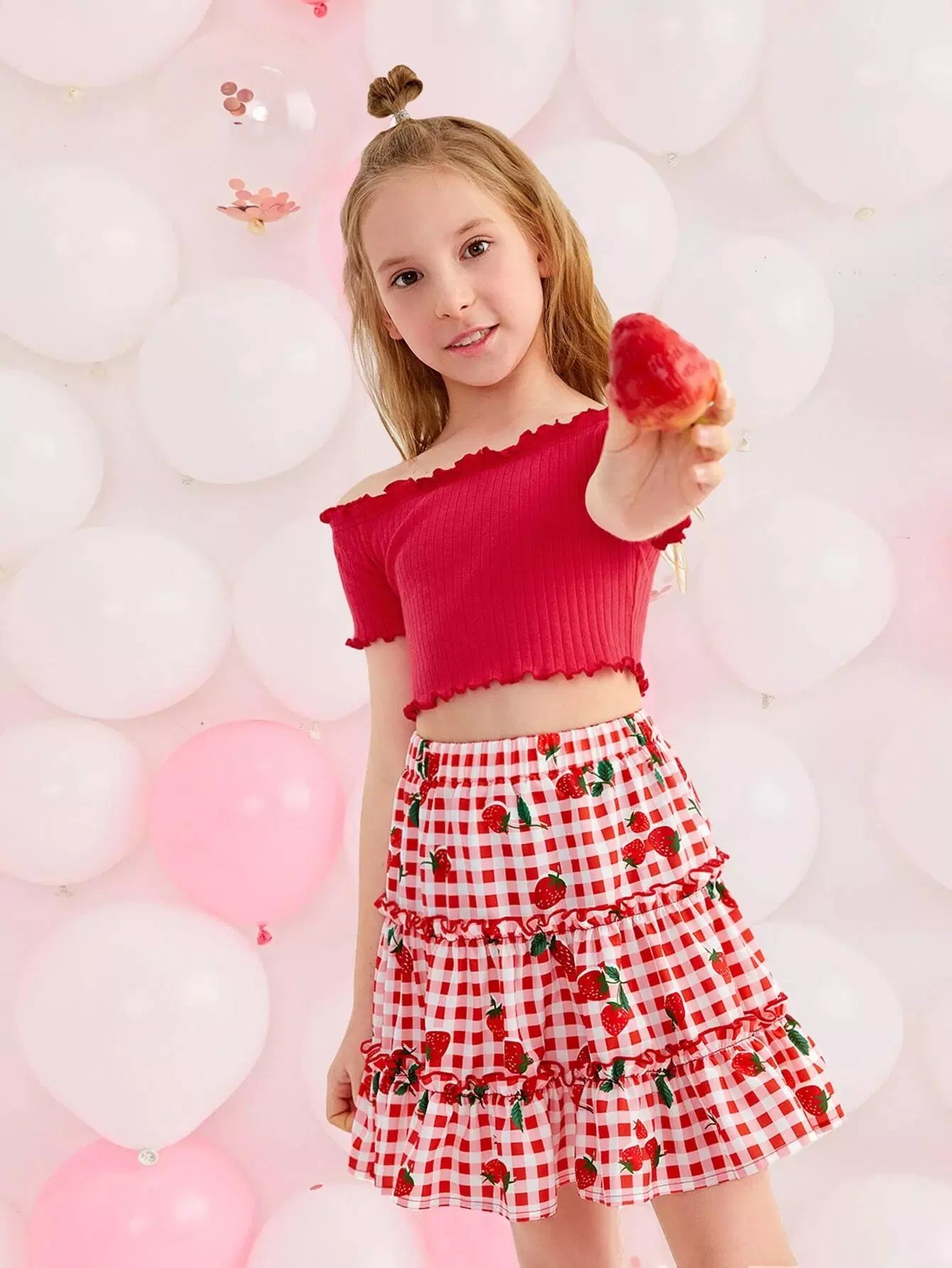 Girls Solid Lettuce Trim Crop Top & Gingham & Strawberry Print Flared Skirt