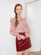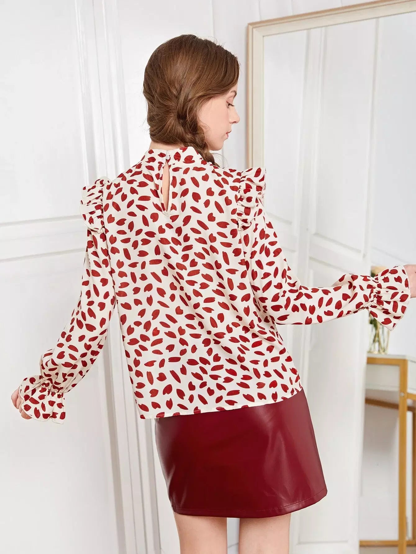 Teen Girls Keyhole Back Allover Print Ruffle Armhole Blouse & PU Leather Skirt