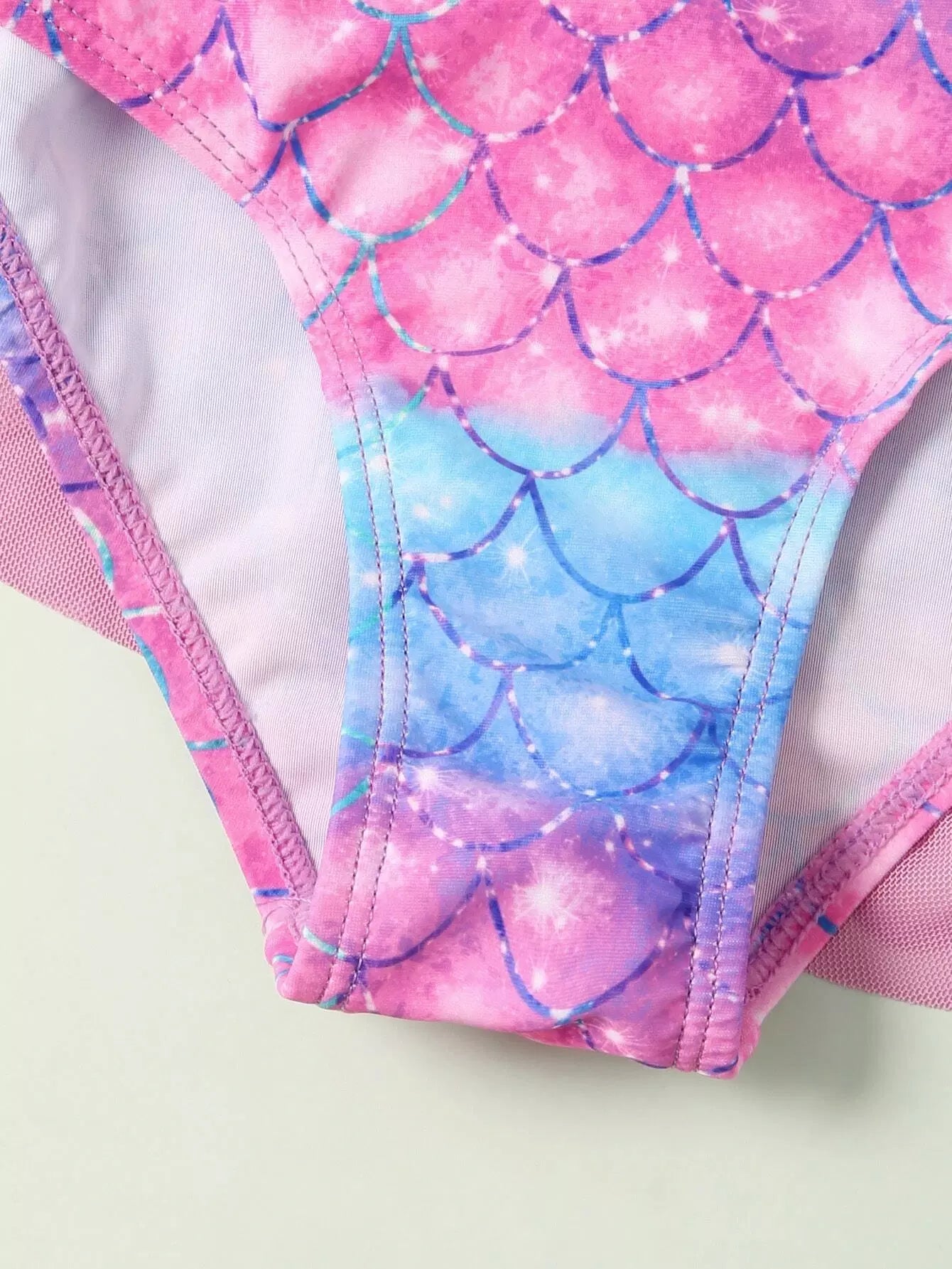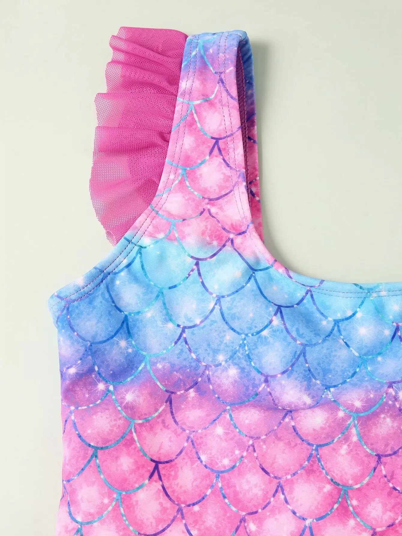 Girls Fish Scale Print Ruffle One Piece Swimsuit
